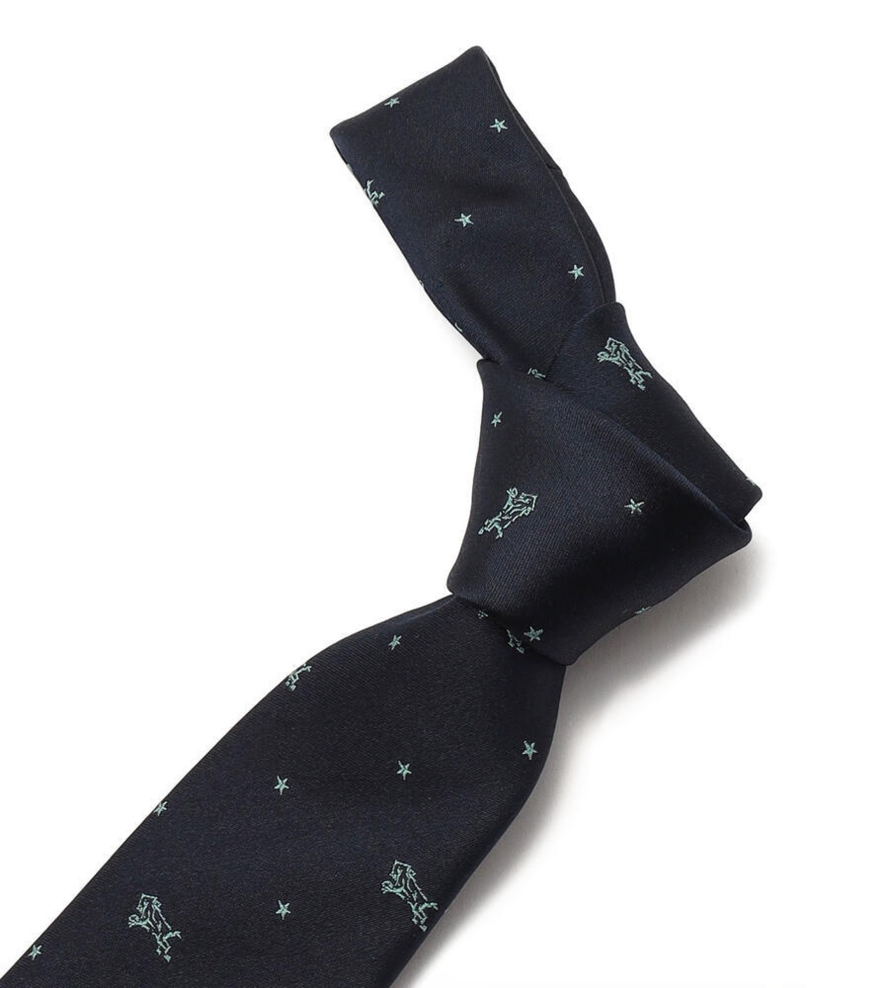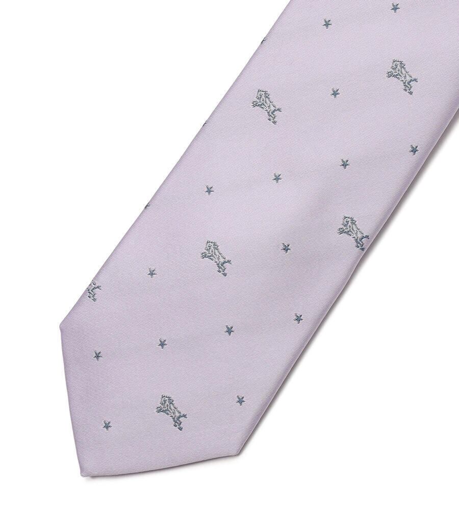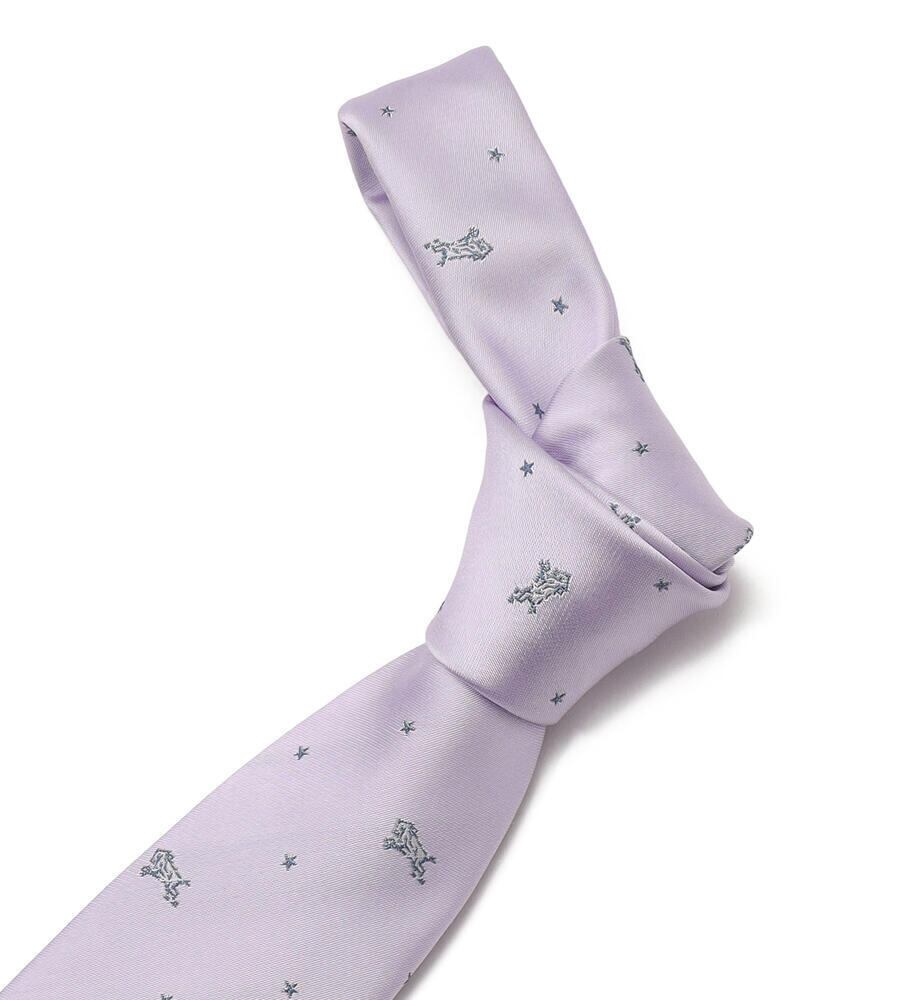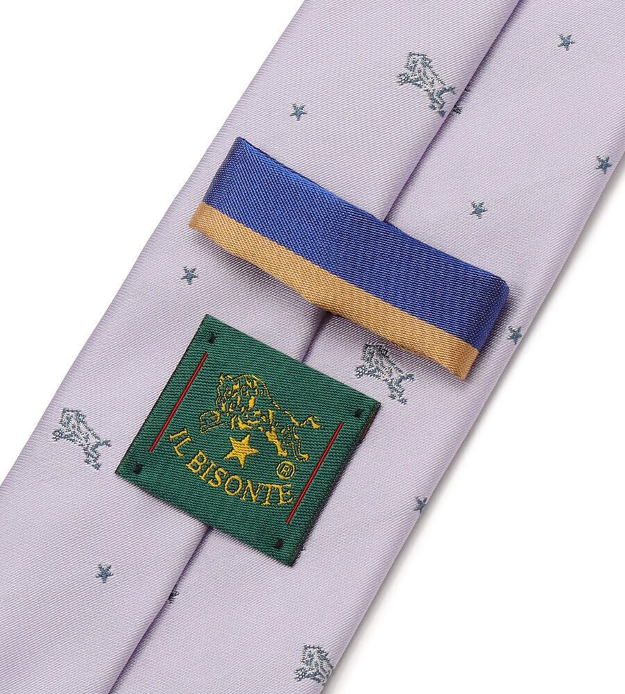 アイコニックなバイソンと星のモチーフをバランス良く配置したネクタイ。剣裏やループはカラフルなストライプをデザインしており、見えない部分にもこだわりを感じます。シンプルな無地のスーツのアクセントにもぴったりです。
