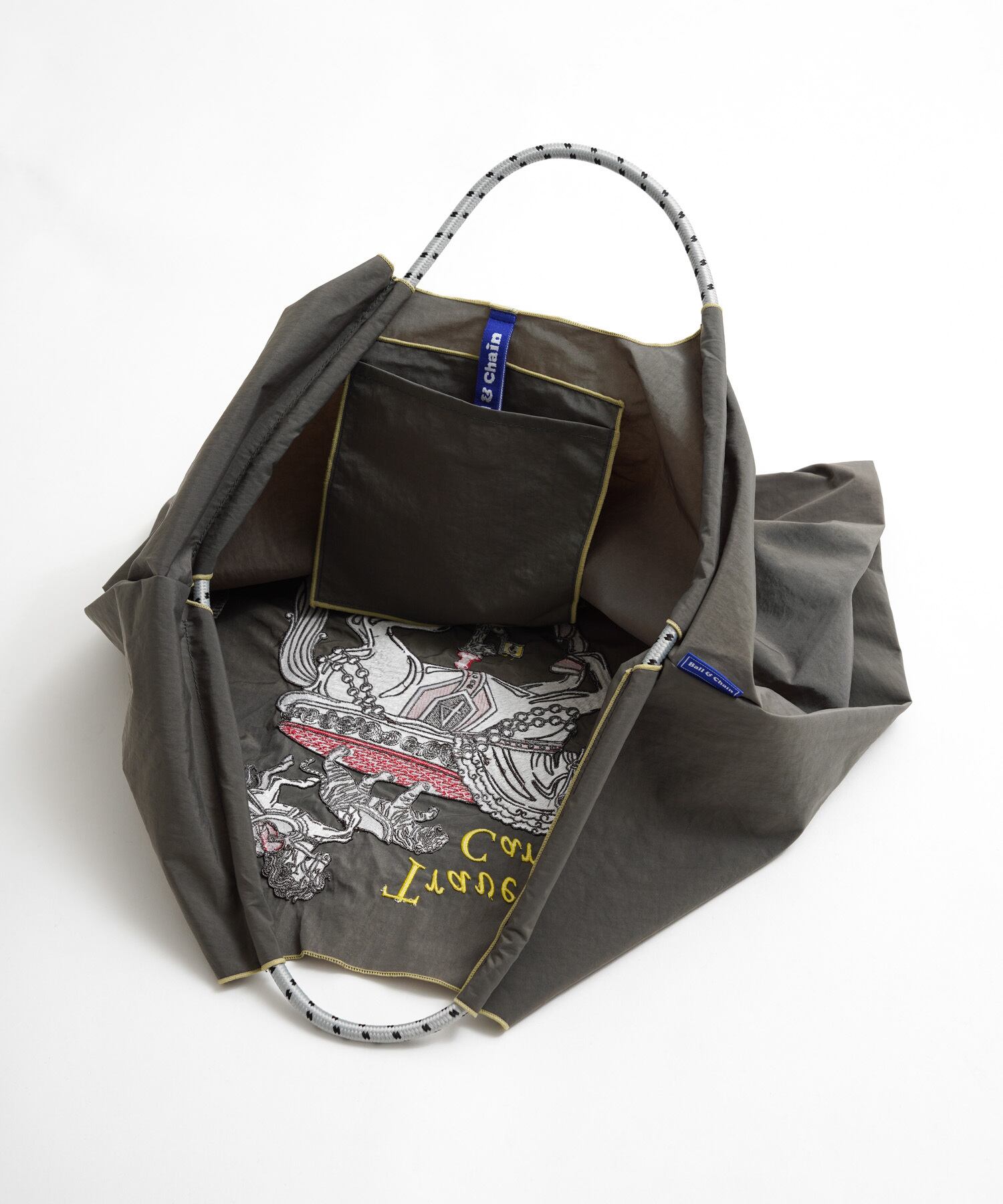 耐久性、撥水性に優れた厚手のポリエステル素材に、グラフィックデザインをそのまま「刺繍」で施すことで、高級感がありデザイン性の高いバッグとなっています。