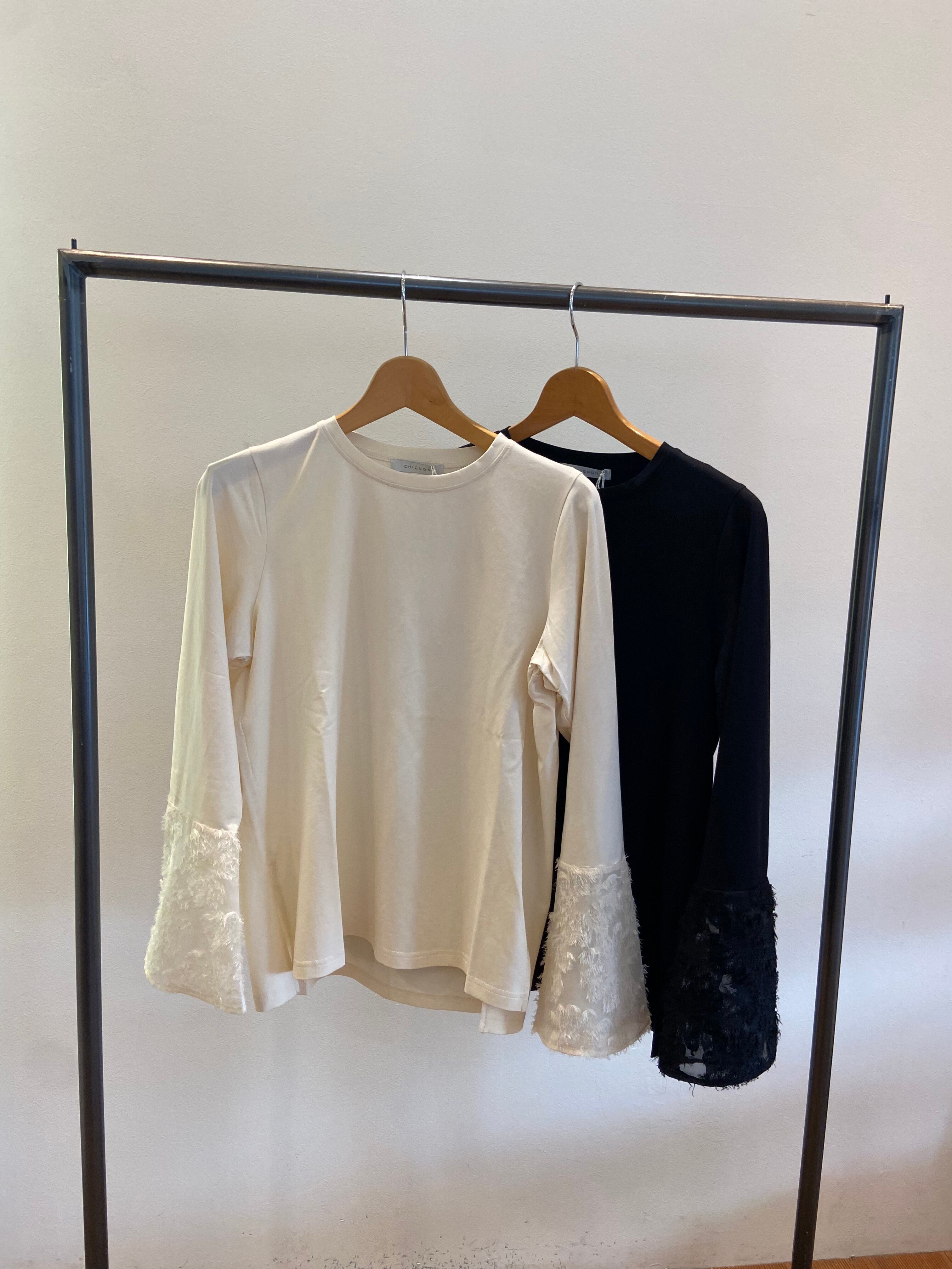 異素材ドッキングのフレアカフスがポイントのデザインカットソーです。