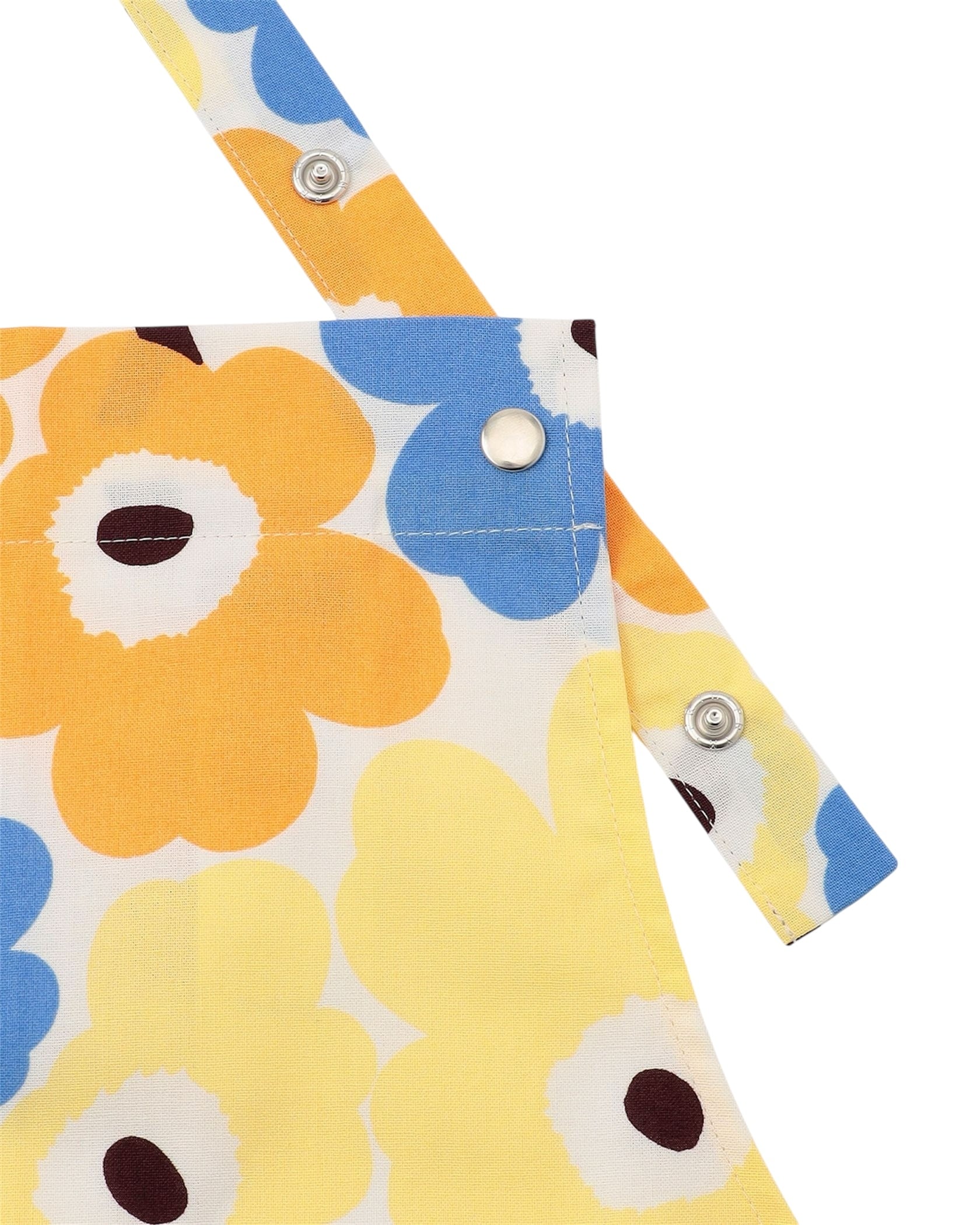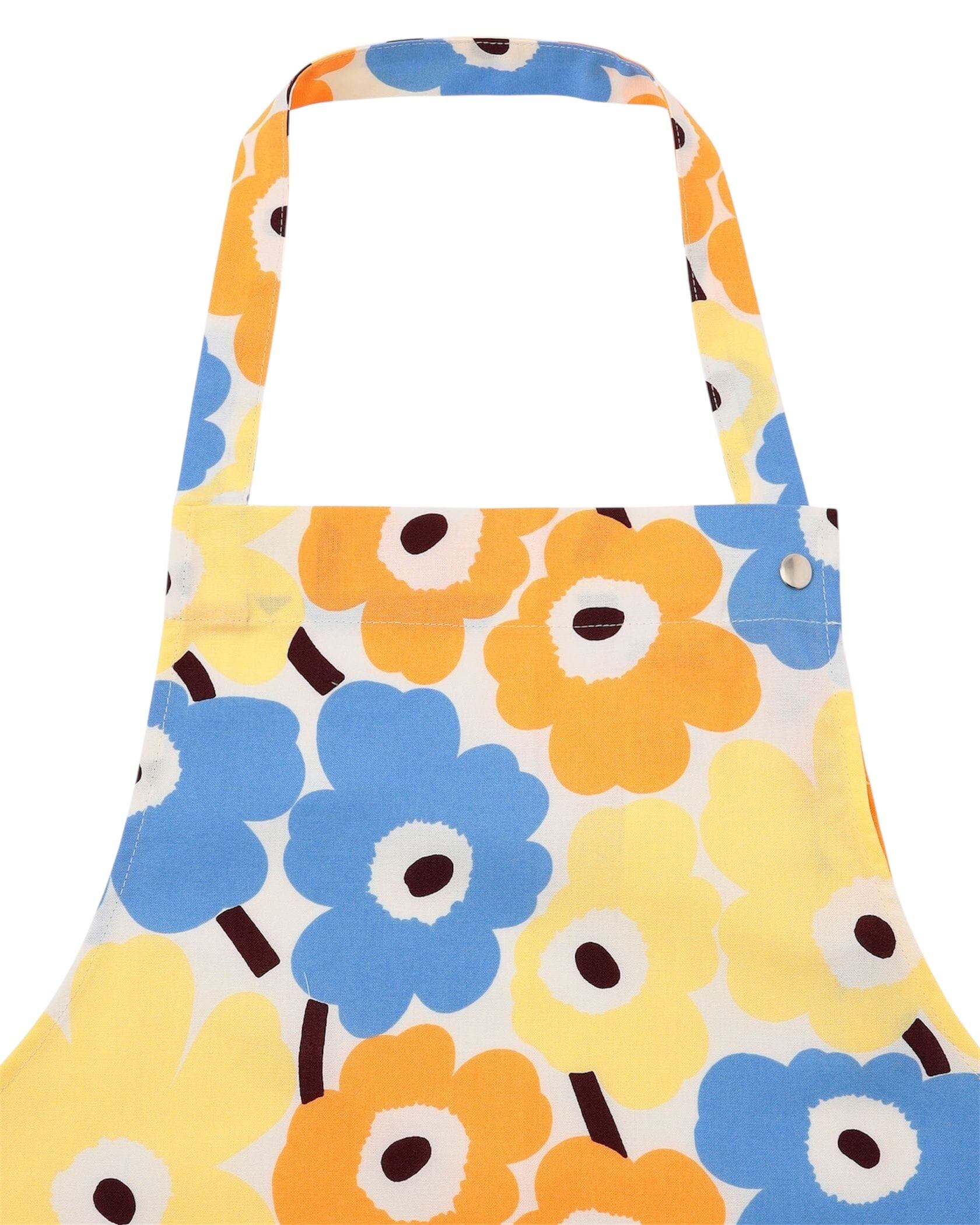 明るく爽やかなカラーリングのUnikko柄のエプロン。ポケットにさりげなくあしらったピスタグがアクセントとして効いています。広い範囲をしっかりとカバーする丈感です。ネックストラップはスナップボタンによって長さの調節できます。ナチュラル感あふれるコットン100%素材です。ギフトとしても喜ばれます。
