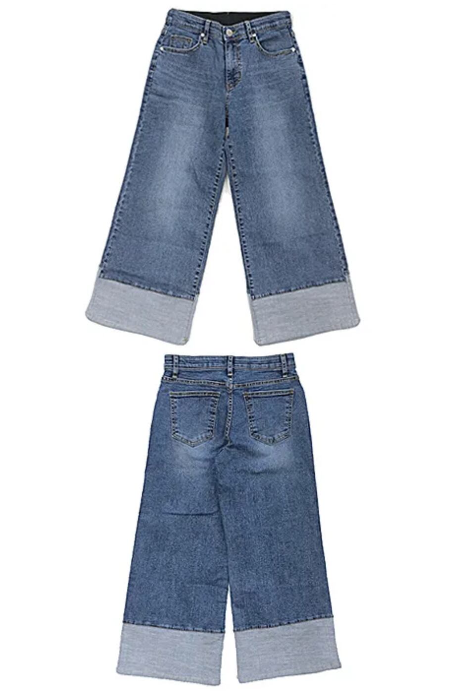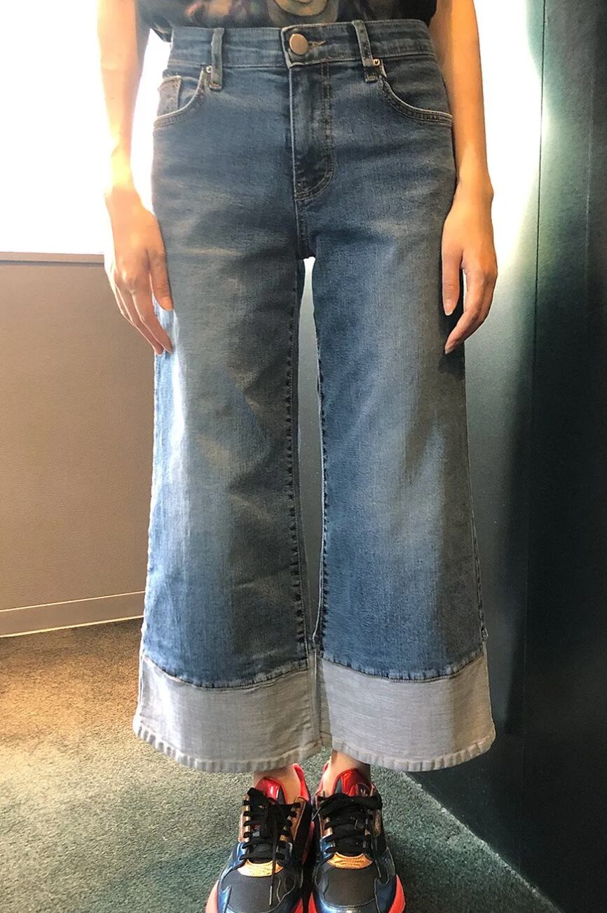 はっきりした広がりと裾の切替が特徴のバギーフレアパンツです。