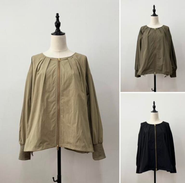 ネックラインと袖部分がタック仕様になっており、立体感とメンズライクなジャケットの中に女性らしいディディールが融合されたジャケットです。