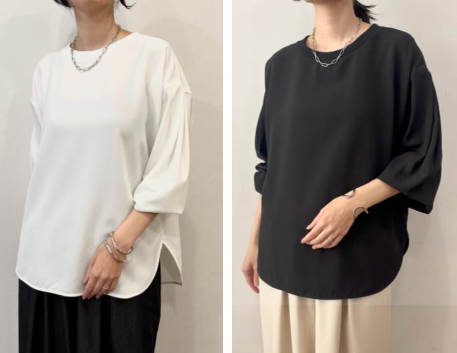 首周りと袖口には編立てのリブを使用しており、布常なのにカットソーのように着脱が簡単なのが魅力的です。袖部分にはタックを取ってあり、たくし上げると袖にボリュームがプラスされます。
