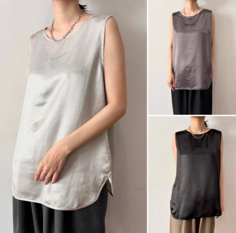 程よい光沢感が上品なサテン素材を使用したサテンタンクトップ。