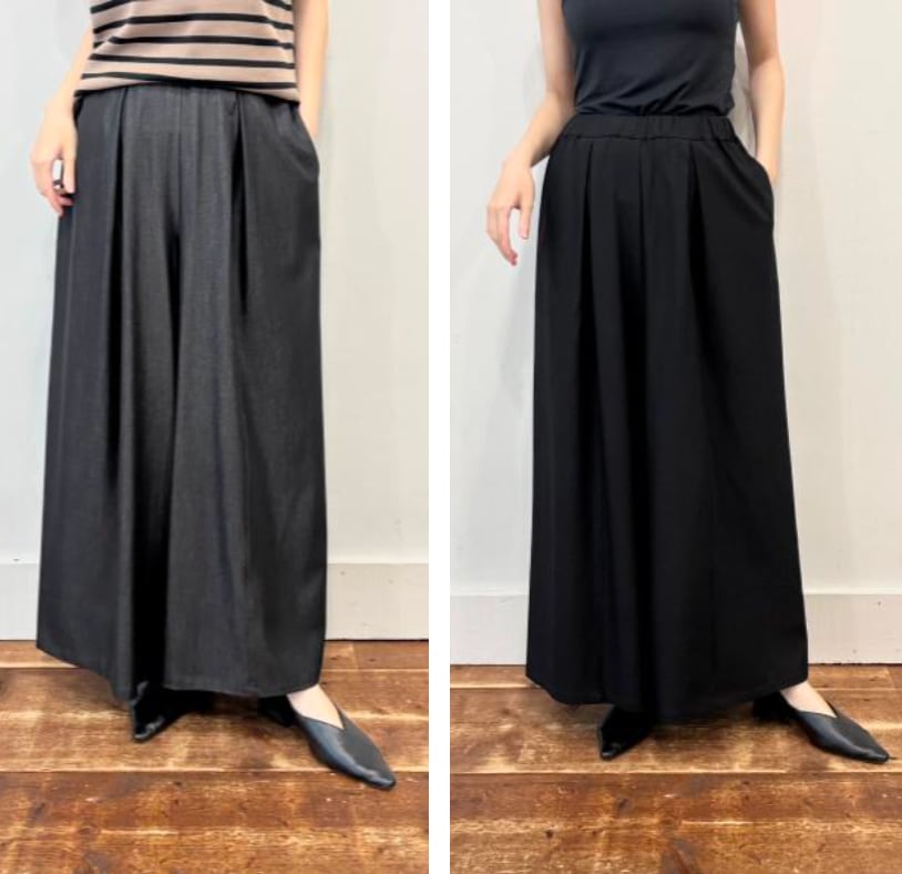 ゆったりと脚のラインを拾わず、ウエストはぐるりゴム、紐入りで履き心地は抜群です。