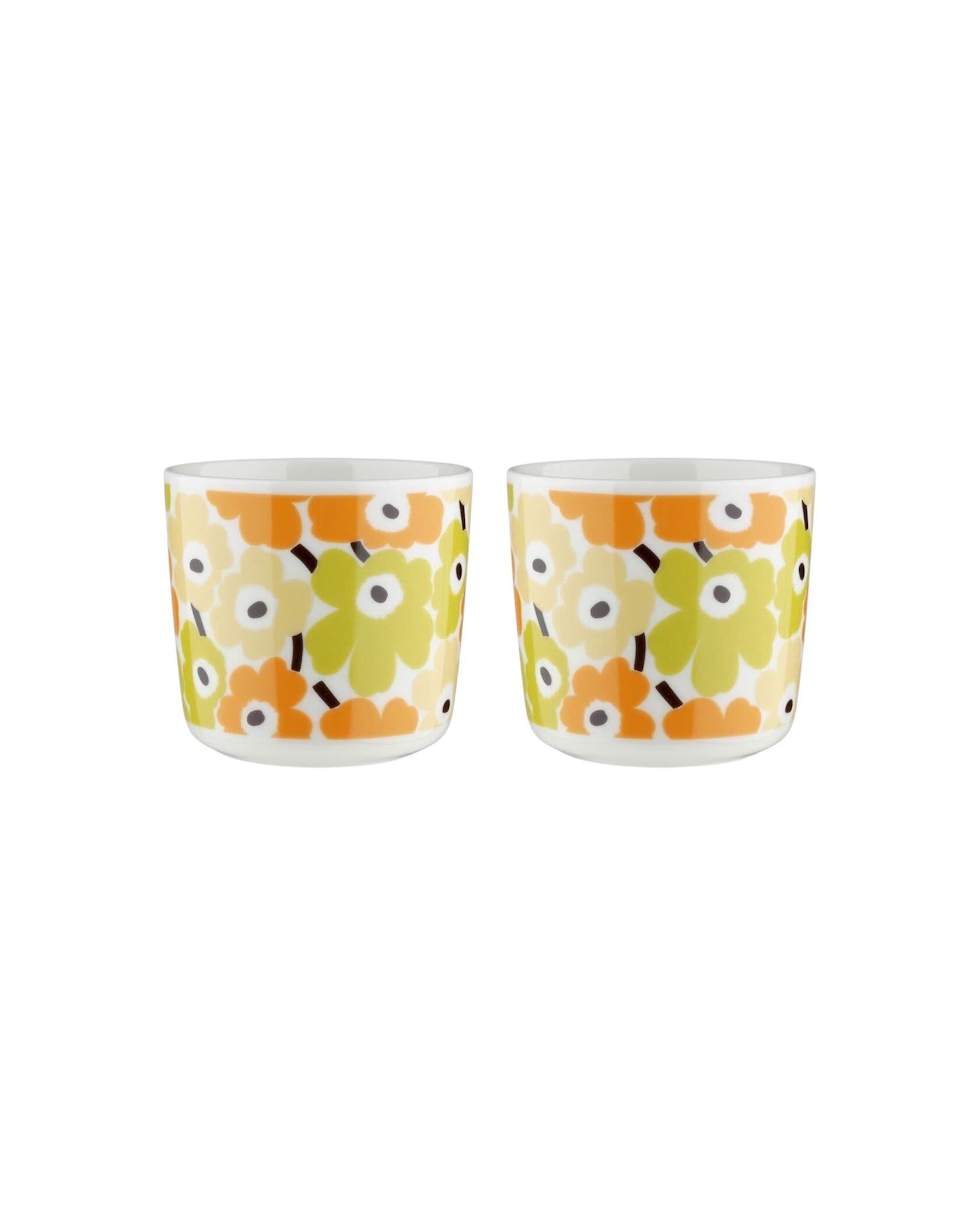 ライトグリーンやライトイエローで華やかに仕上げたUnikko柄のコーヒーカップセット。