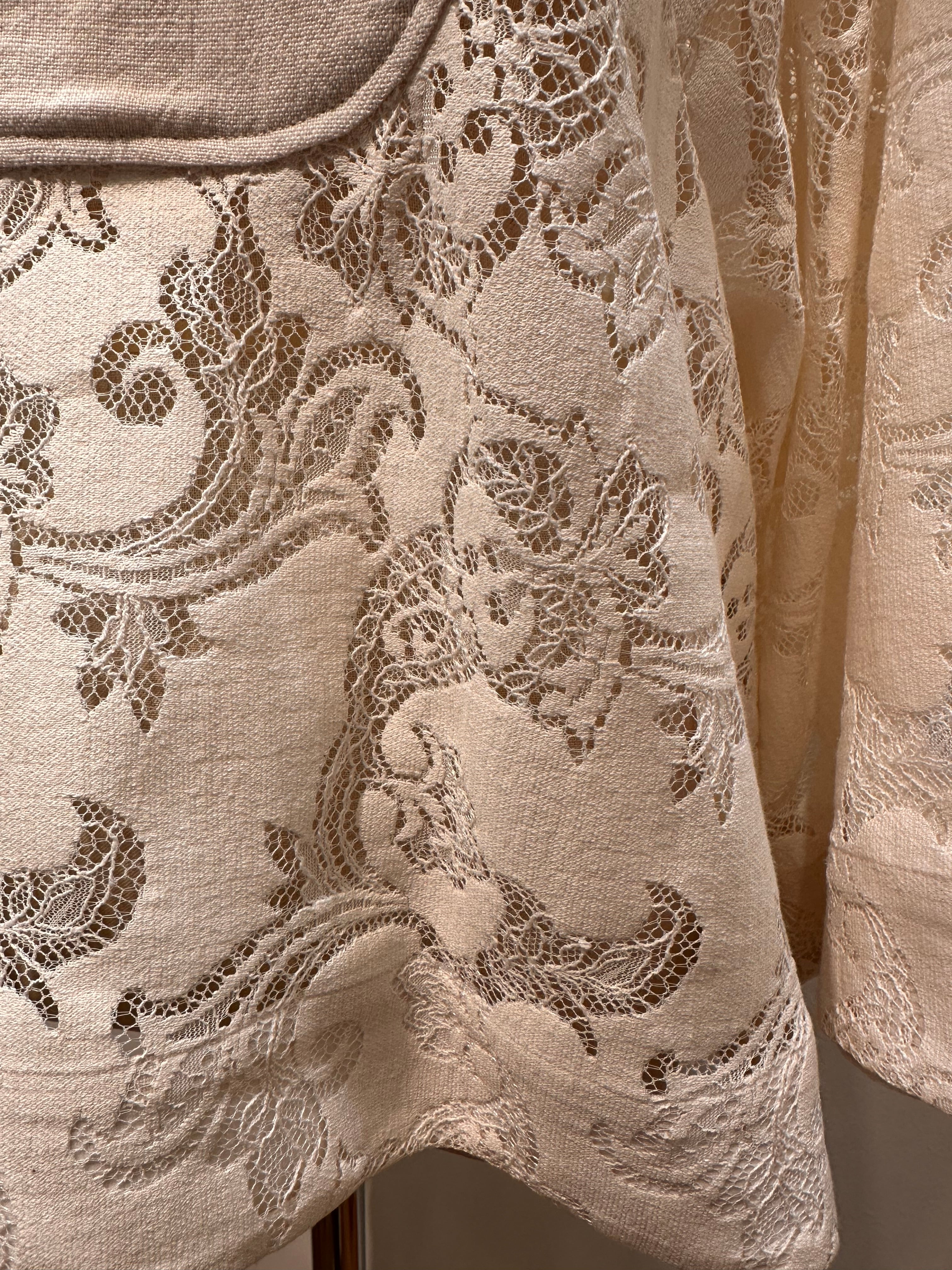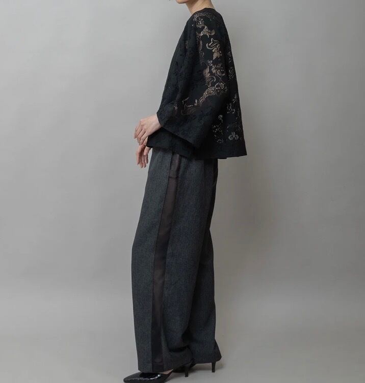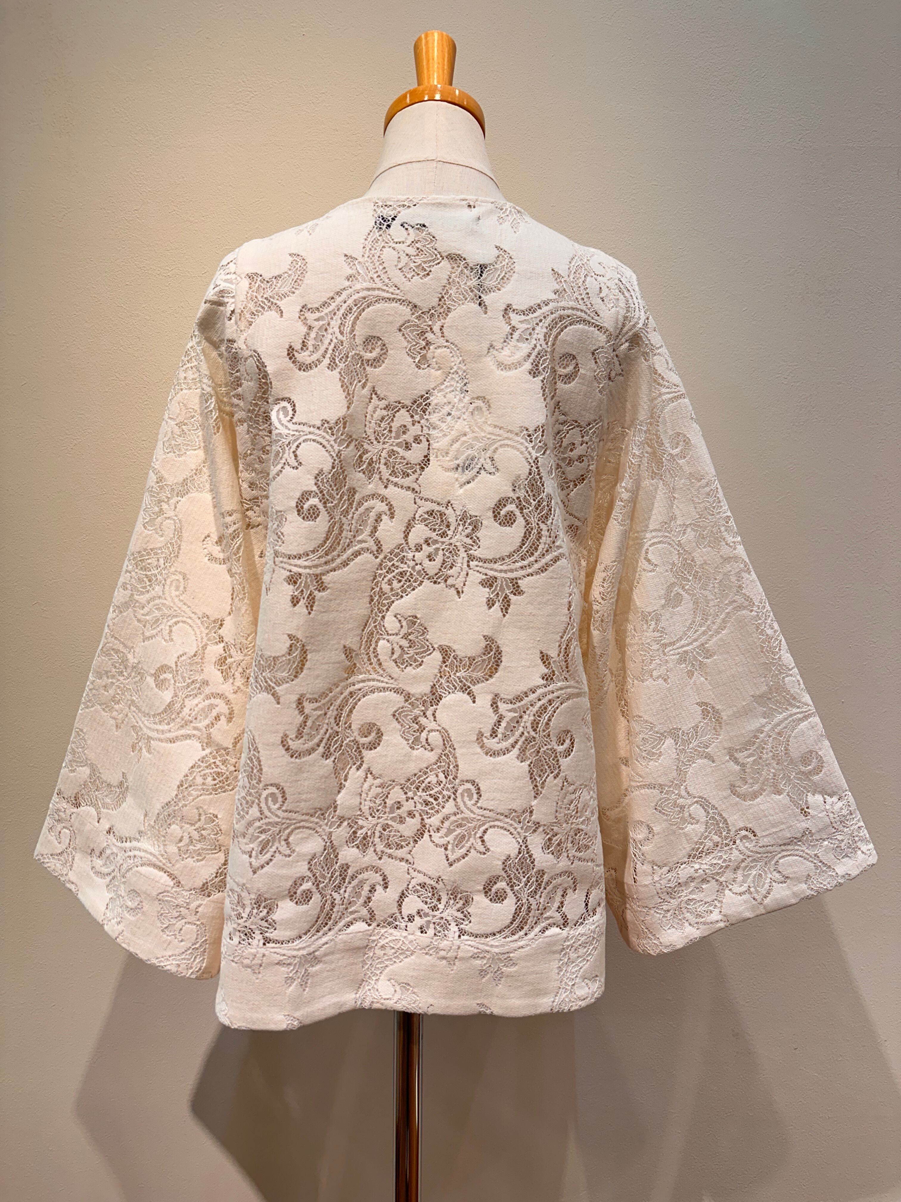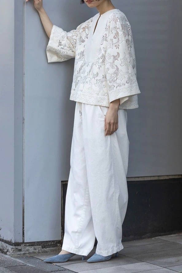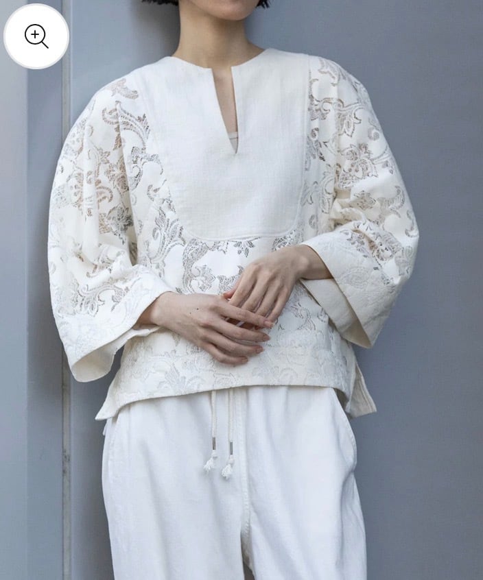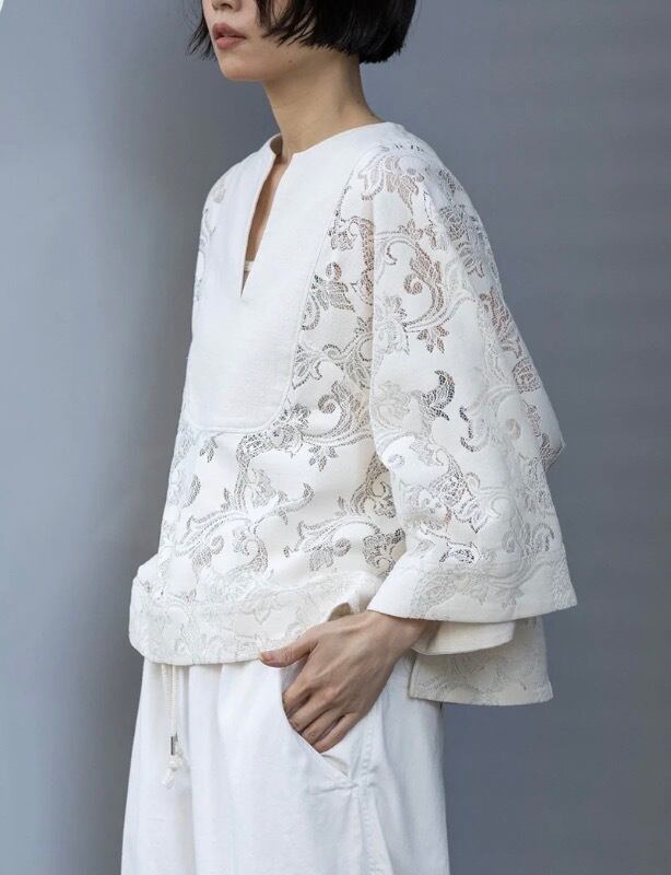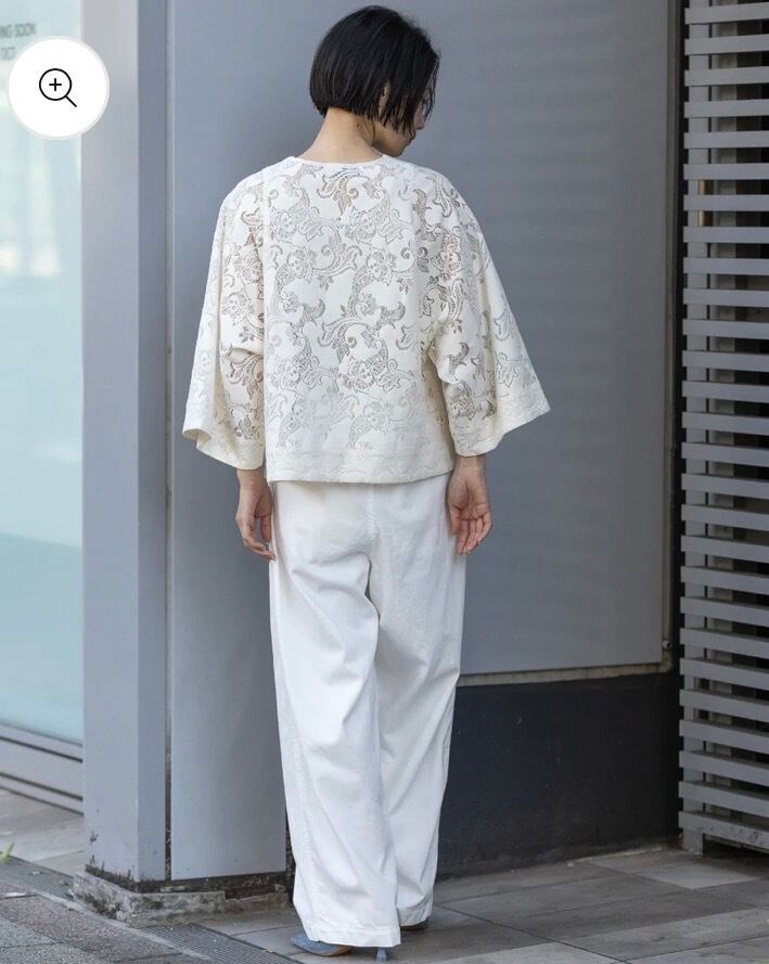 ざっくりとしたコットンベースに、ボタニカルテイストのレース柄が施され、カジュアルさと繊細な雰囲気を兼ね備えた大人が取り入れやすいレース素材です。