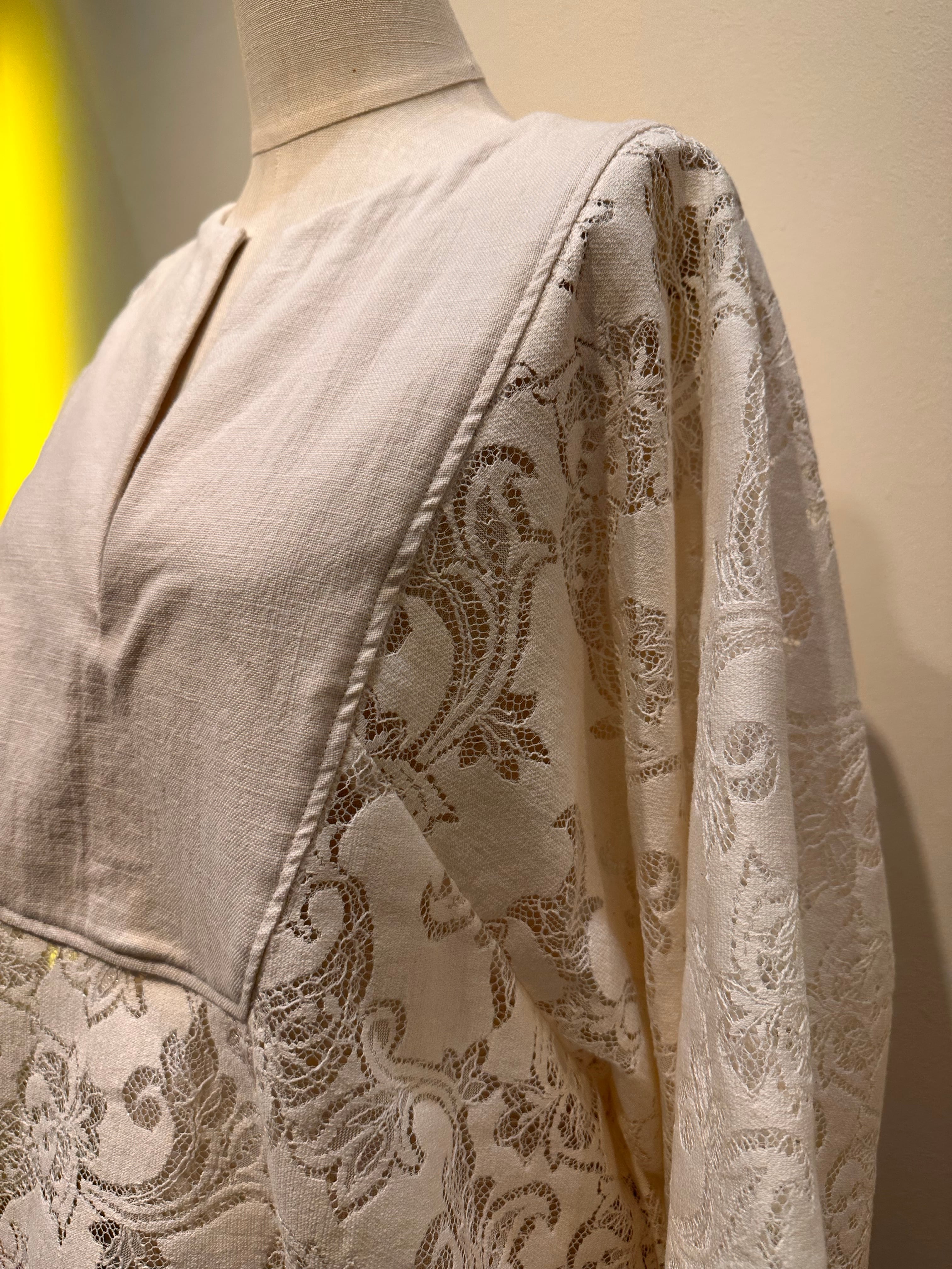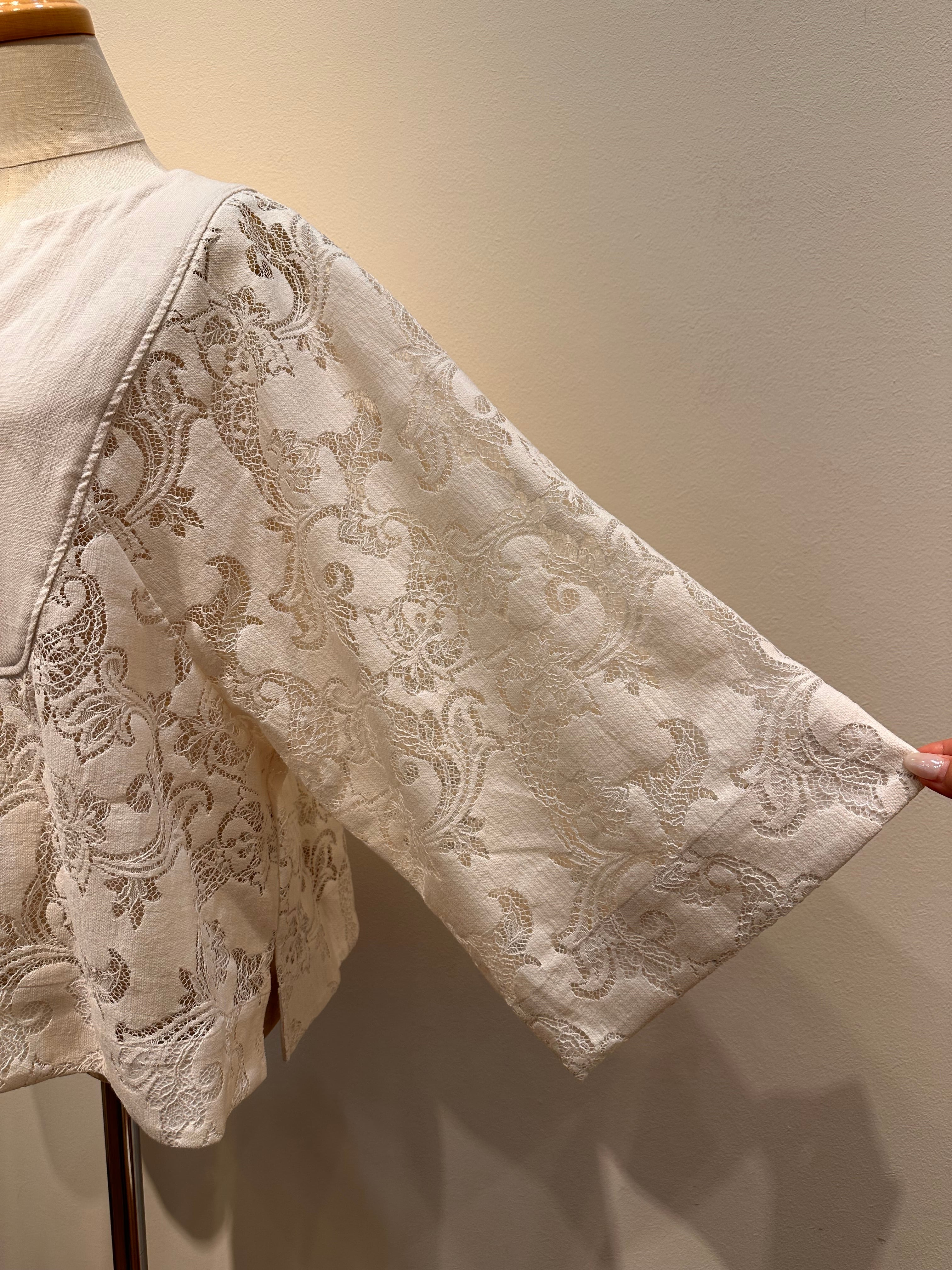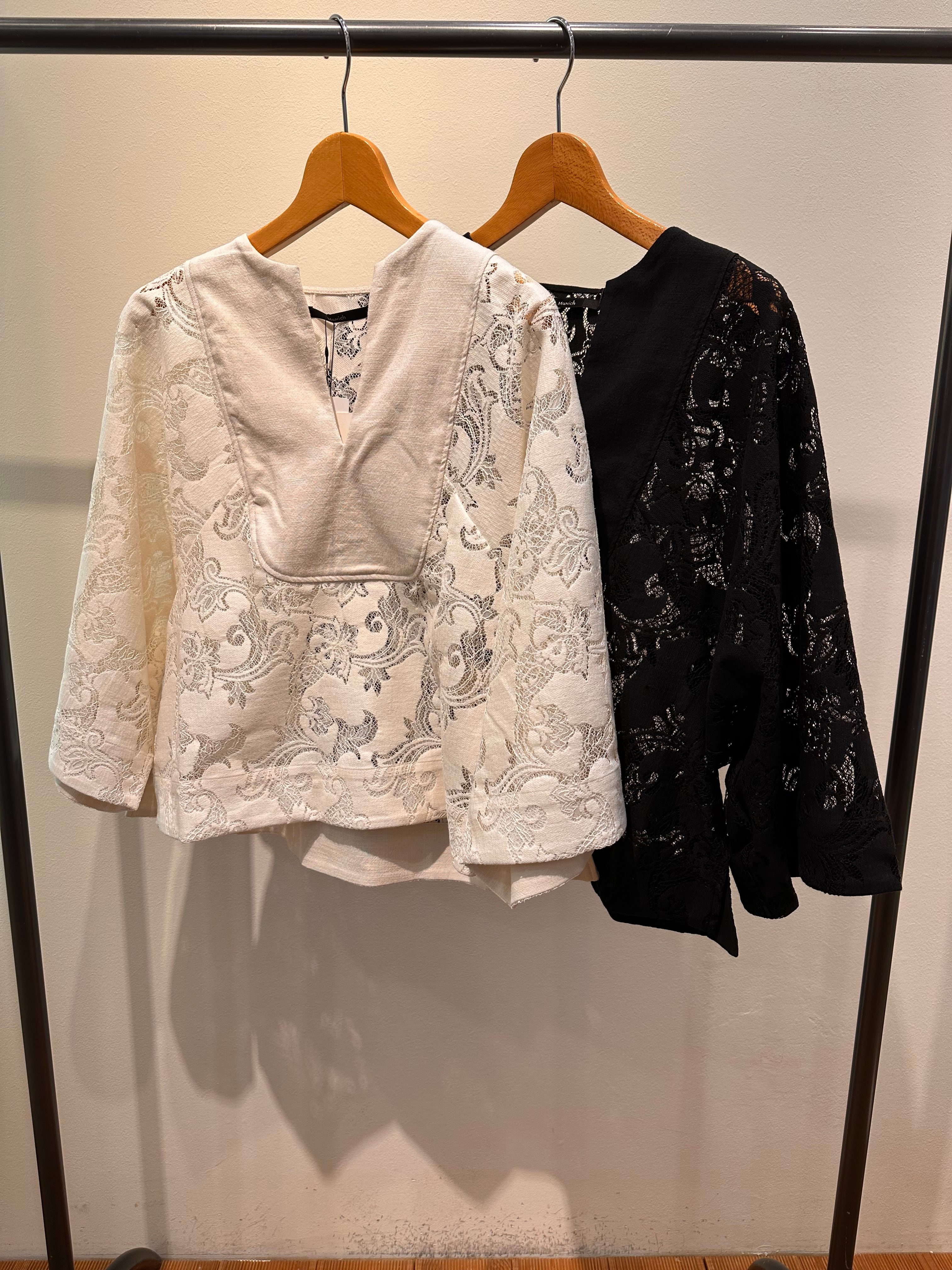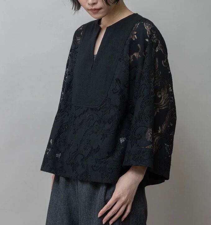 身幅と袖幅を広めに設計し、ゆったりとリラックスした雰囲気のシルエットのレースブラウスです。アイボリーはやや甘め、ブラックならよりシックな雰囲気で、しっかりした素材感のブザム切り替えがアクセントになり、カジュアルになり過ぎないキチンと感をプラス。衿元は少し深めのキーネックで抜け感を入れ、女性らしい印象に仕上げました。
