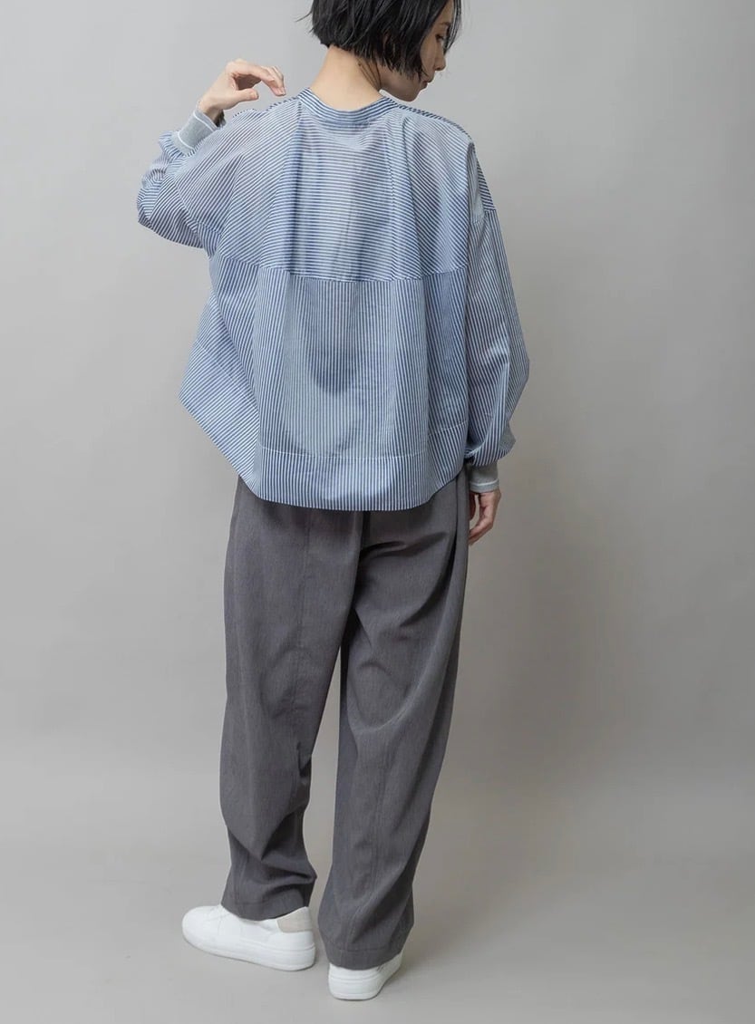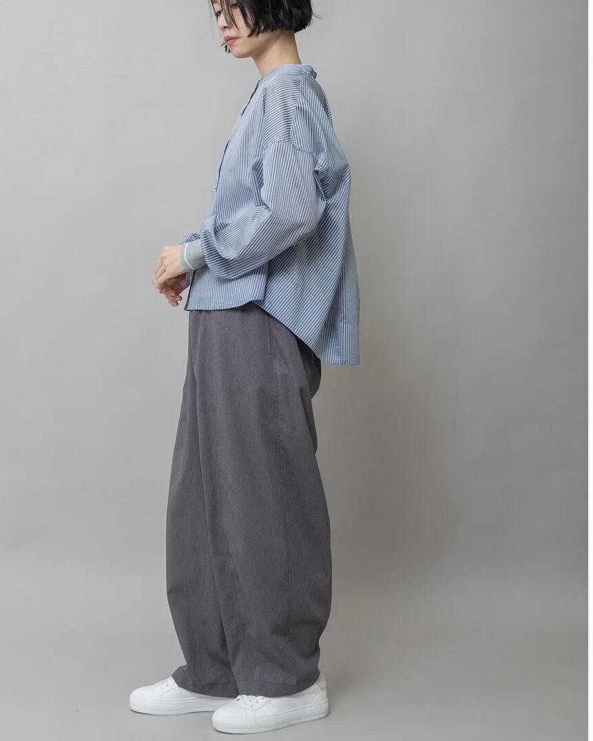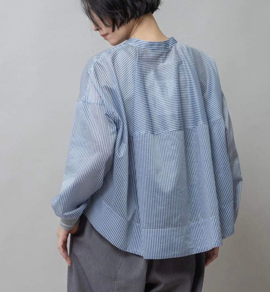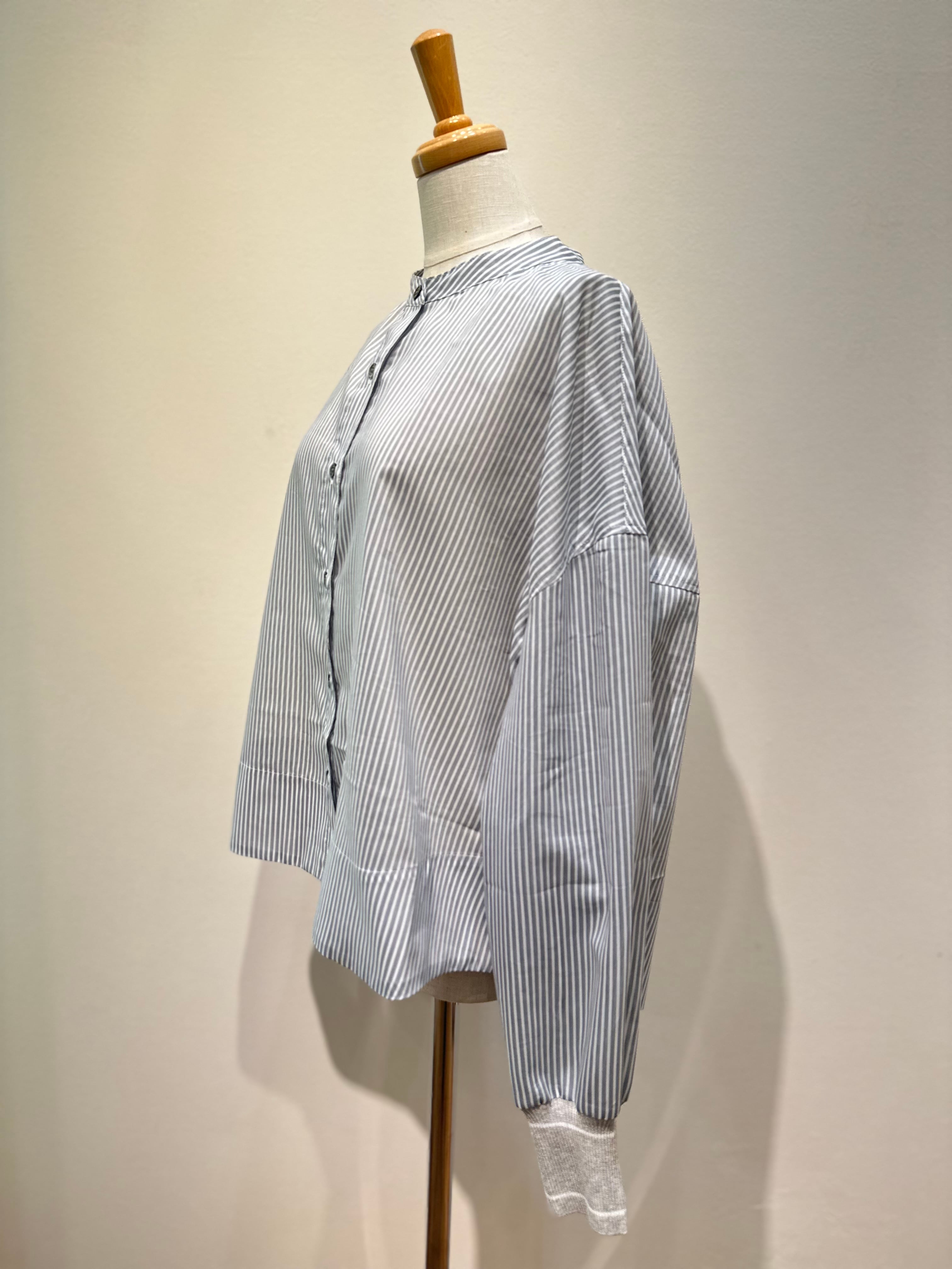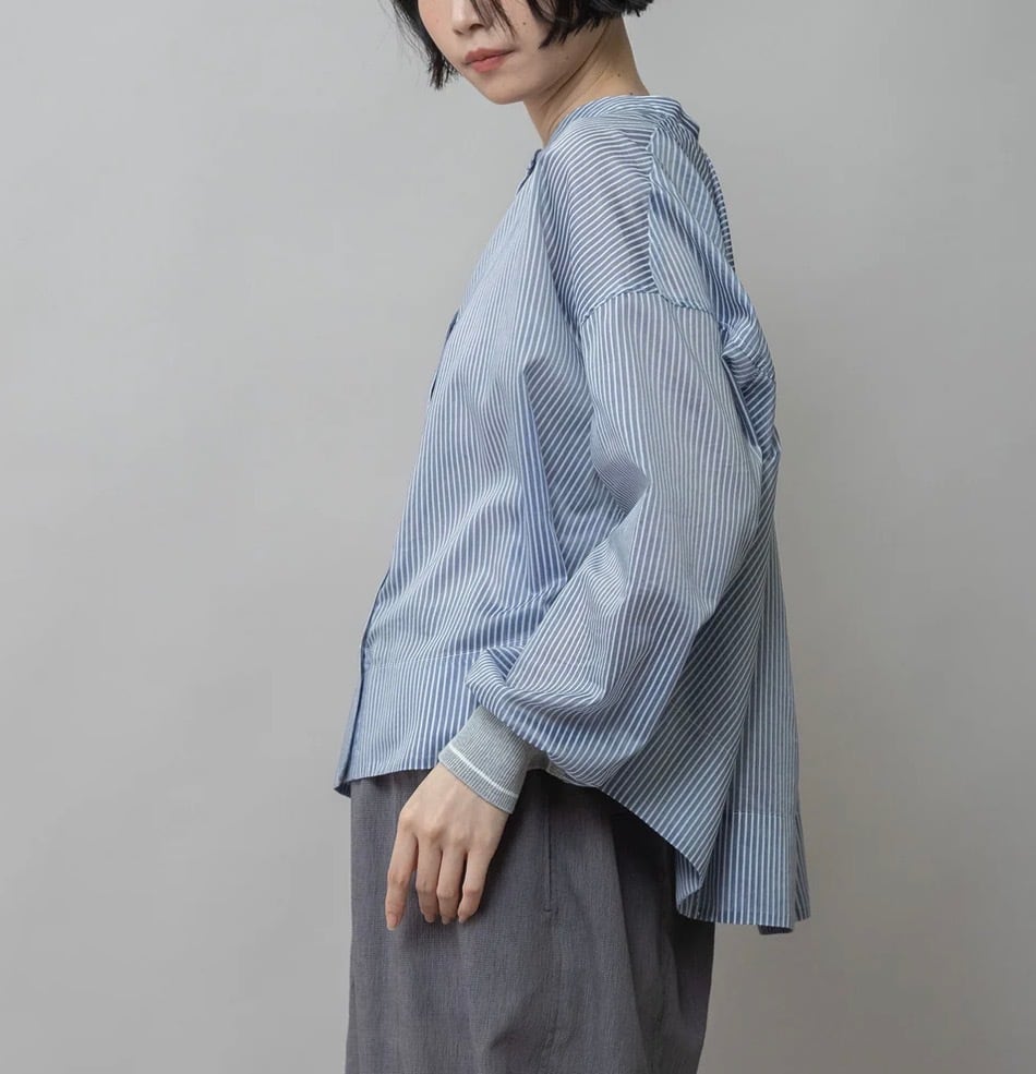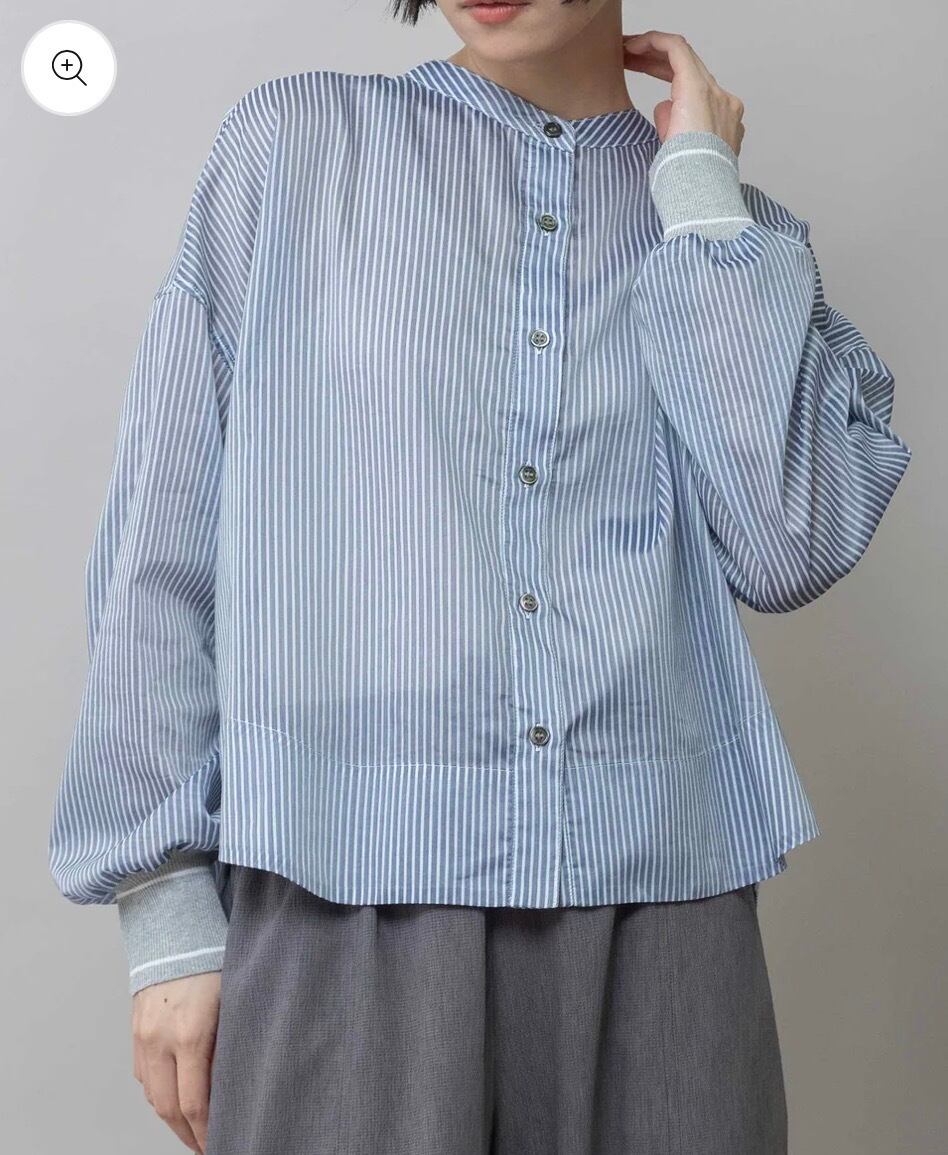 袖口にMunichらしくリブを使ったバンドカラーのシアーシャツです。
