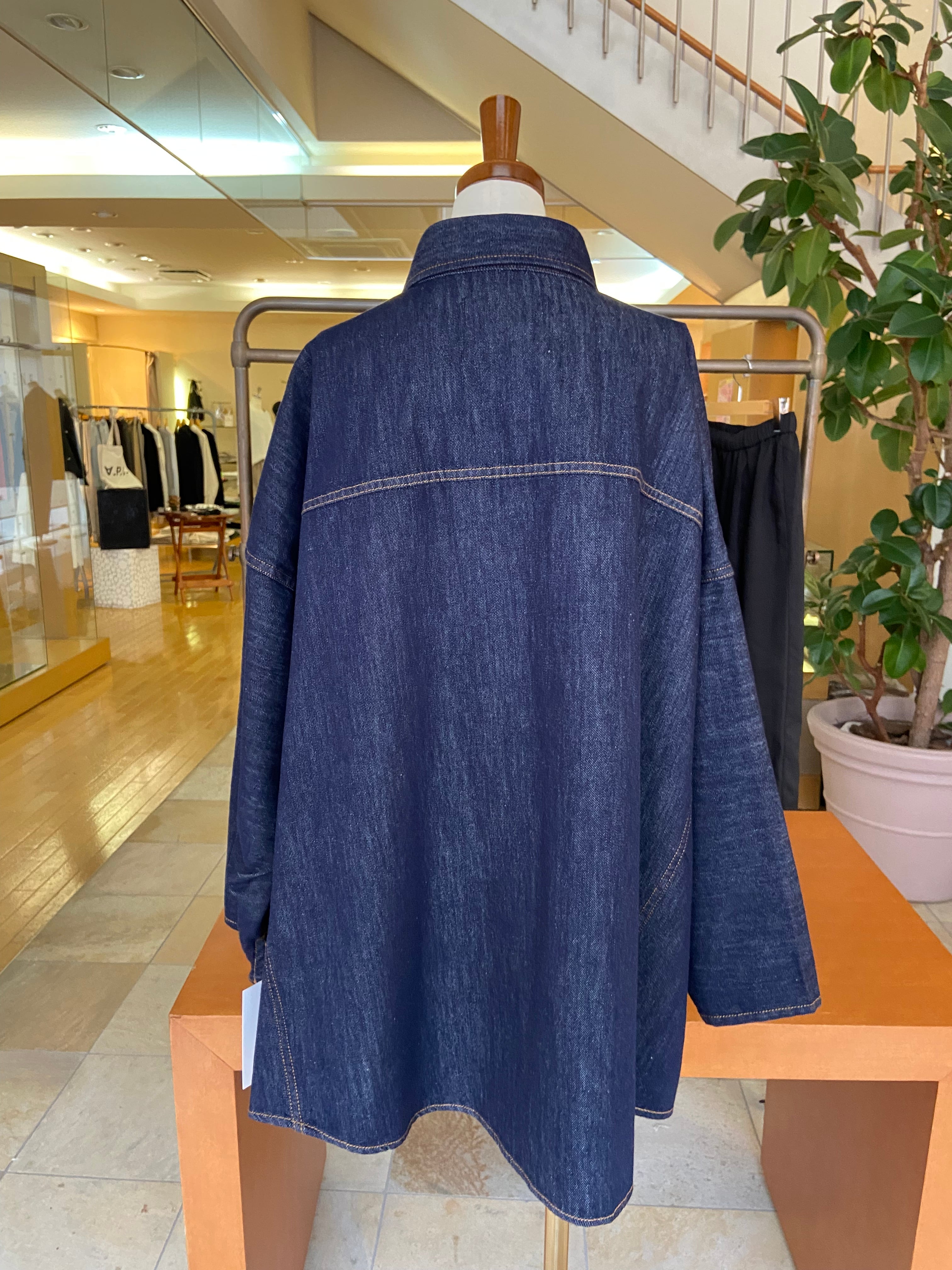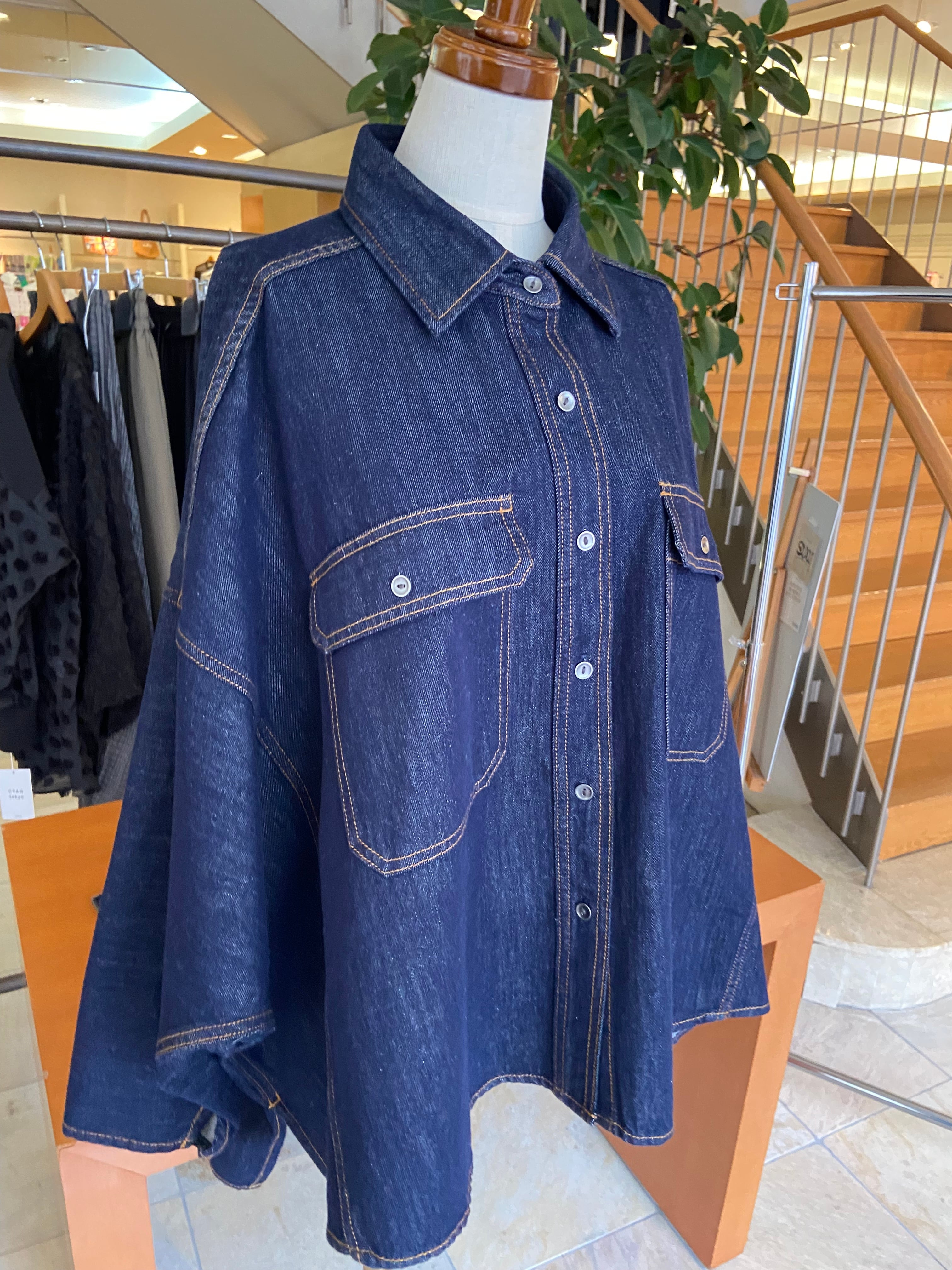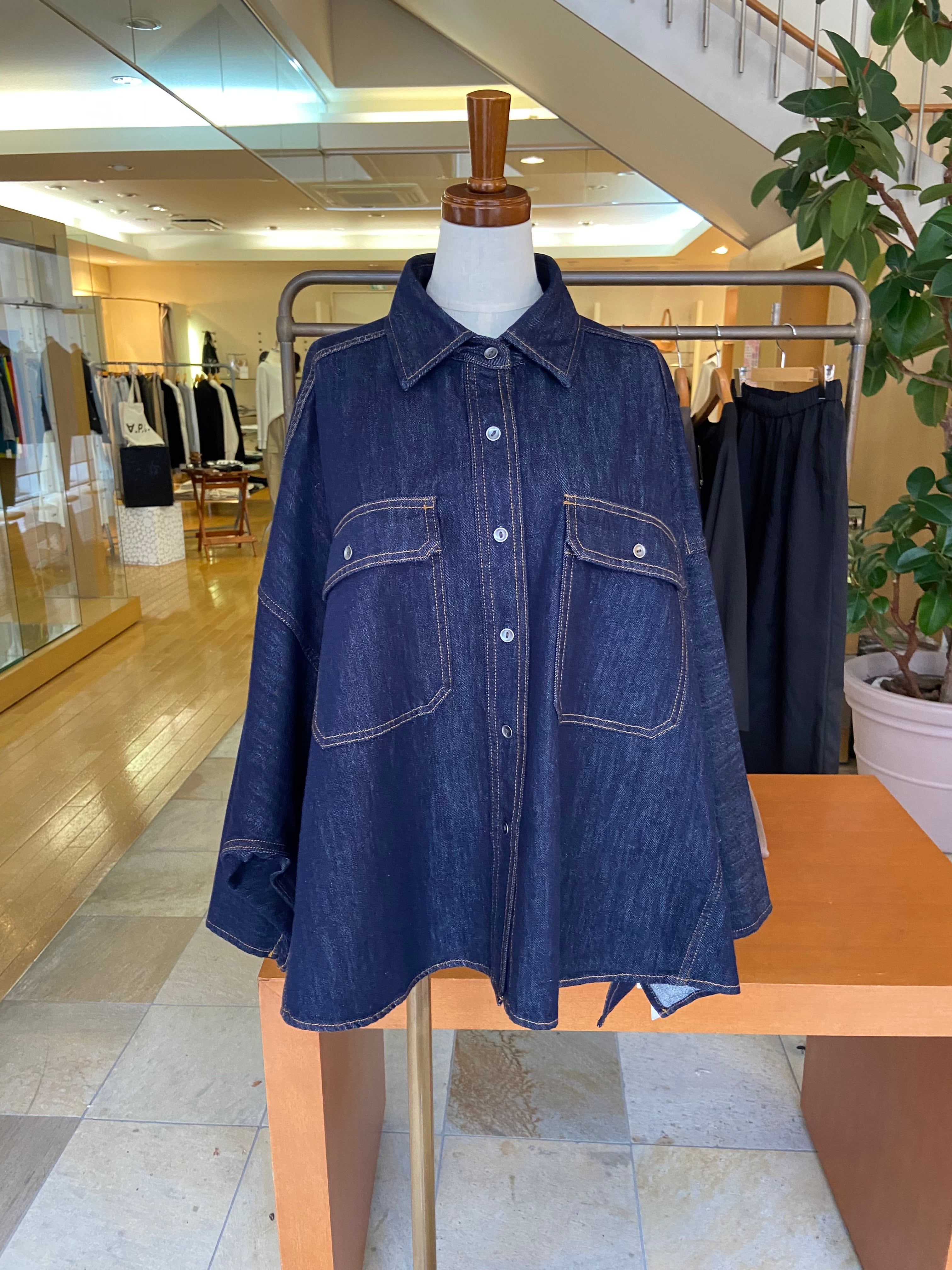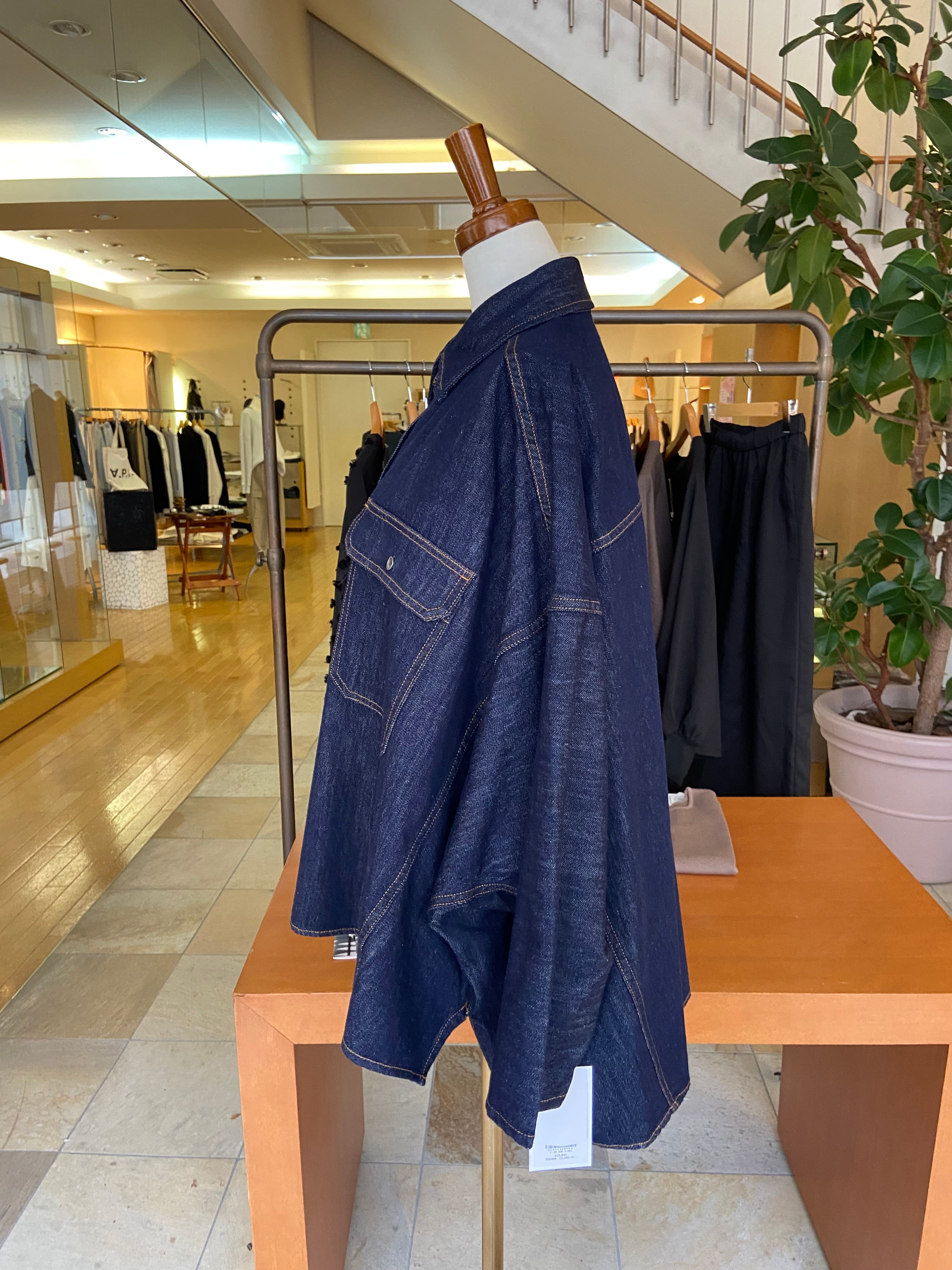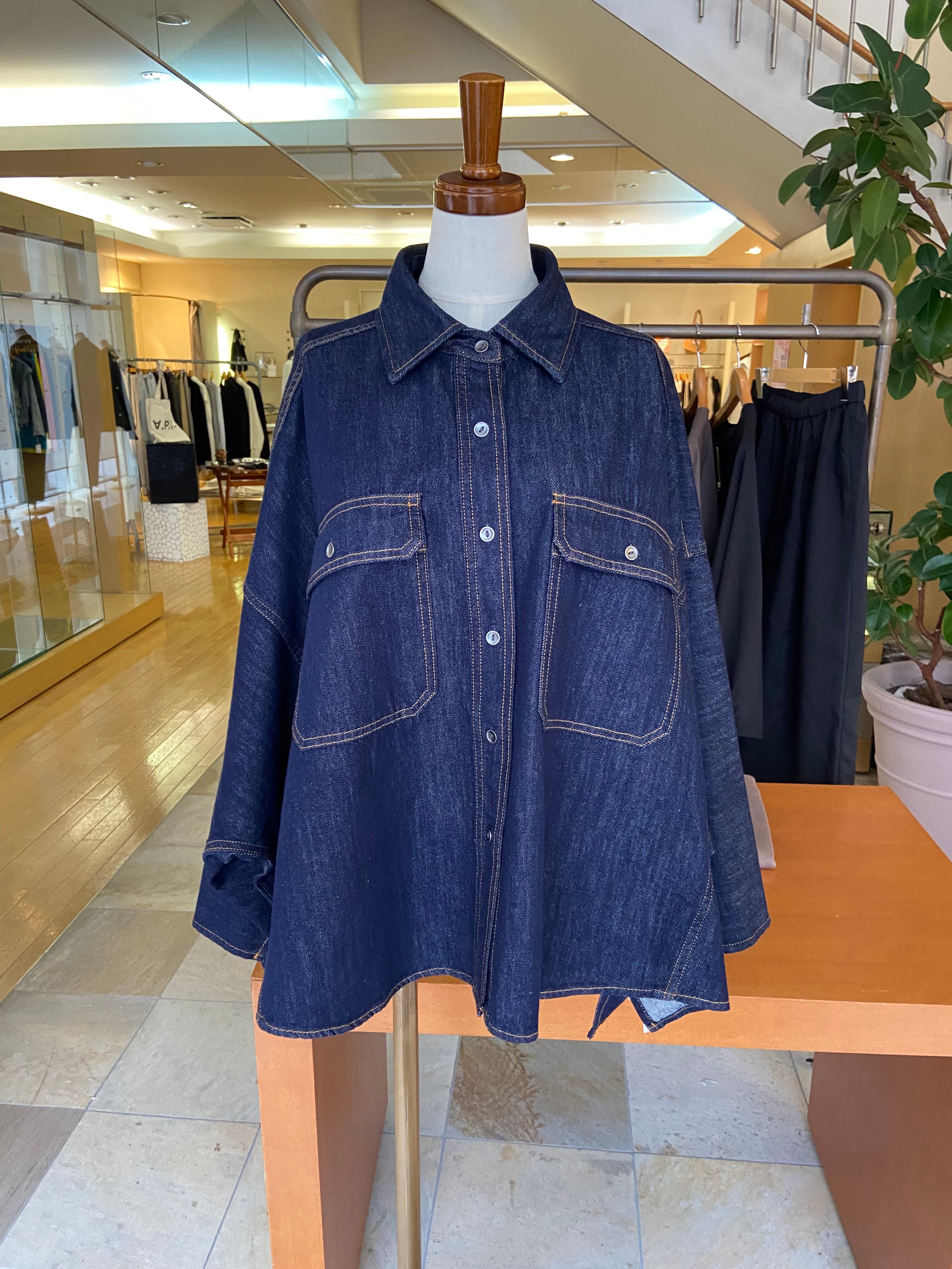 ポンチョのようなゆったりシルエットで、ざっくりと楽に脱ぎ着しやすいライトオンスデニムシャツです。