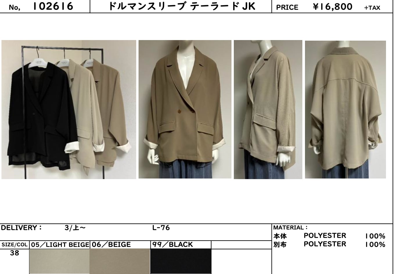 3日ライブ 3月配送 LUGIVA TOKYO /ルギヴァ 102616 ドルマンスリーブ テーラード JK