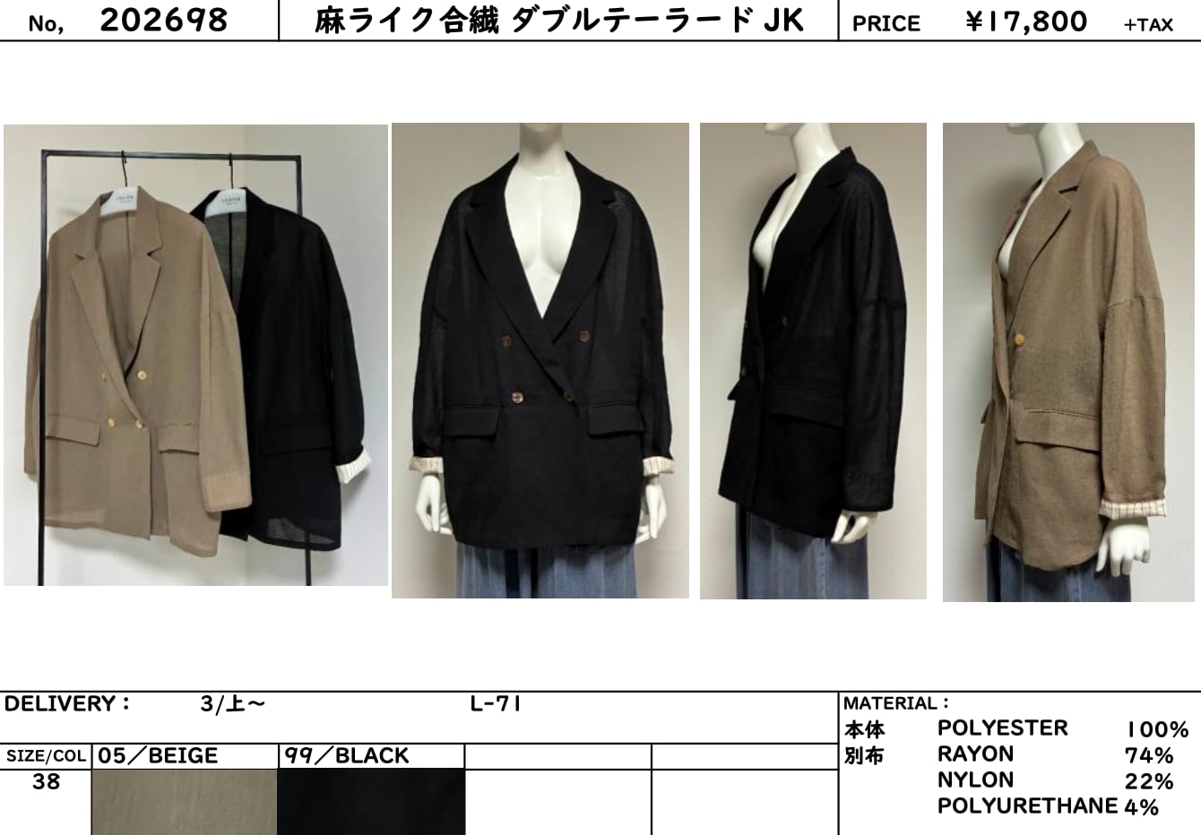 3日ライブ 3月配送 LUGIVA TOKYO /ルギヴァ 202698 麻ライク合繊 ダブルテーラード JK