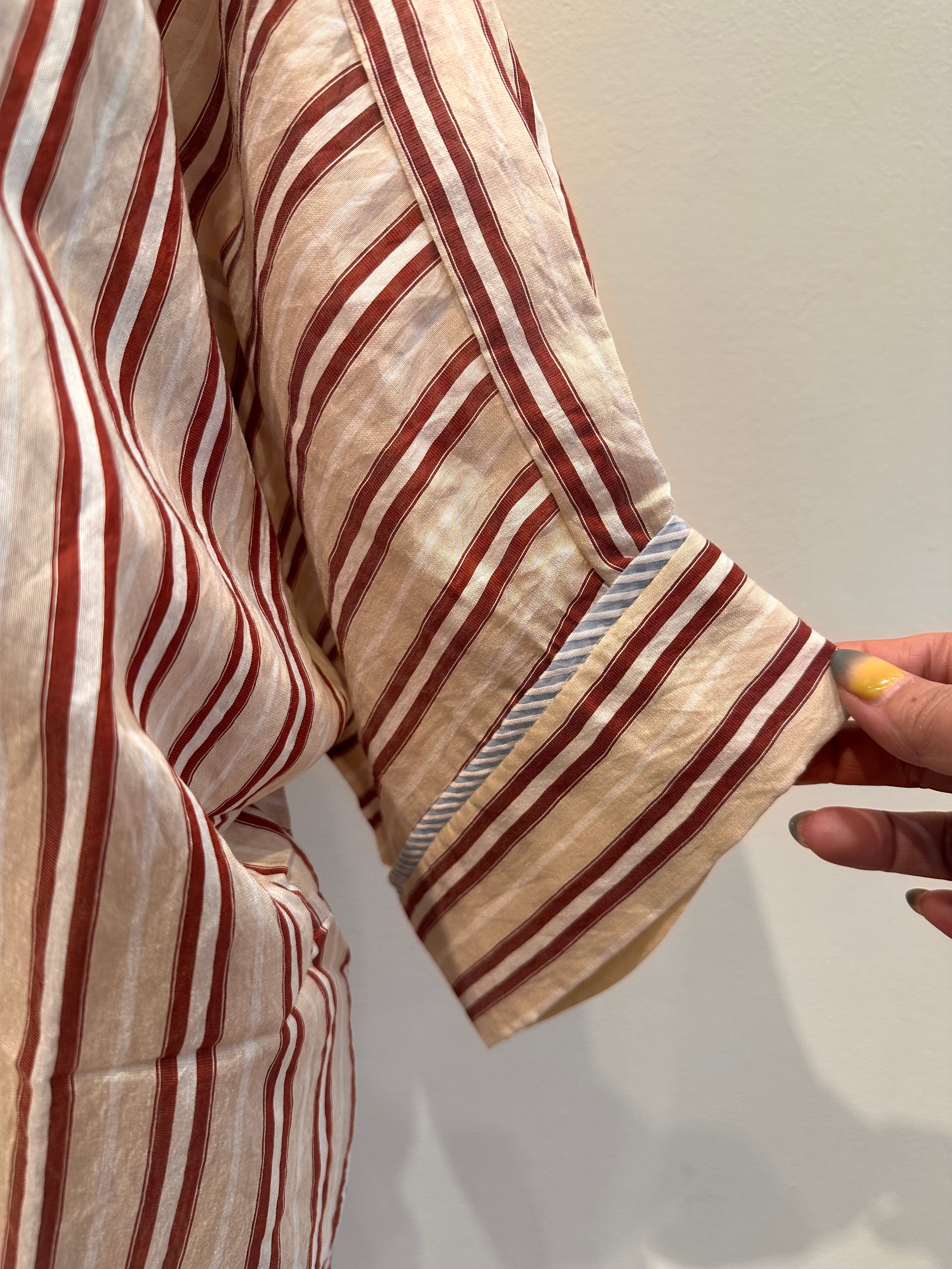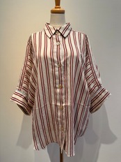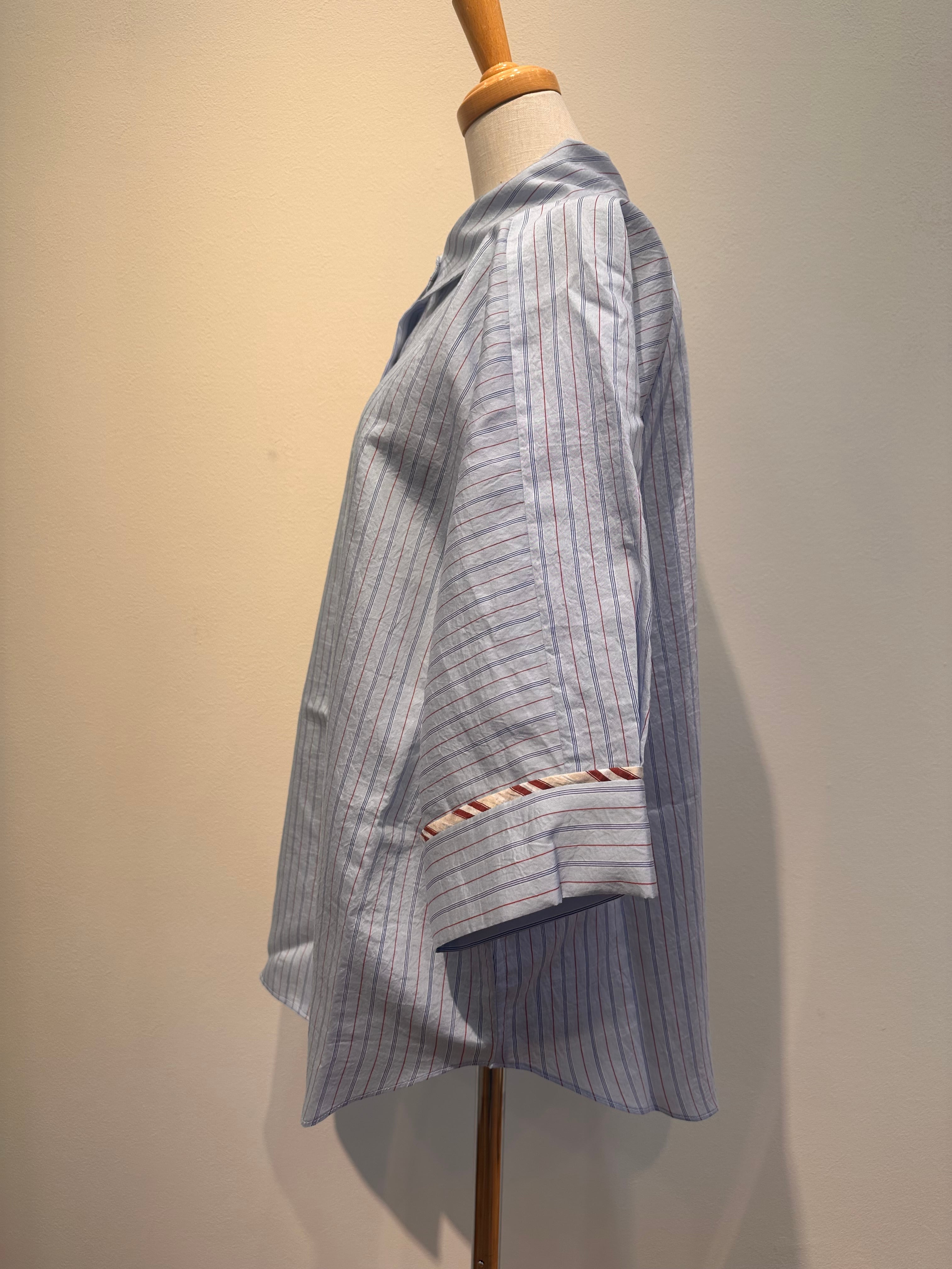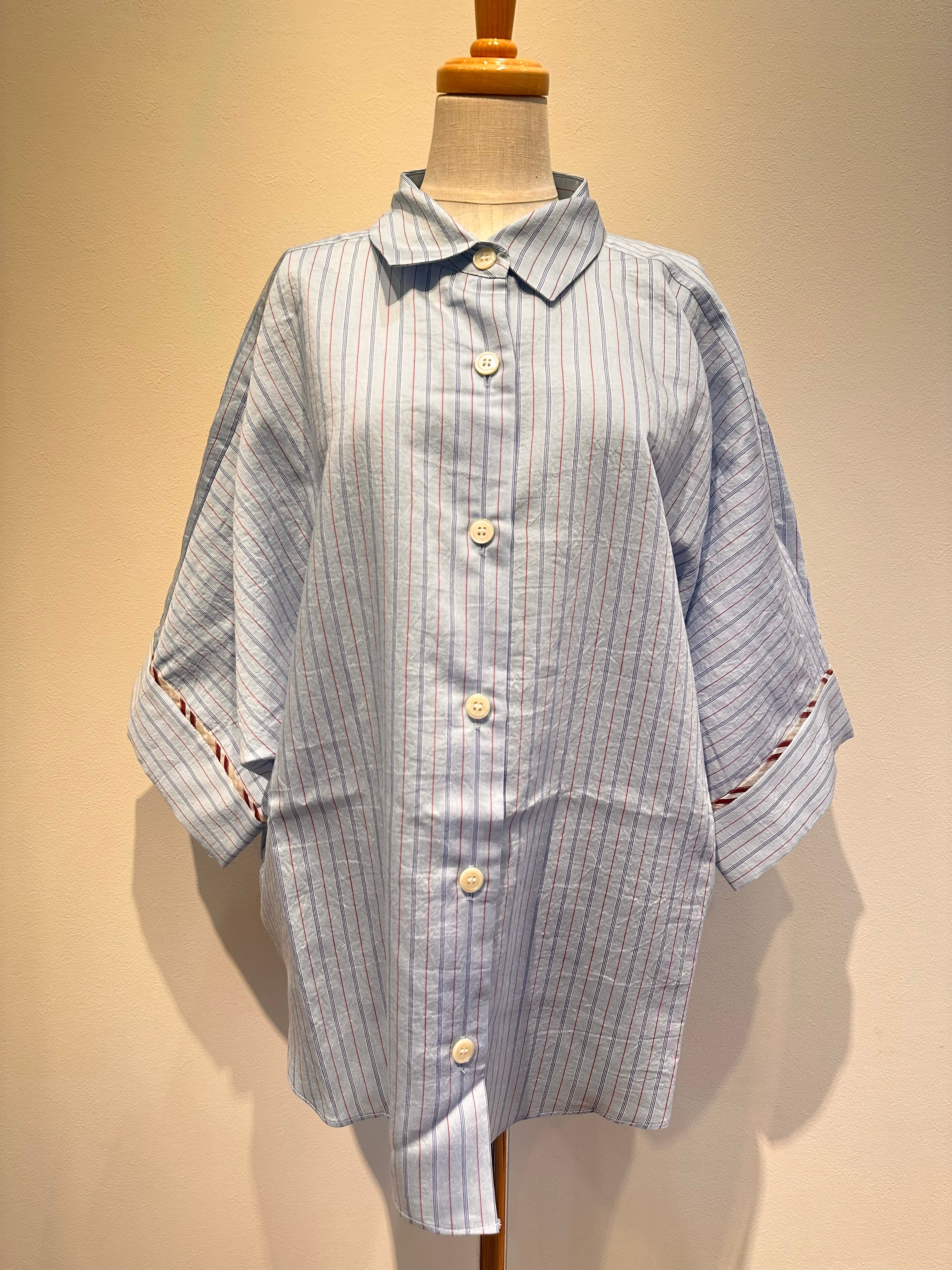 抜け感のある7分袖くらいのドルマンスリーブシャツで、カフスに異なる柄の共地を挟み込んでいます。