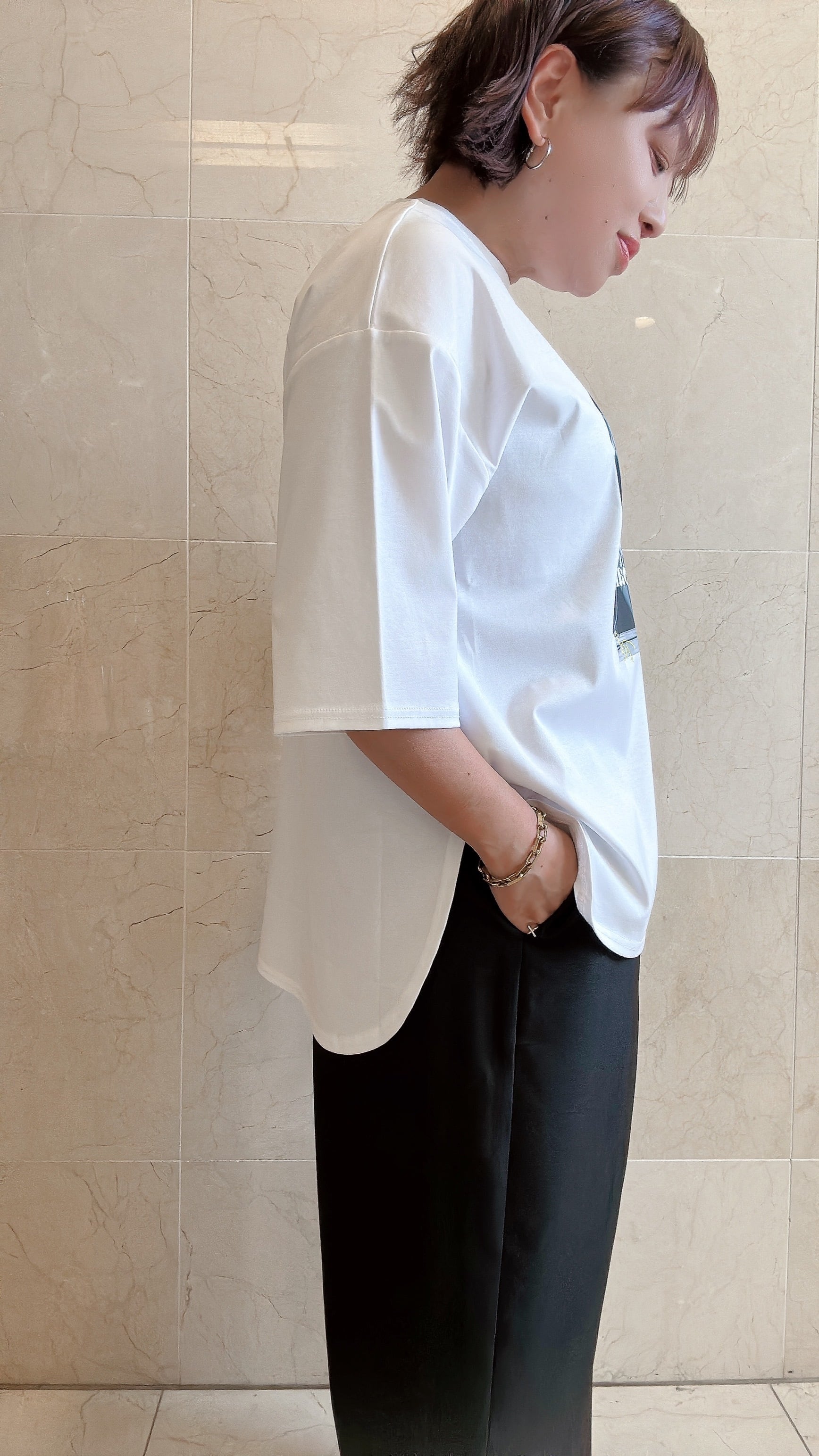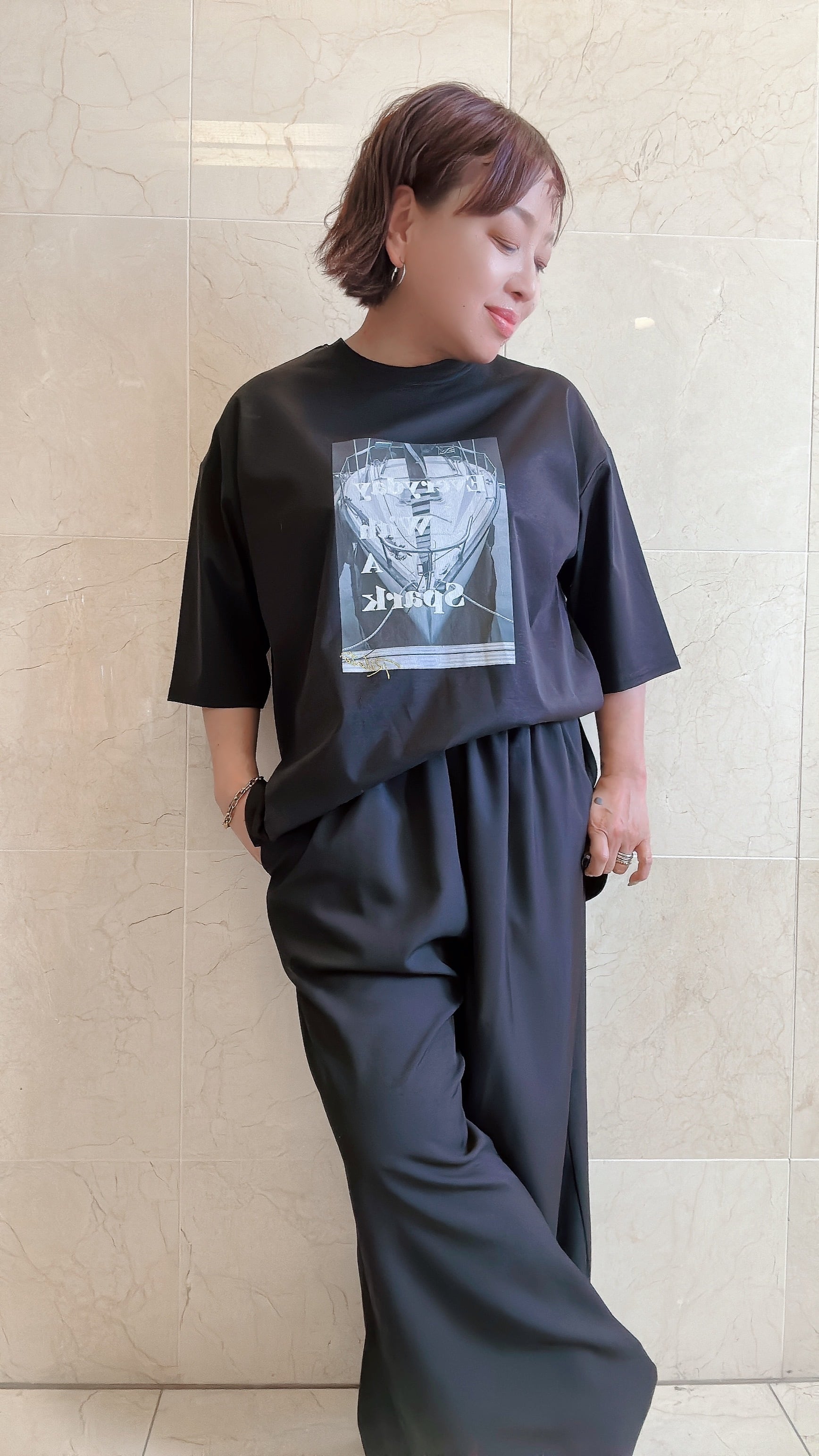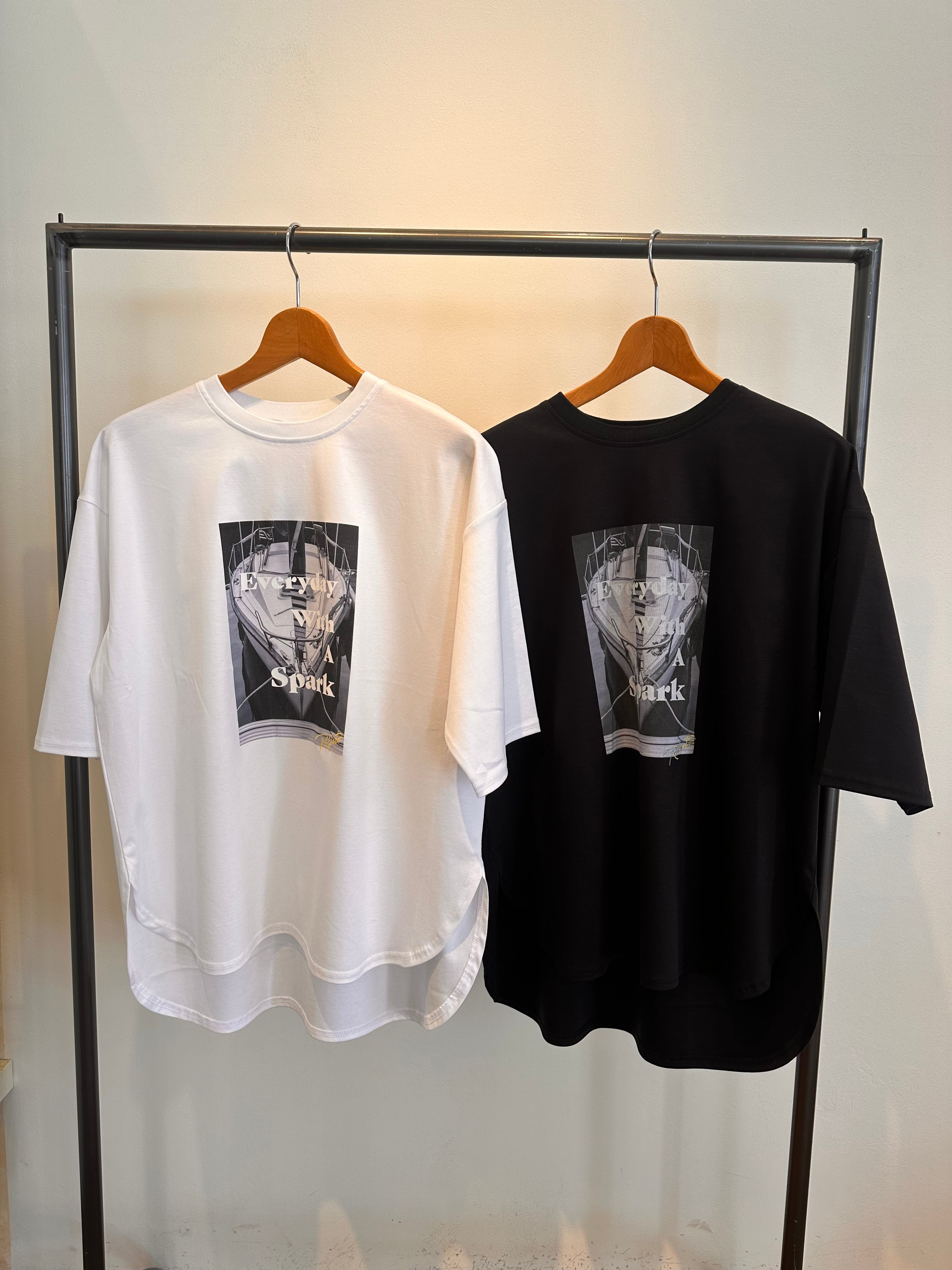 モノトーン調のフォトプリントのTシャツ。