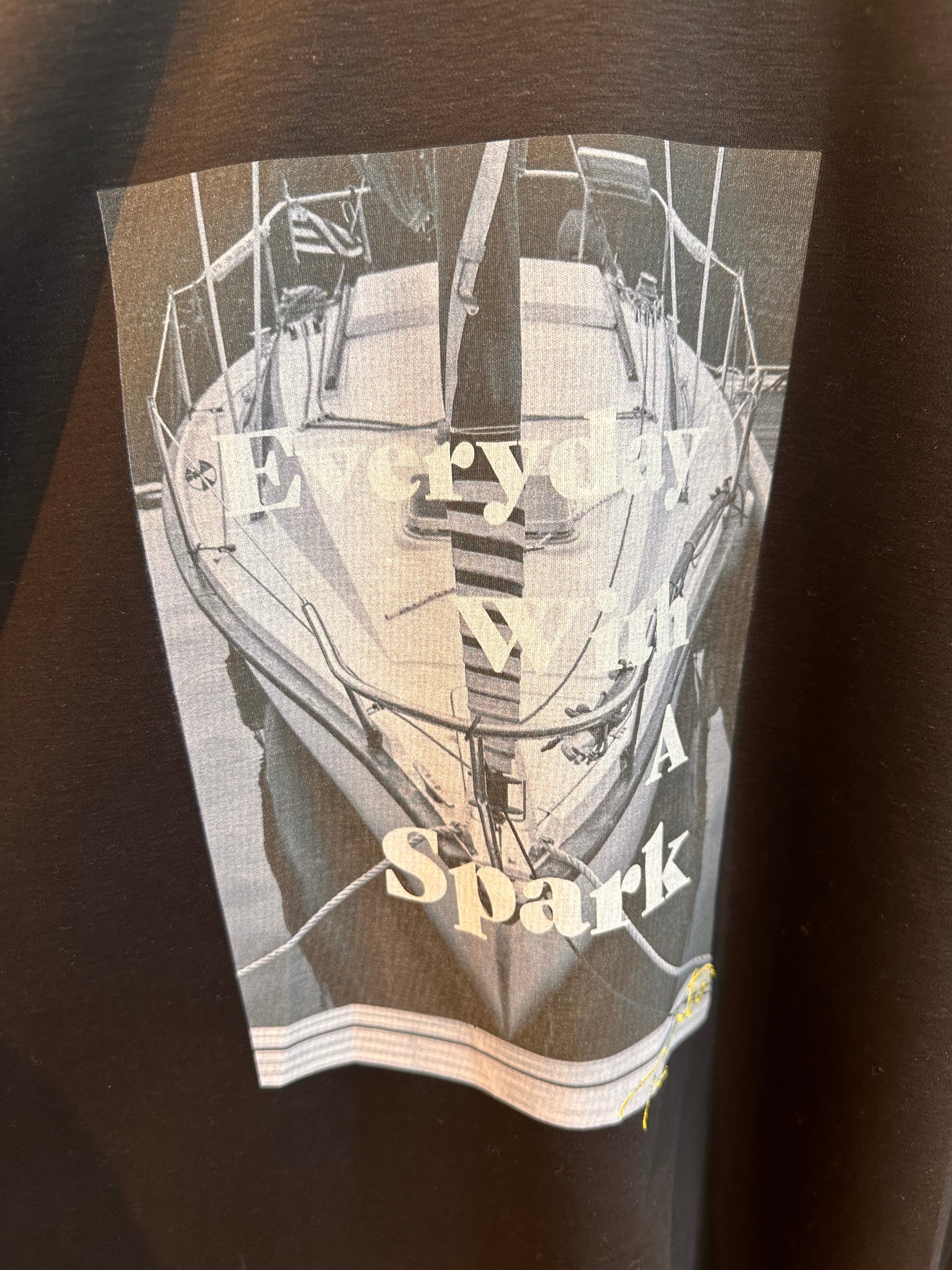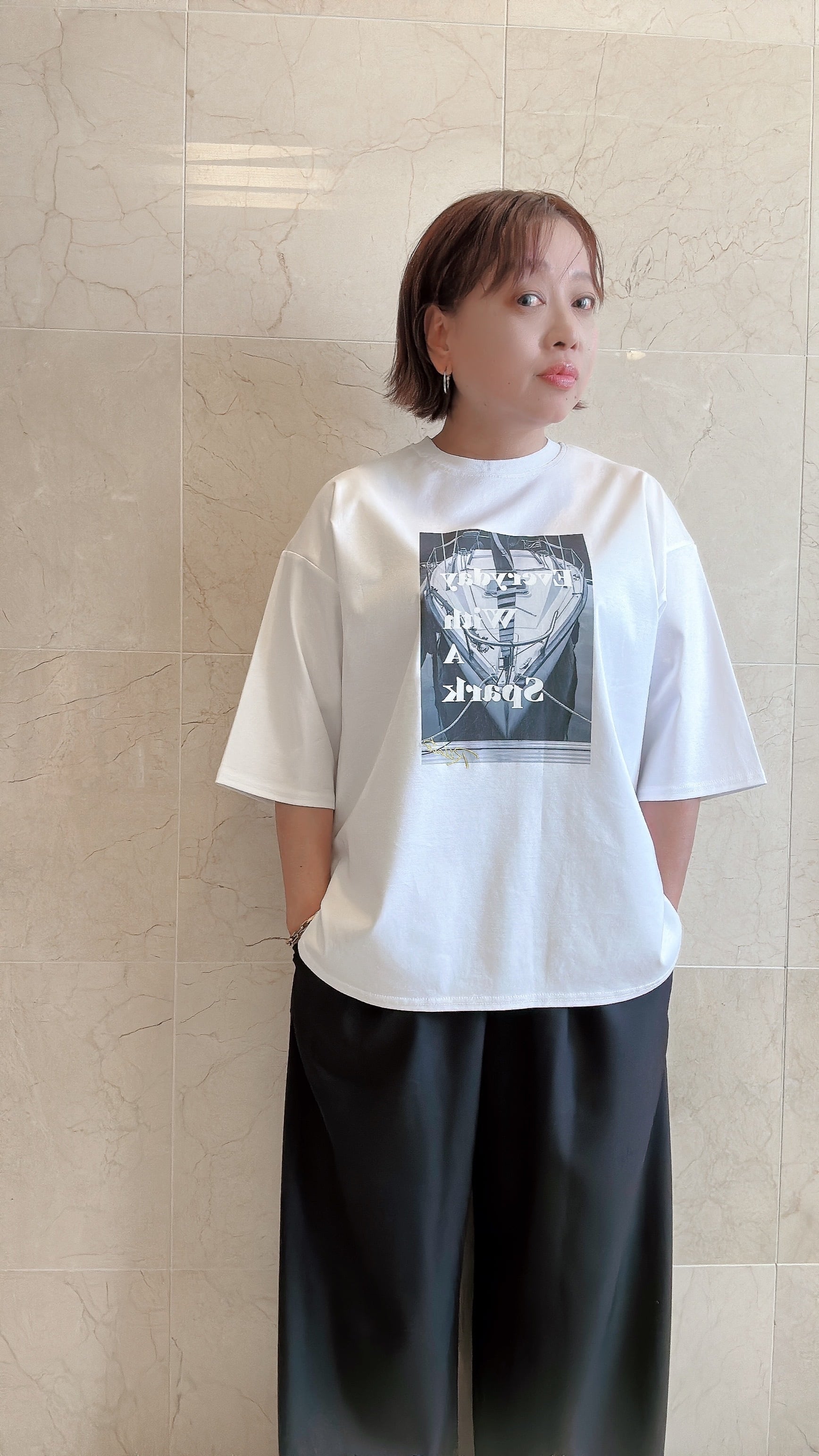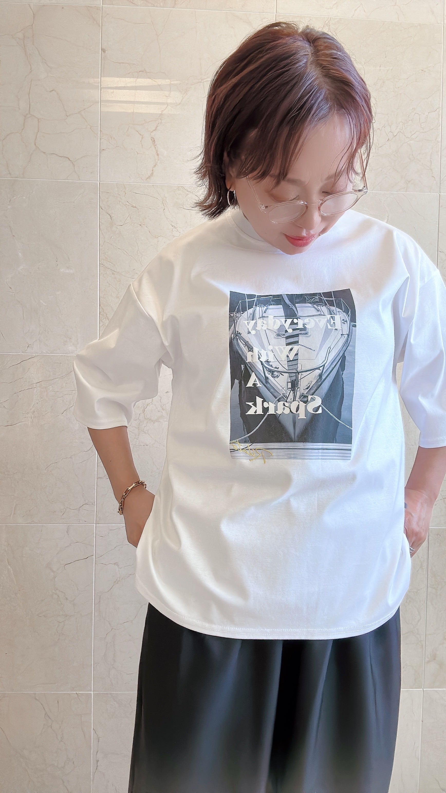 モノトーン調のフォトプリントのTシャツ。