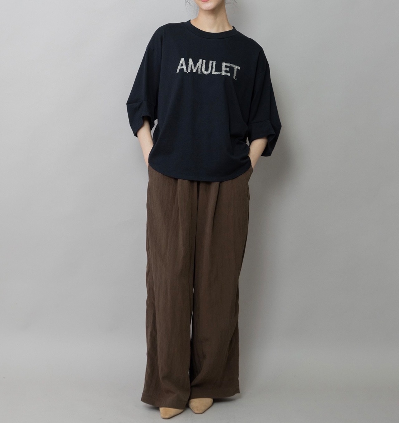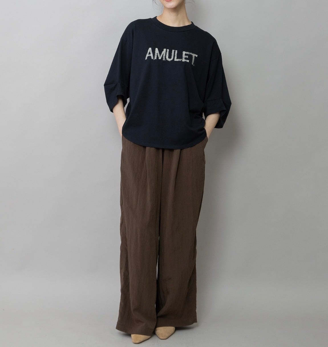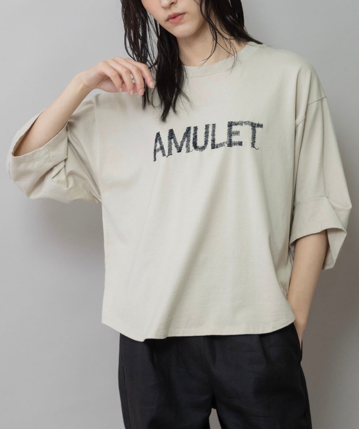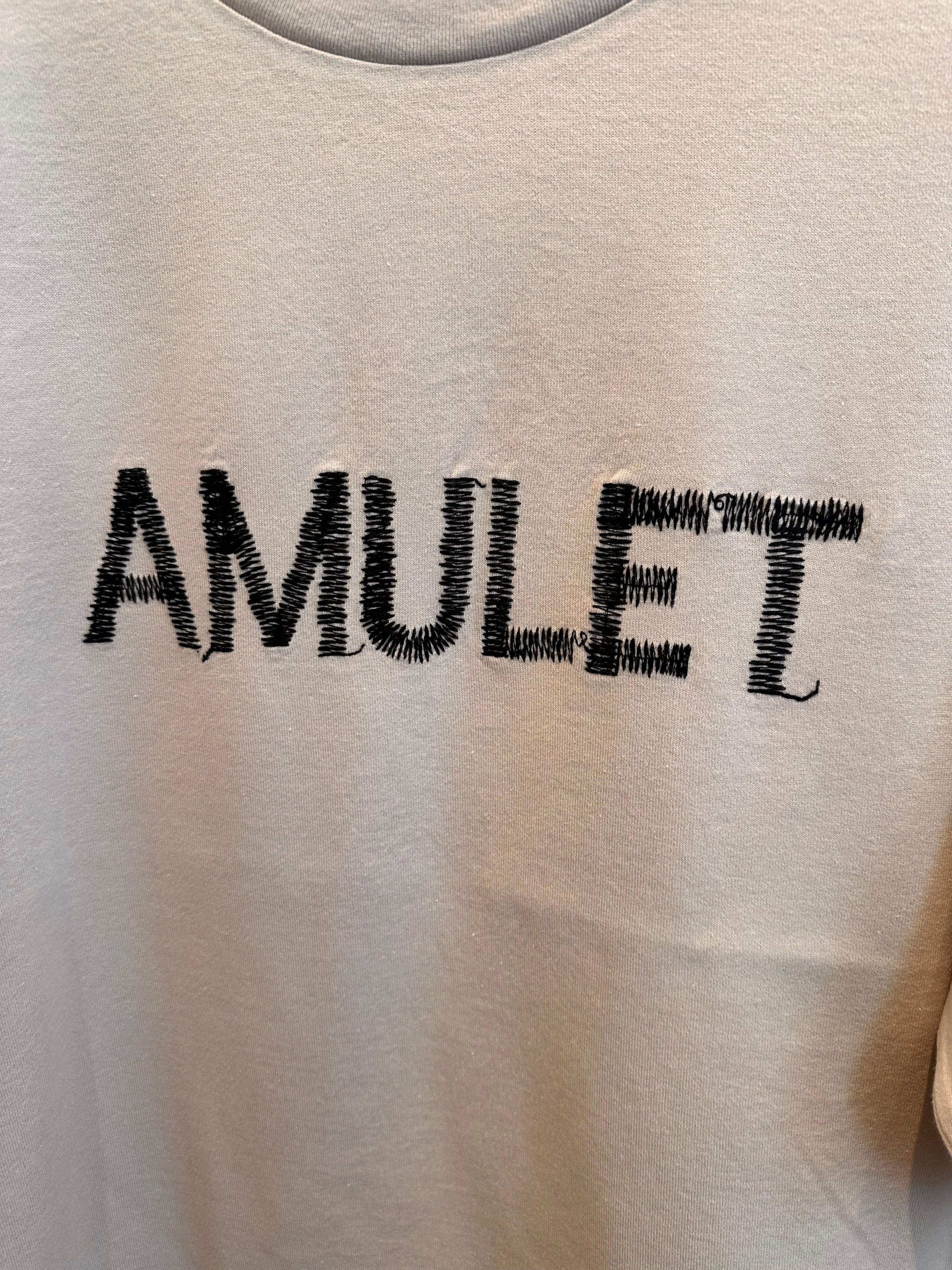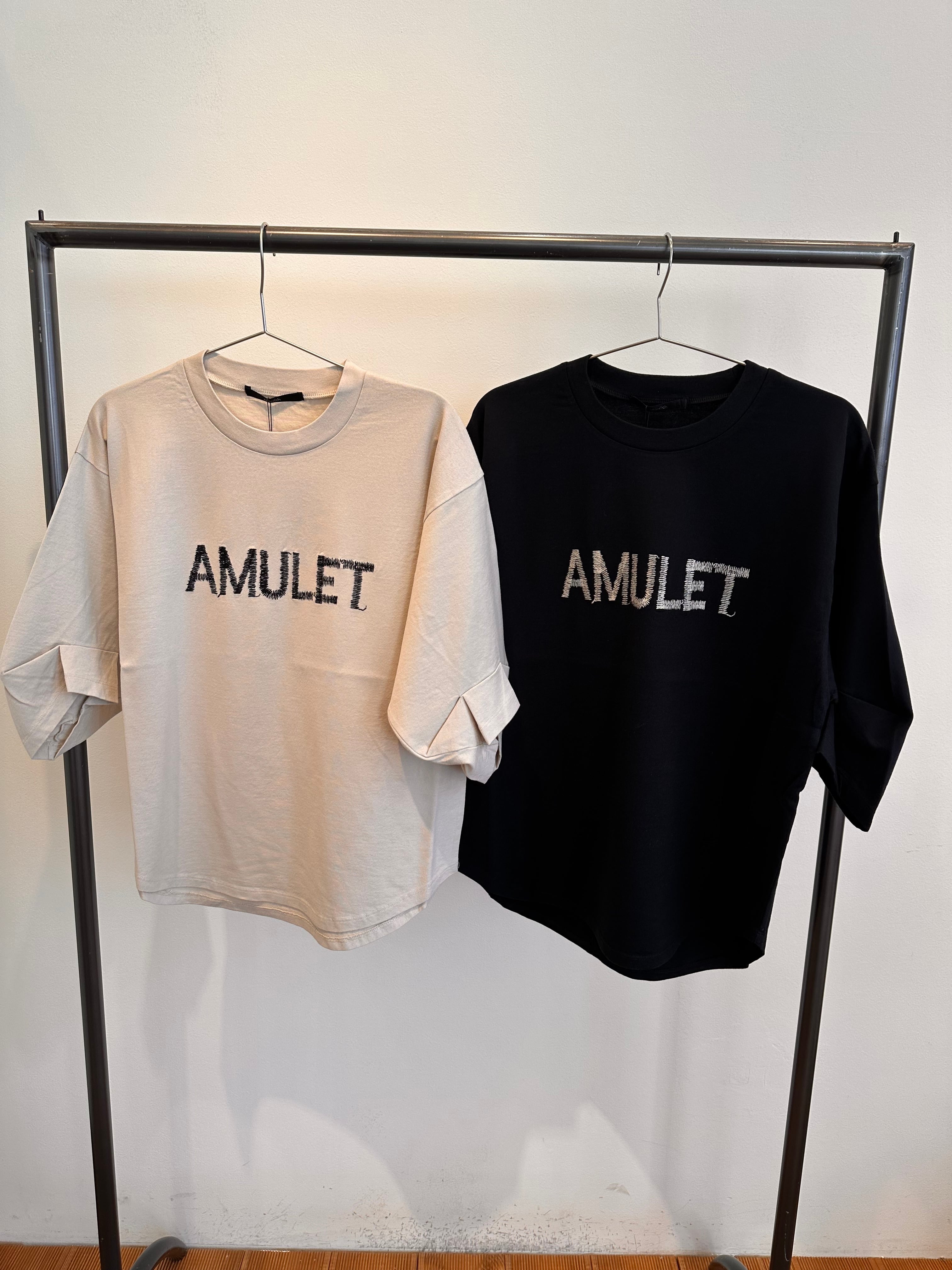 ロゴは、“お守り”という意味を持つ「AMULET」の文字を手書き風の刺繍でやさしく表現。