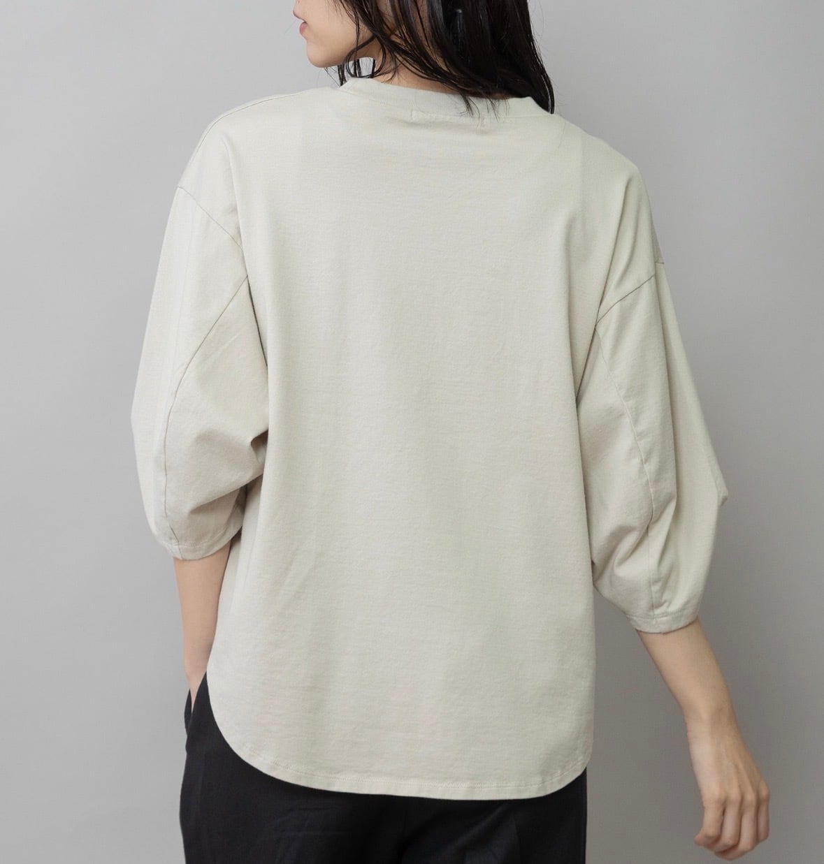 袖はタックと後ろの切替え線で丸みを入れて立体的なフォルムになり、シンプルながら袖がポイントになり、一枚で着て様になるアイテム。
