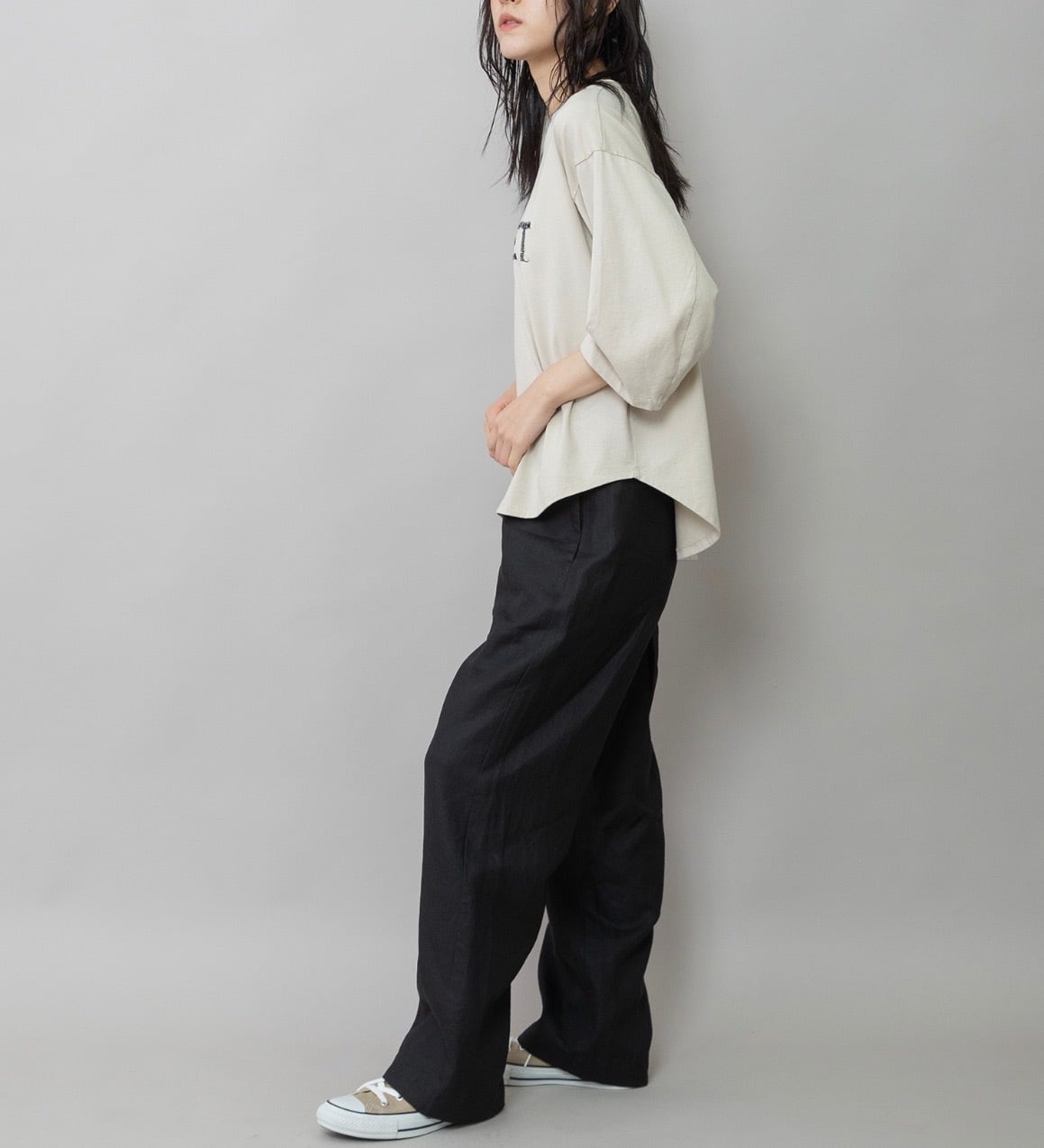 ほどよいゆとりと落ち感のあるシルエットで、シンプルながら抜け感のある雰囲気に。