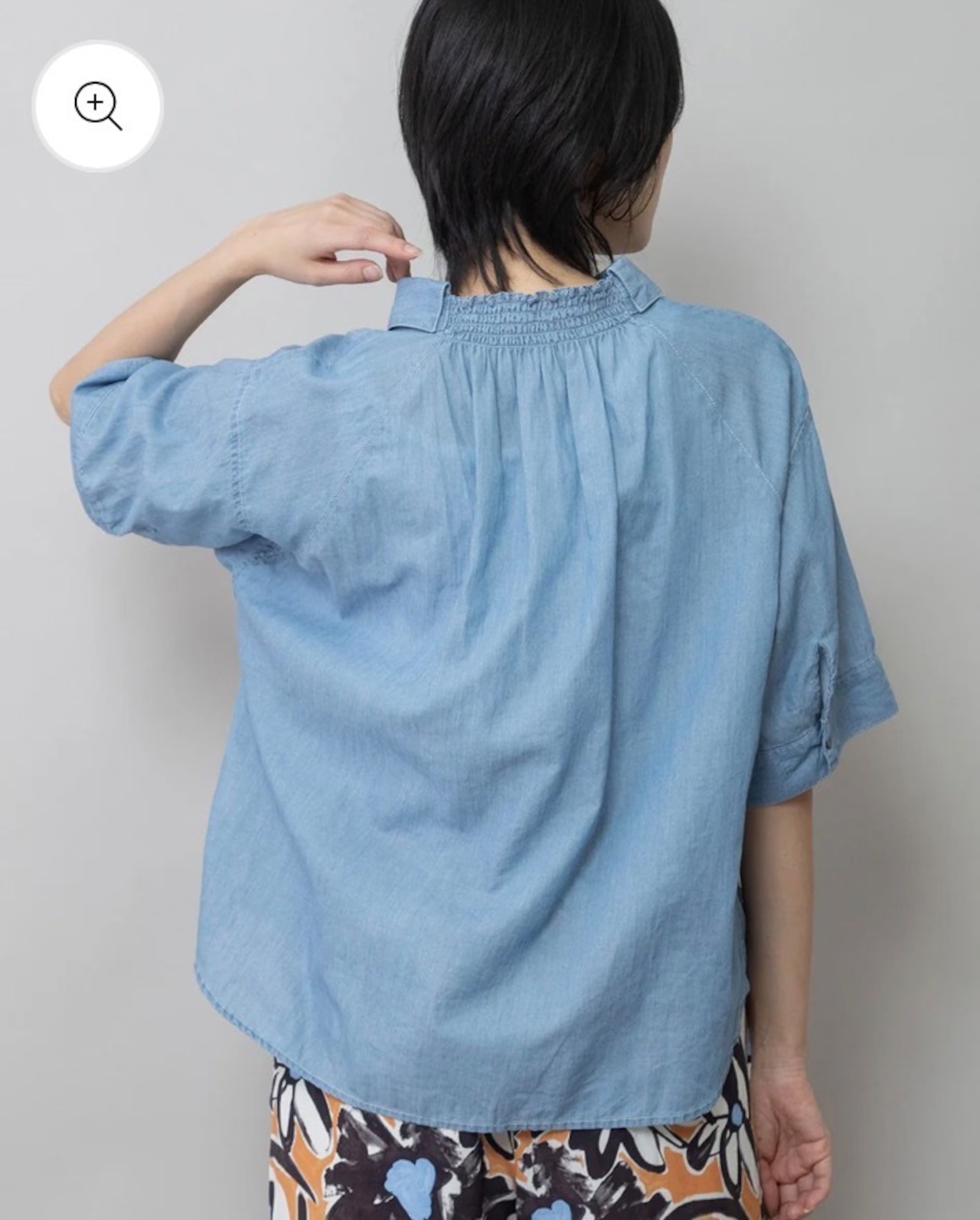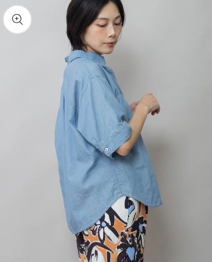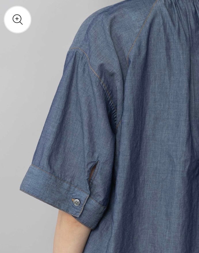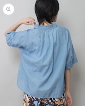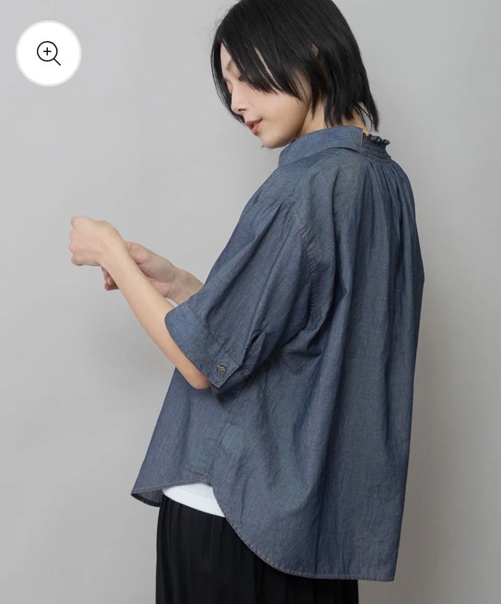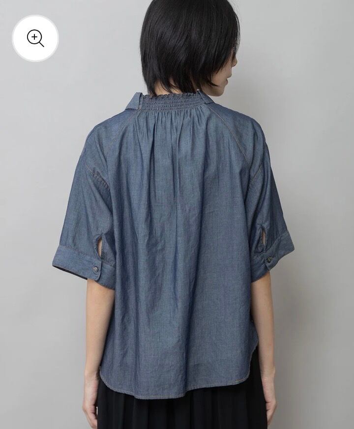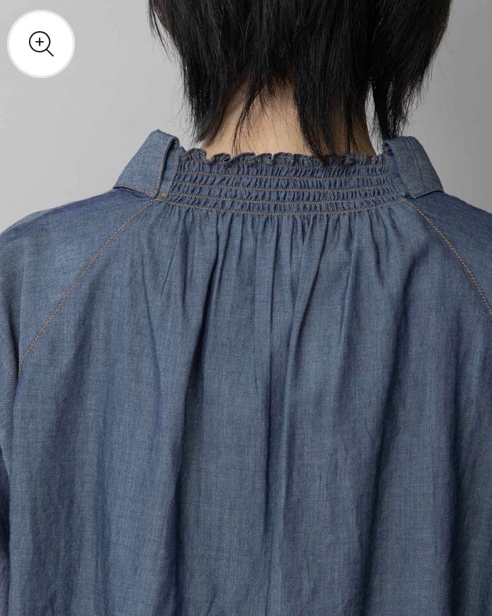 シャツカラーの後ろ衿にゴムシャーリングを施した抜けのある衿まわりがカジュアルなデニムシャツを女性らしい印象に魅せてくれます。