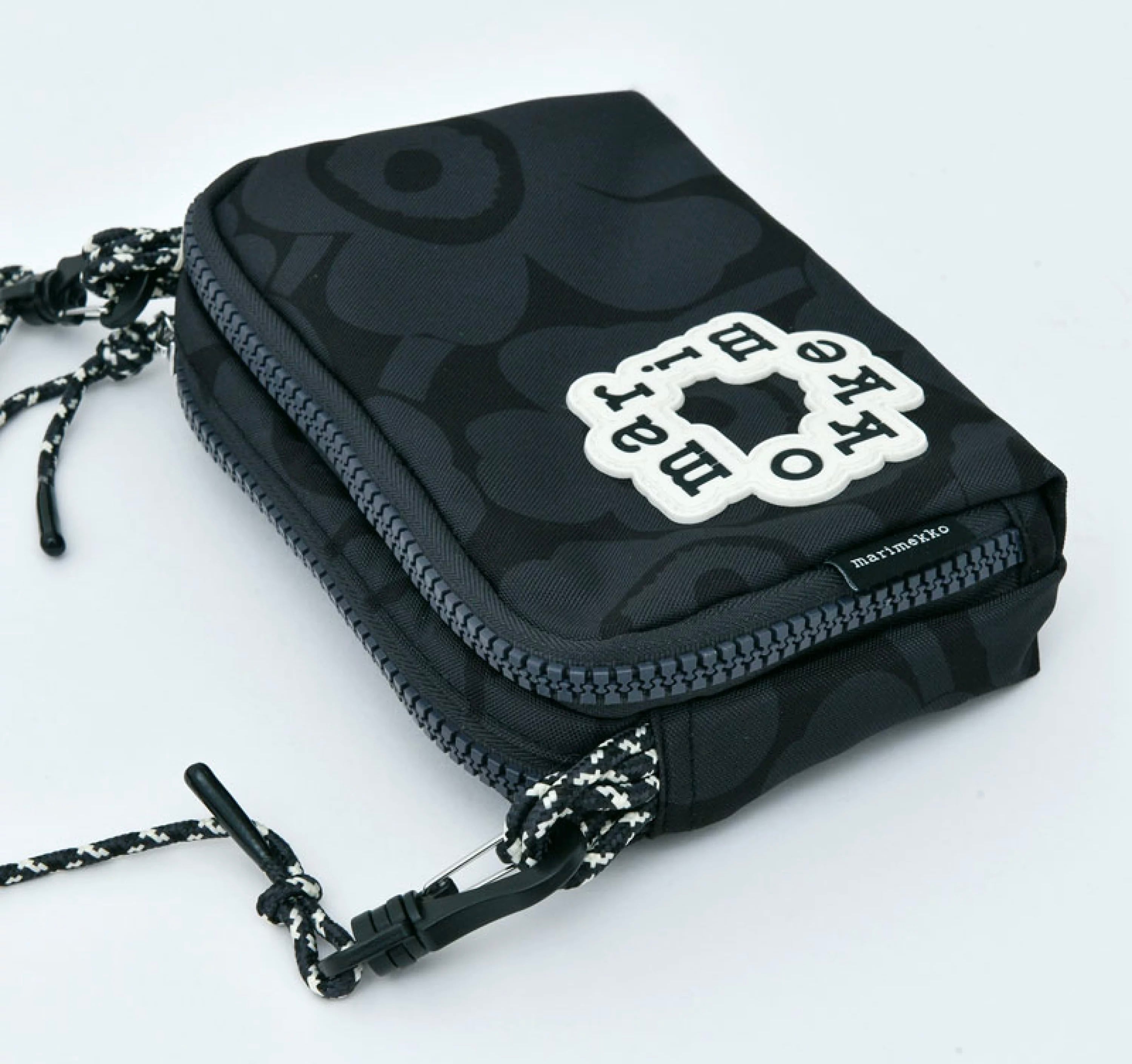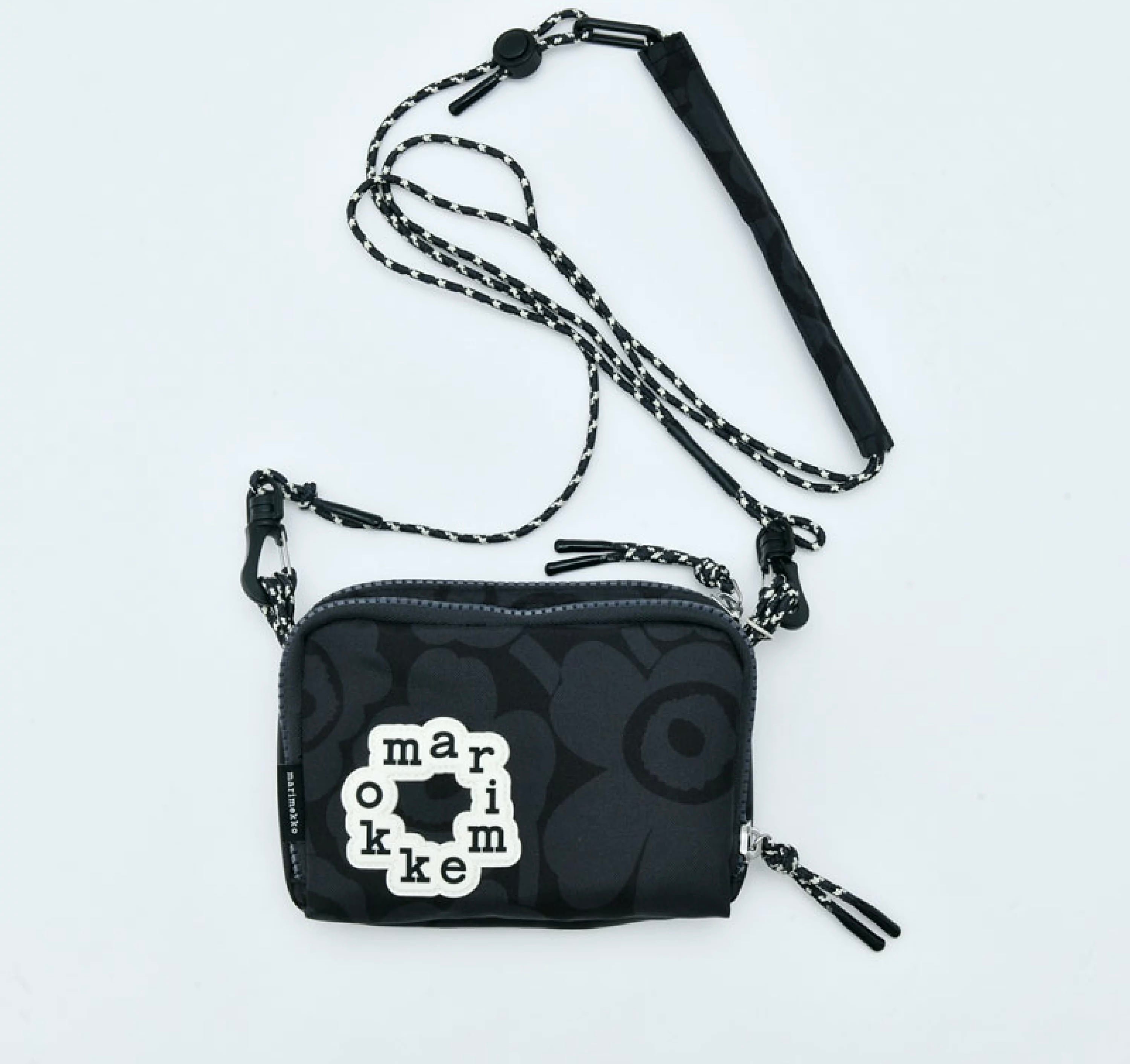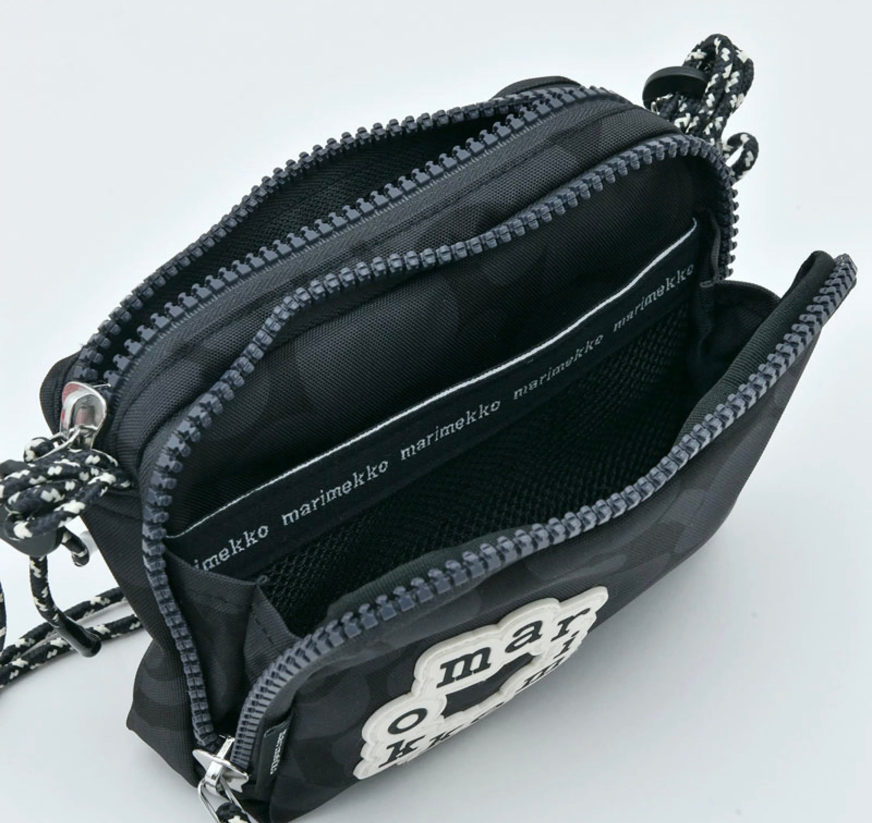 すっきりとしたスクエアシルエットのショルダーバッグが登場。2つの異なるコンパートメントを備え、前面コンパートメントの内側にはメッシュポケットを配置。コンパクトながら収納力が優れたデザイン。コード製のショルダーストラップは取り外し可能で、ストッパーで長さ調節が可能。フロントにはmarimkekko ロゴの円形ワッペン付き。