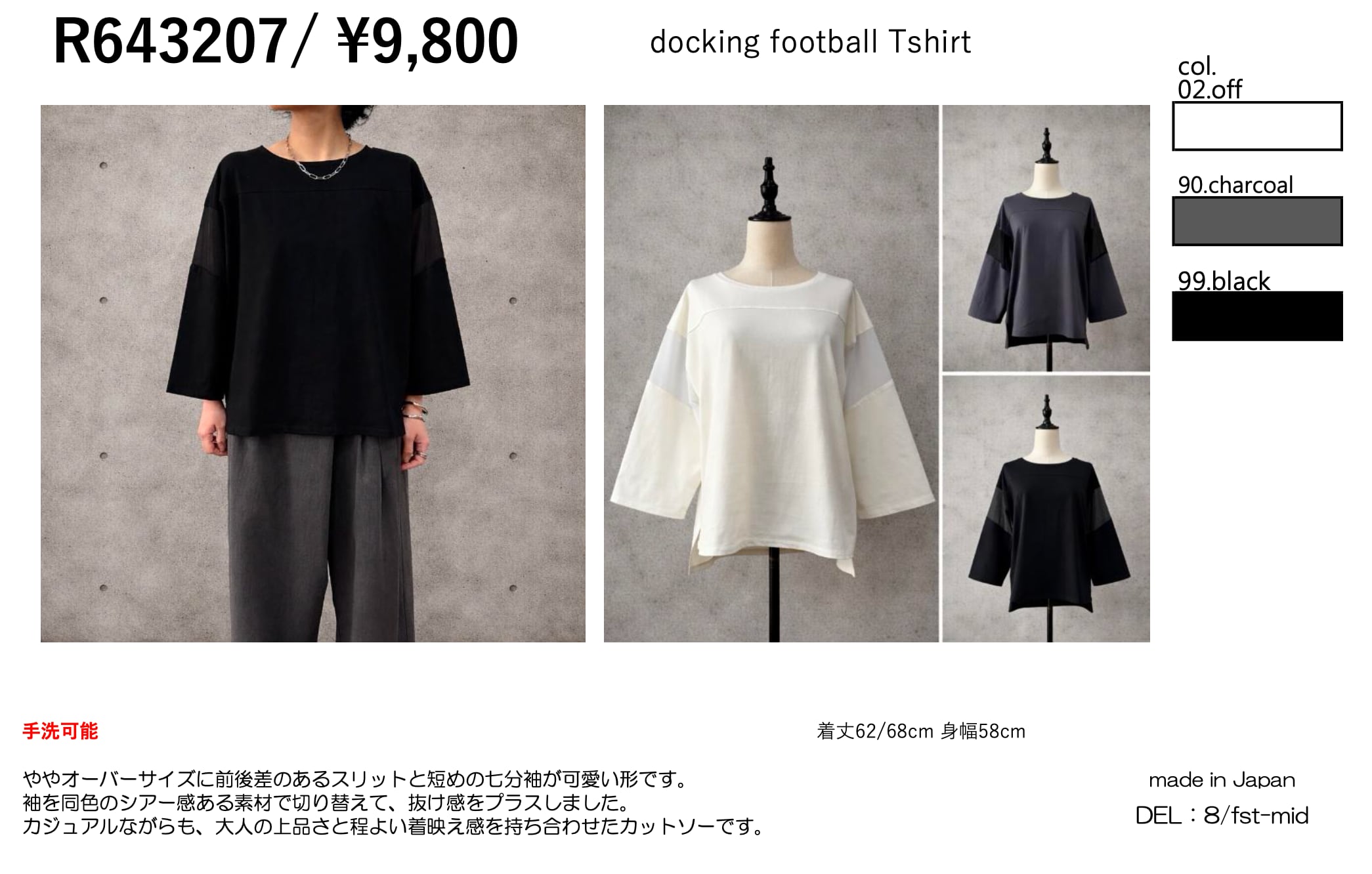 ややオーバーサイズに前後差のあるスリットと短めの七分袖が可愛い形です。
