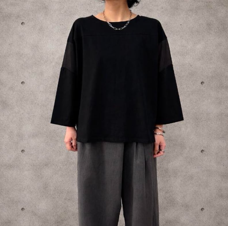 袖を同色のシアー感ある素材で切り替えて、抜け感をプラスしました。