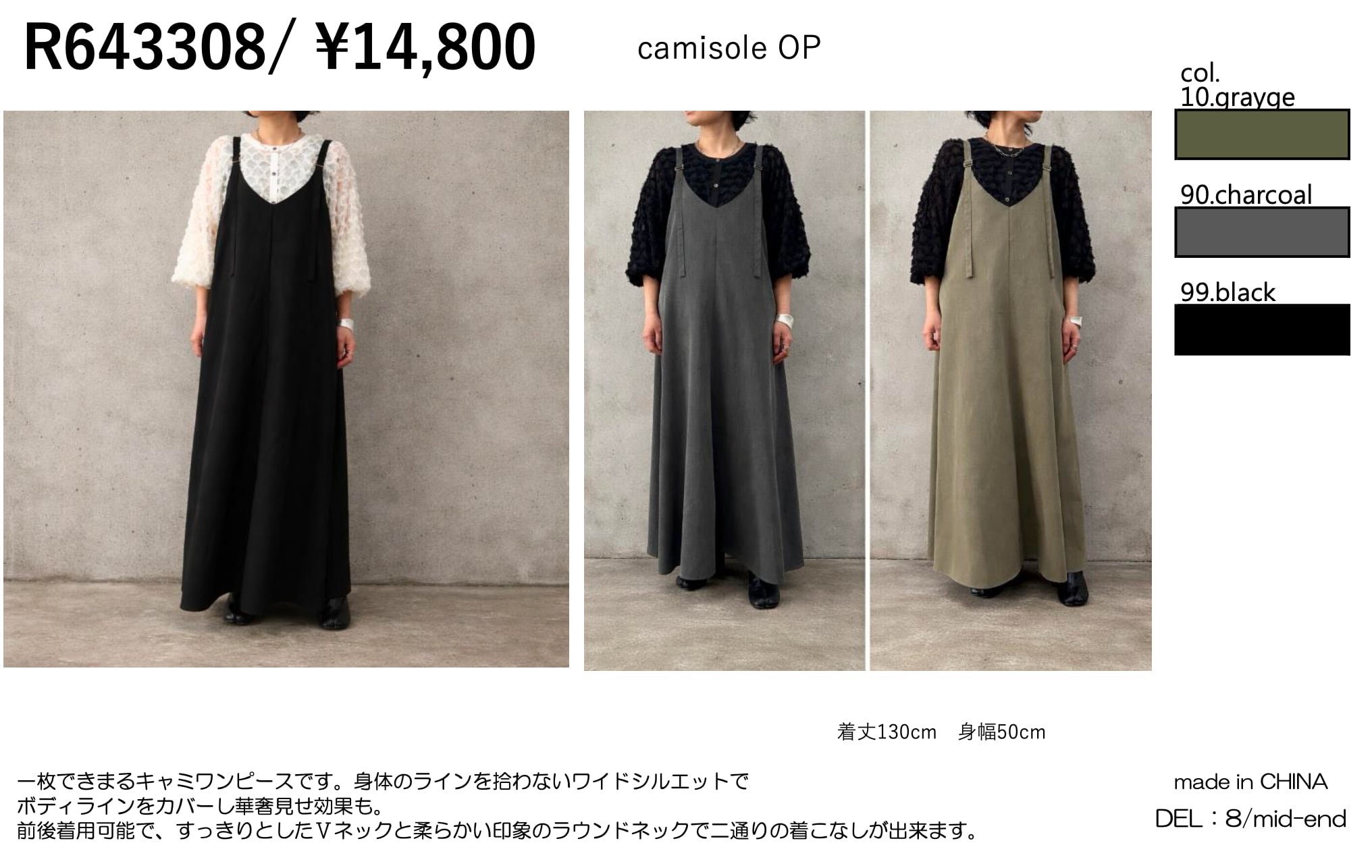 一枚できまるキャミワンピースです。身体のラインを拾わないワイドシルエットでボディラインをカバーし華奢見せ効果も。