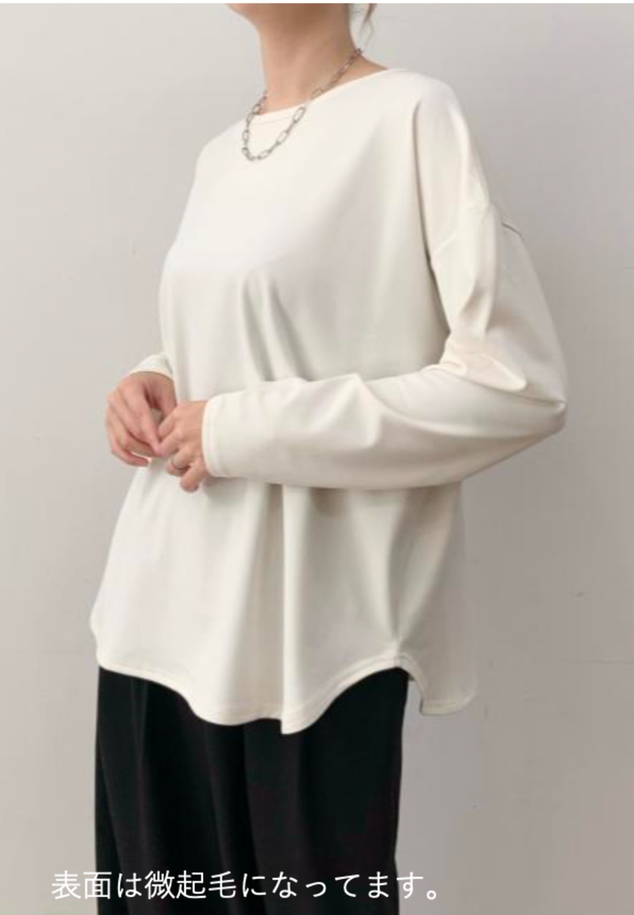 使い勝手の良いシンプルなデザインで、ゆったりとしたサイズ感のクルーネックトップス。
