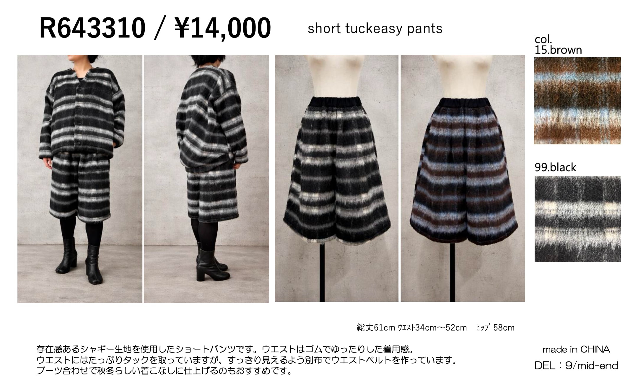 存在感あるシャギー生地を使用したショートパンツです。ウエストはゴムでゆったりした着用感。
