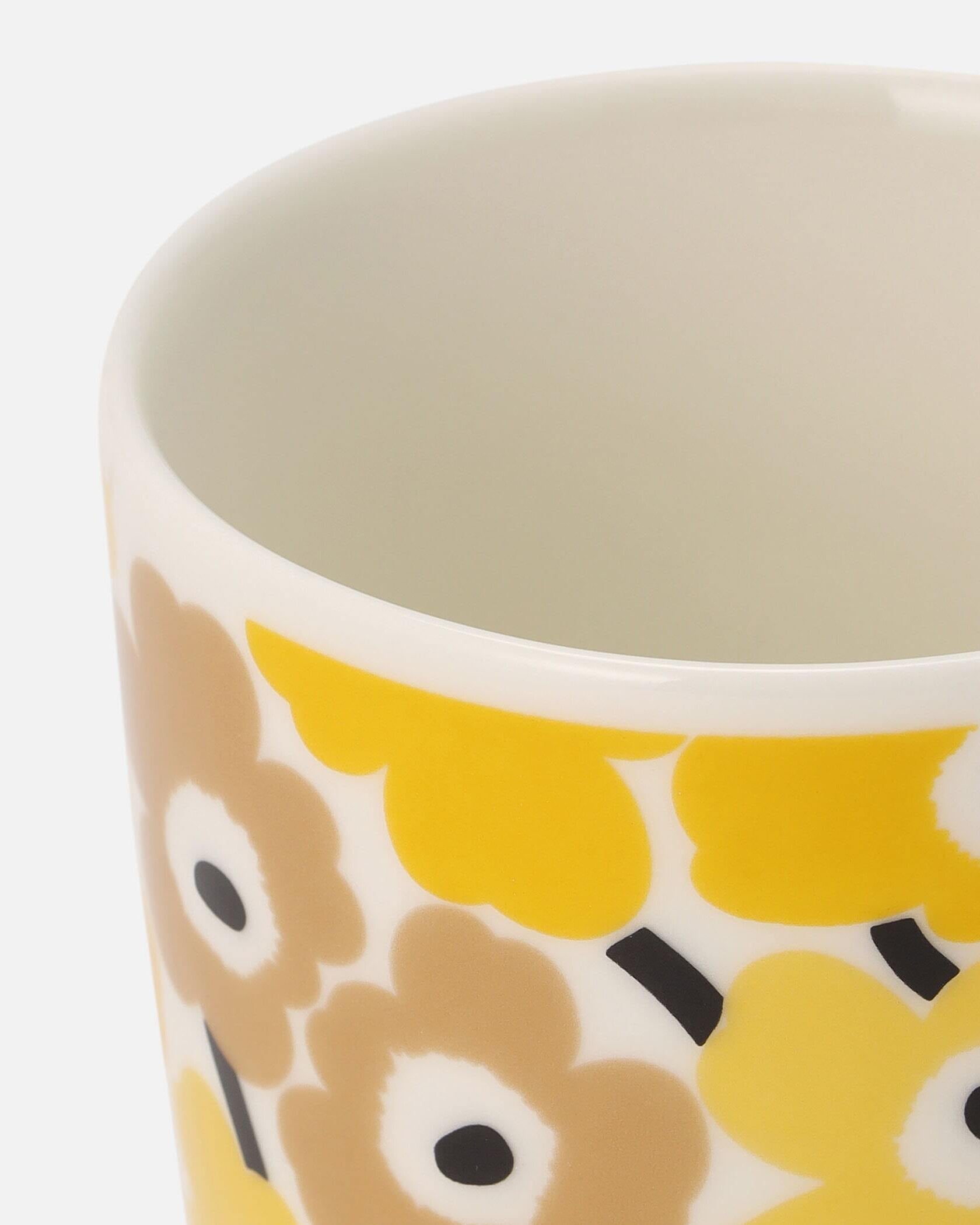 ハンドルのない、どこか素朴な表情が魅力のコーヒーカップセットです。テーブルコーデやカフェタイムを華やかに彩る鮮やかなUnikko柄を採用。