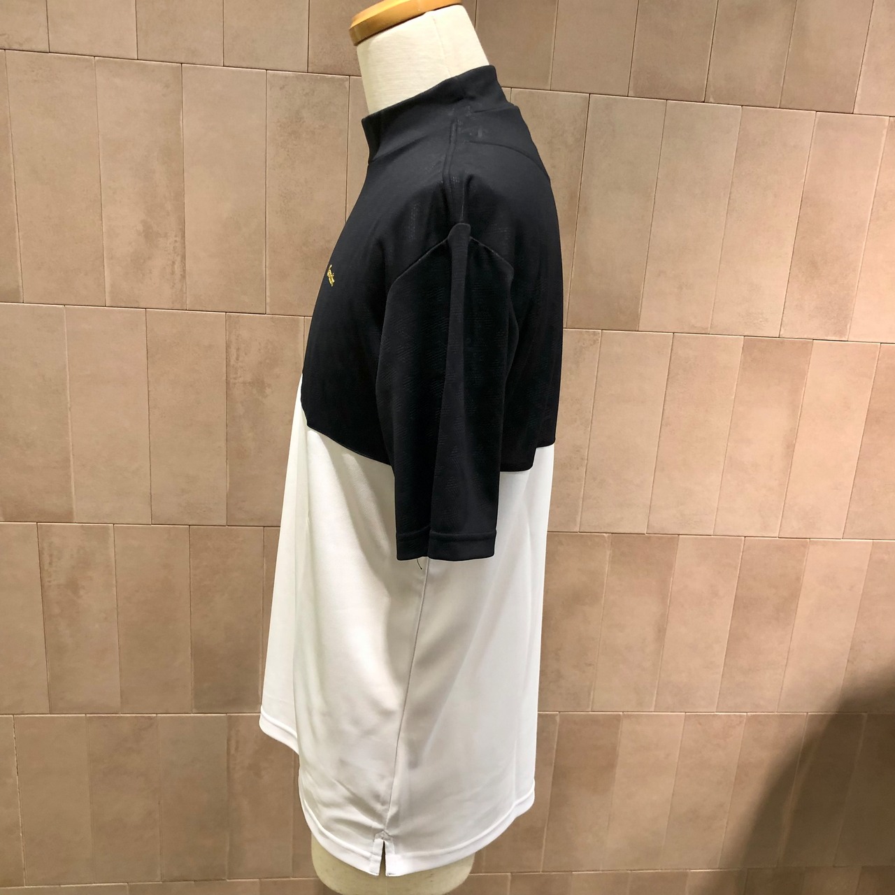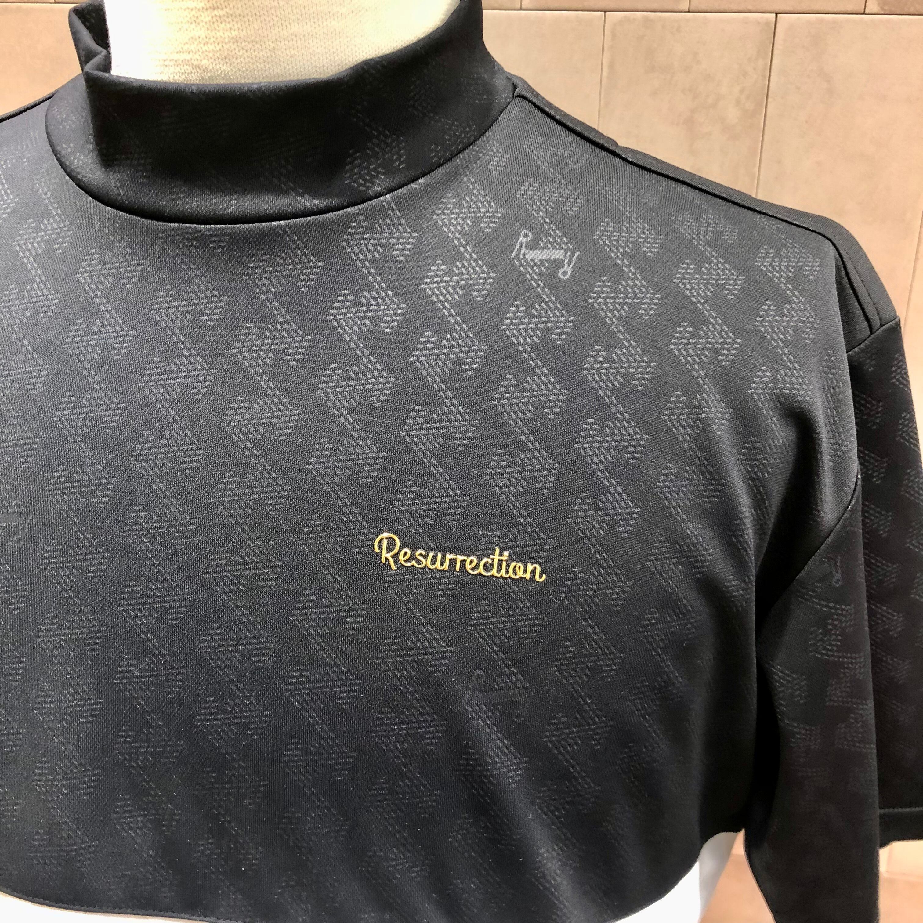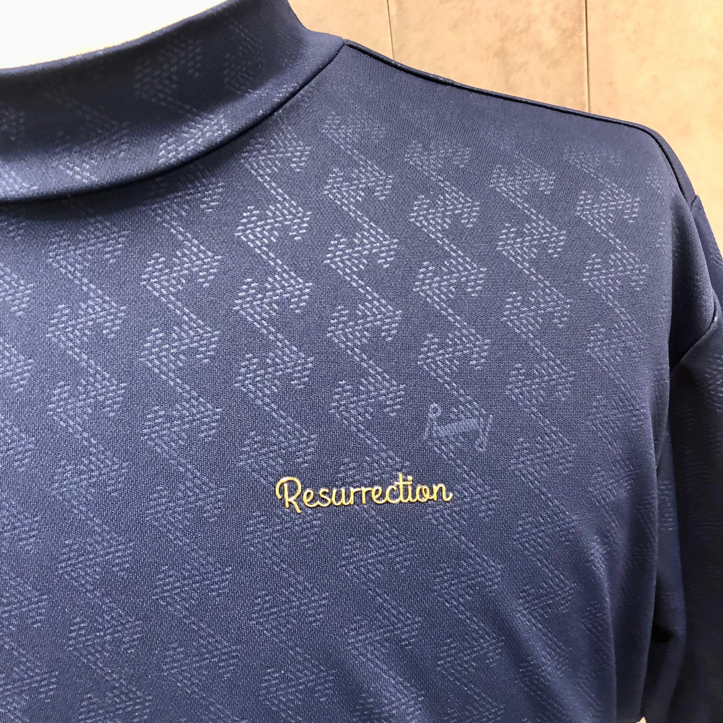 胸元でエンボス加工を施したレザレクションの幾何学模様と無地の生地を上下に大胆に切り替えることで、見た目にも印象的なバイカラーのモックネック。左胸には立体感のあるゴールドのブランドロゴがより一層デザインを引き締めてくれます。