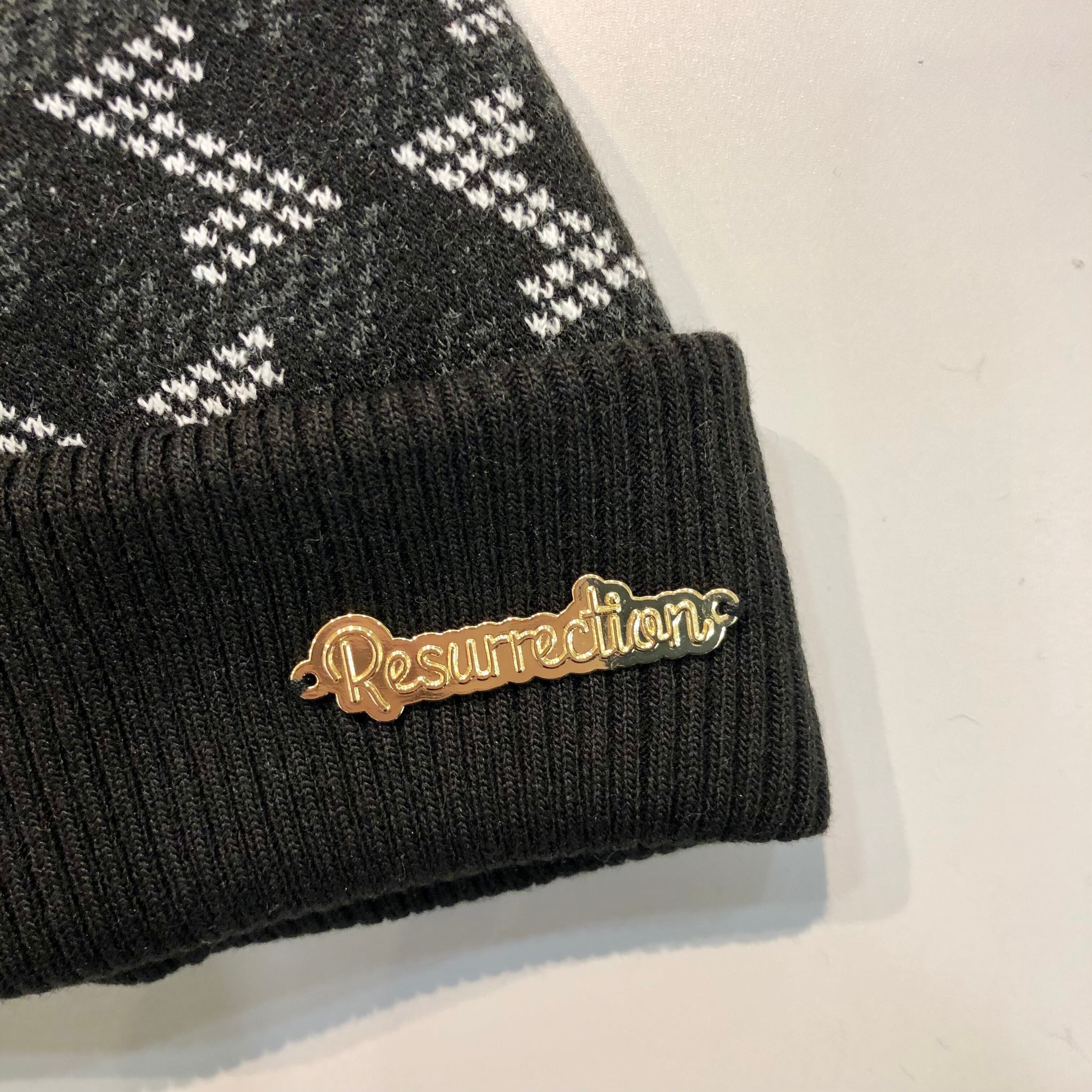一目でレザレクションと分かる、幾何学模様をあしらったデザイン。ブランドロゴはオリジナルの金属プレートを採用。キラッと光る高級感は金属ならでは。シンプルなコーディネートだけでなくレザレクション柄のウェアとも相性が良く、汎用性の高いアイテムです。