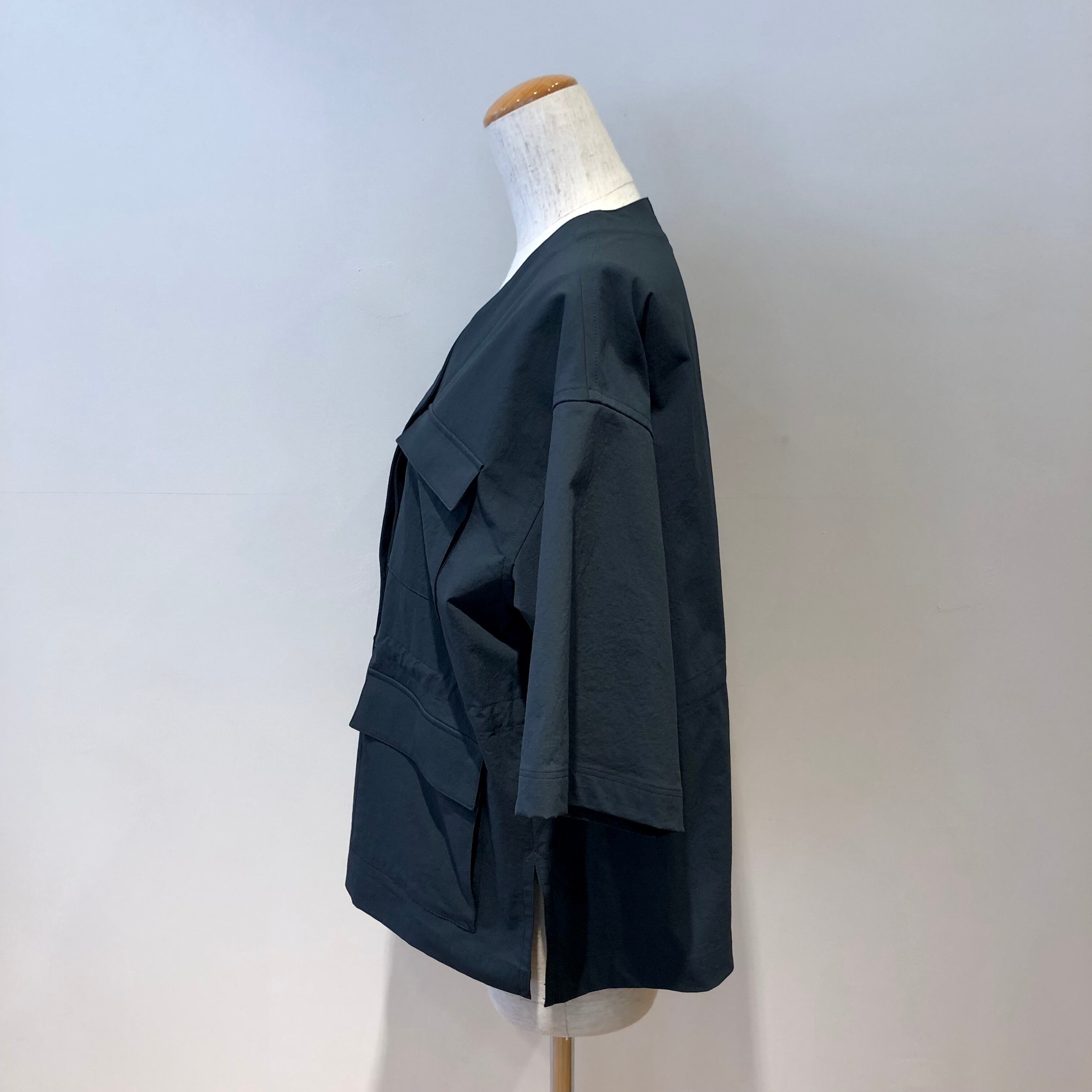 女性らしく着こなせる、Vネックのサファリ風ノーカラージャケット。