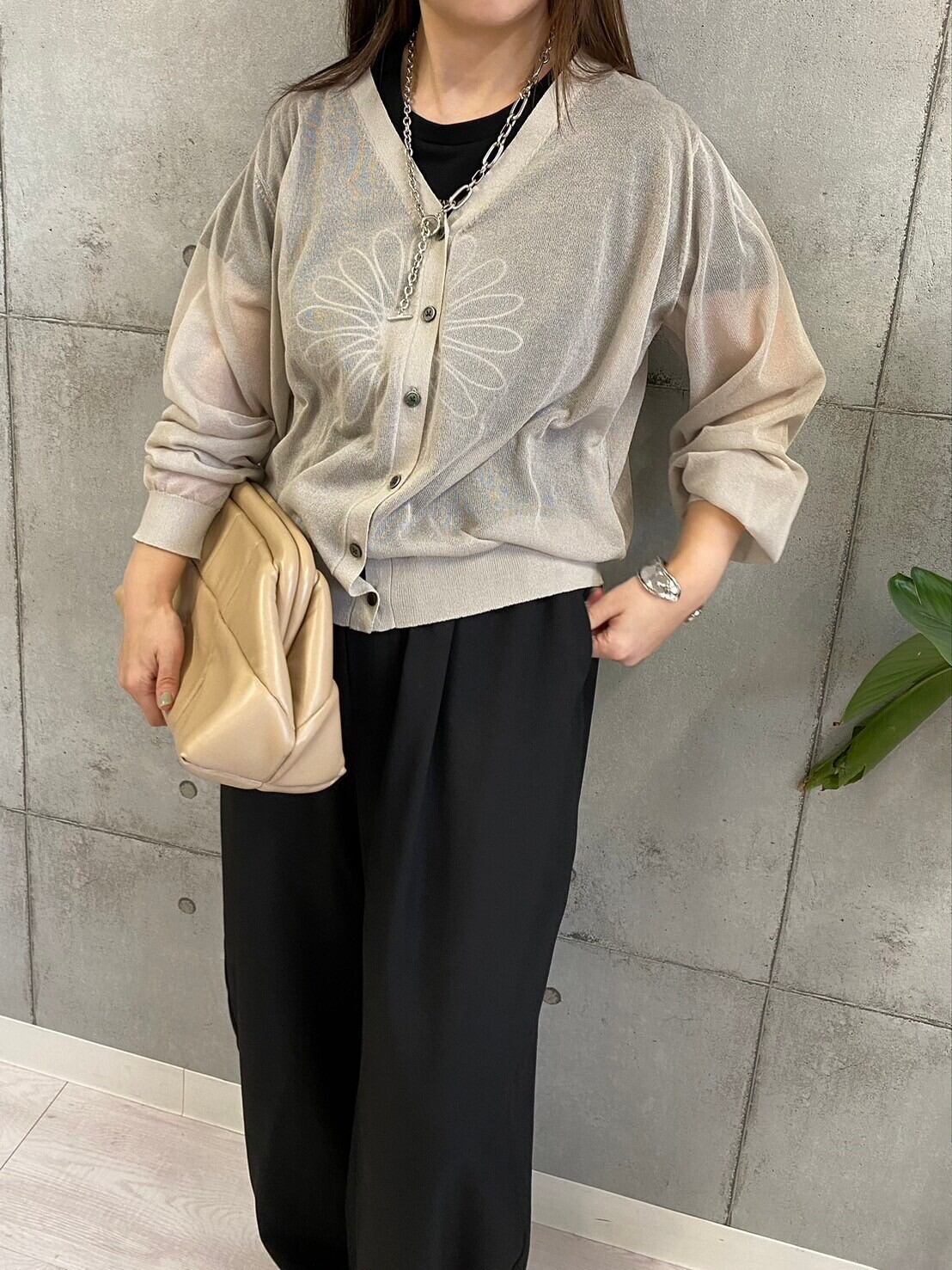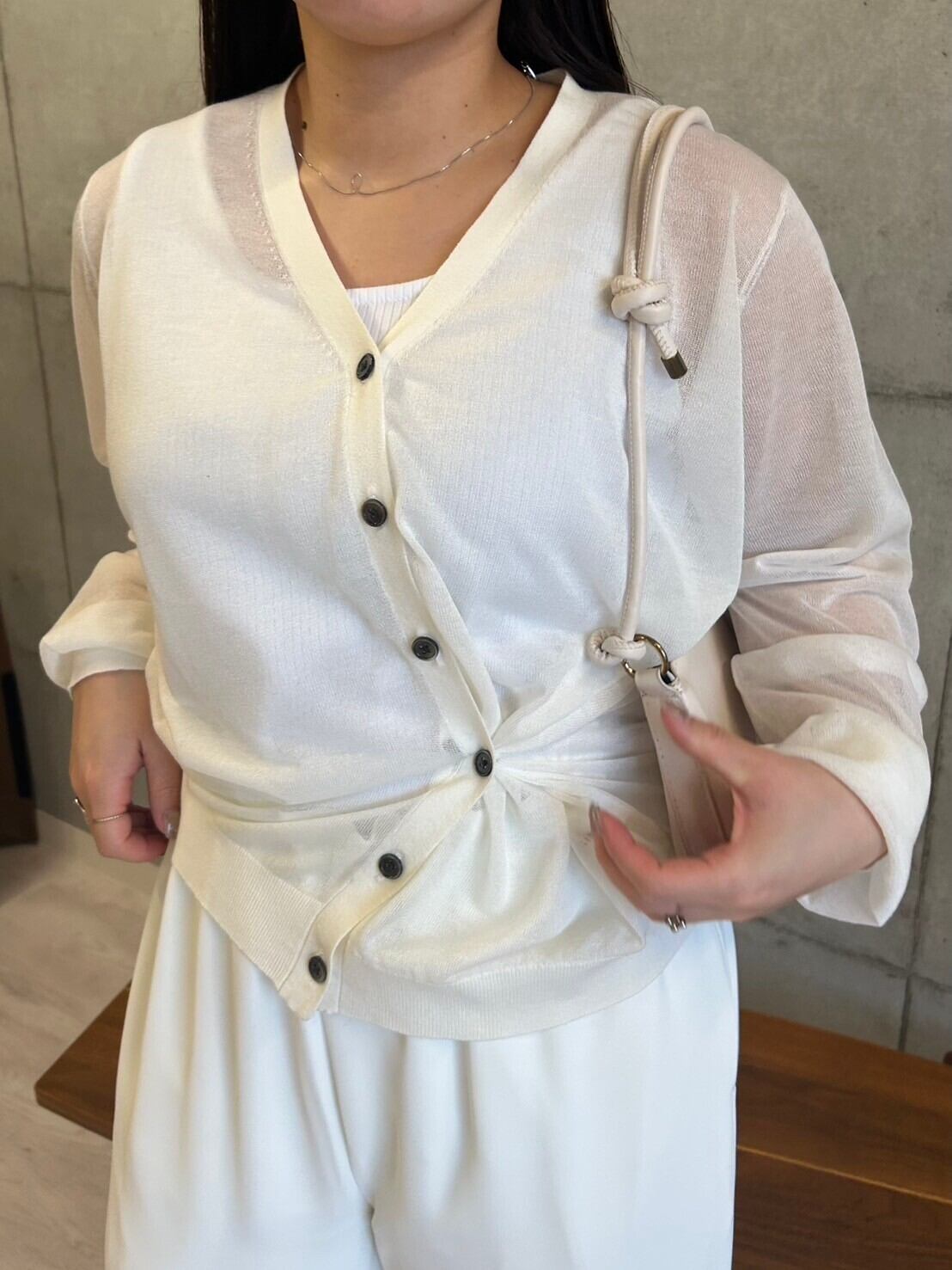 ドライタッチのシアーカーディガン。羽織でも1枚でも、さらに上から4番目のボタンを腰についているボタンととめるとカシュクール風になりウエストマークされるシルエットにもなります。真夏の羽織りにまで使えるロングシーズン重宝するアイテムです。手洗いでのケア可能。