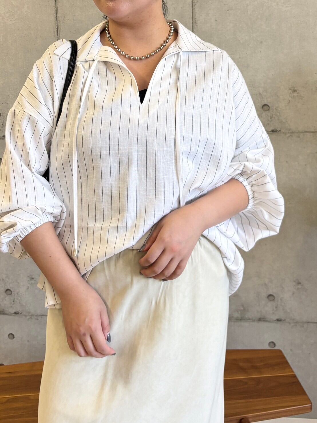 綿麻素材の大人っぽいスキッパーブラウス。程よい衿の開きやシャリ感のある素材がスタイリングに抜け感をプラスしてくれ、ロングシーズン着られる薄手のブラウスは1枚で華やかな印象になります。ゆったりした身幅でINせずにでも着れて体型カバーも◎