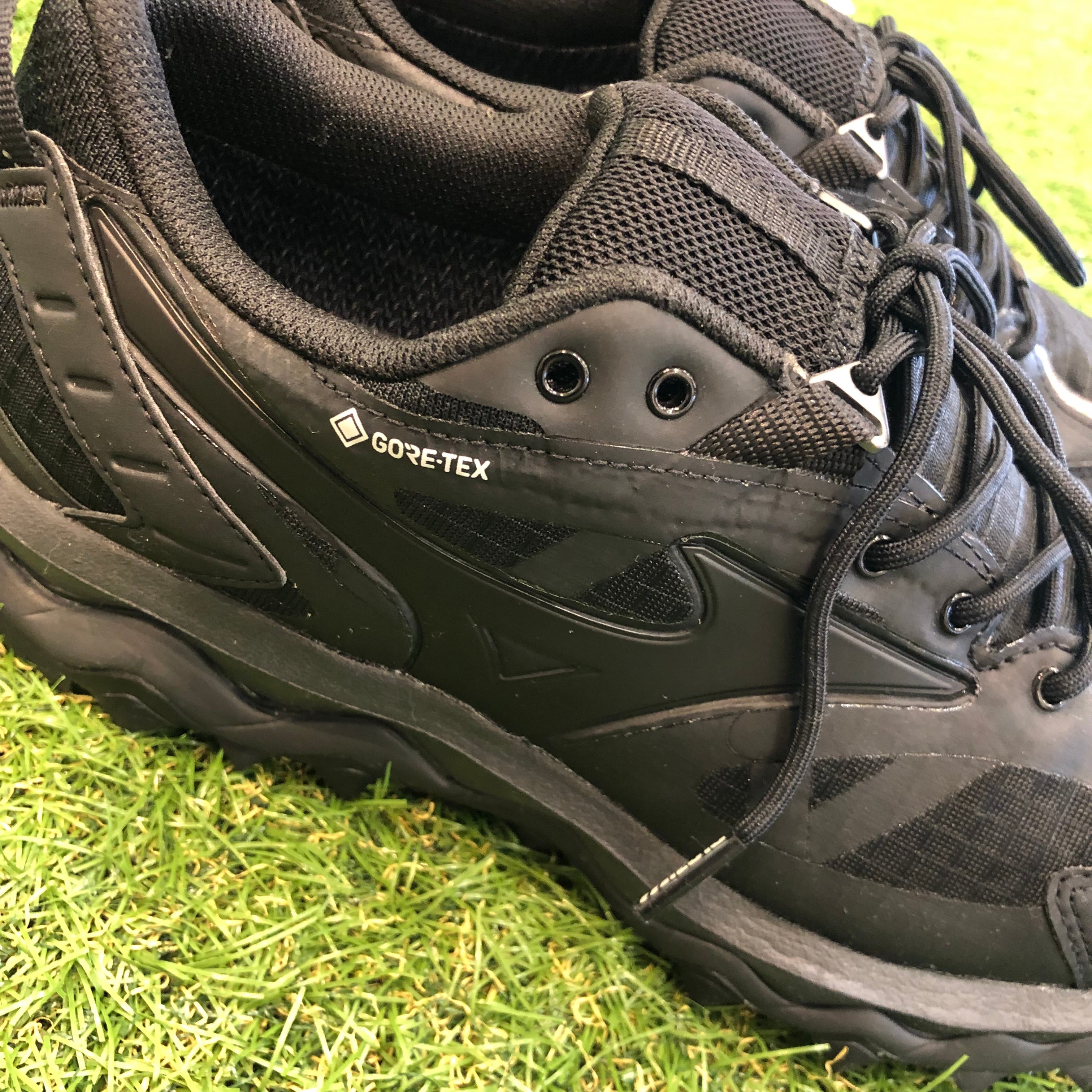 ソールの波型構造により、クッション性と安定性を両立させた「MIZUNOWAVE」と、雨の日も足元を快適にする防水透湿素材「GORE-TEX」ファブリクスを採用。