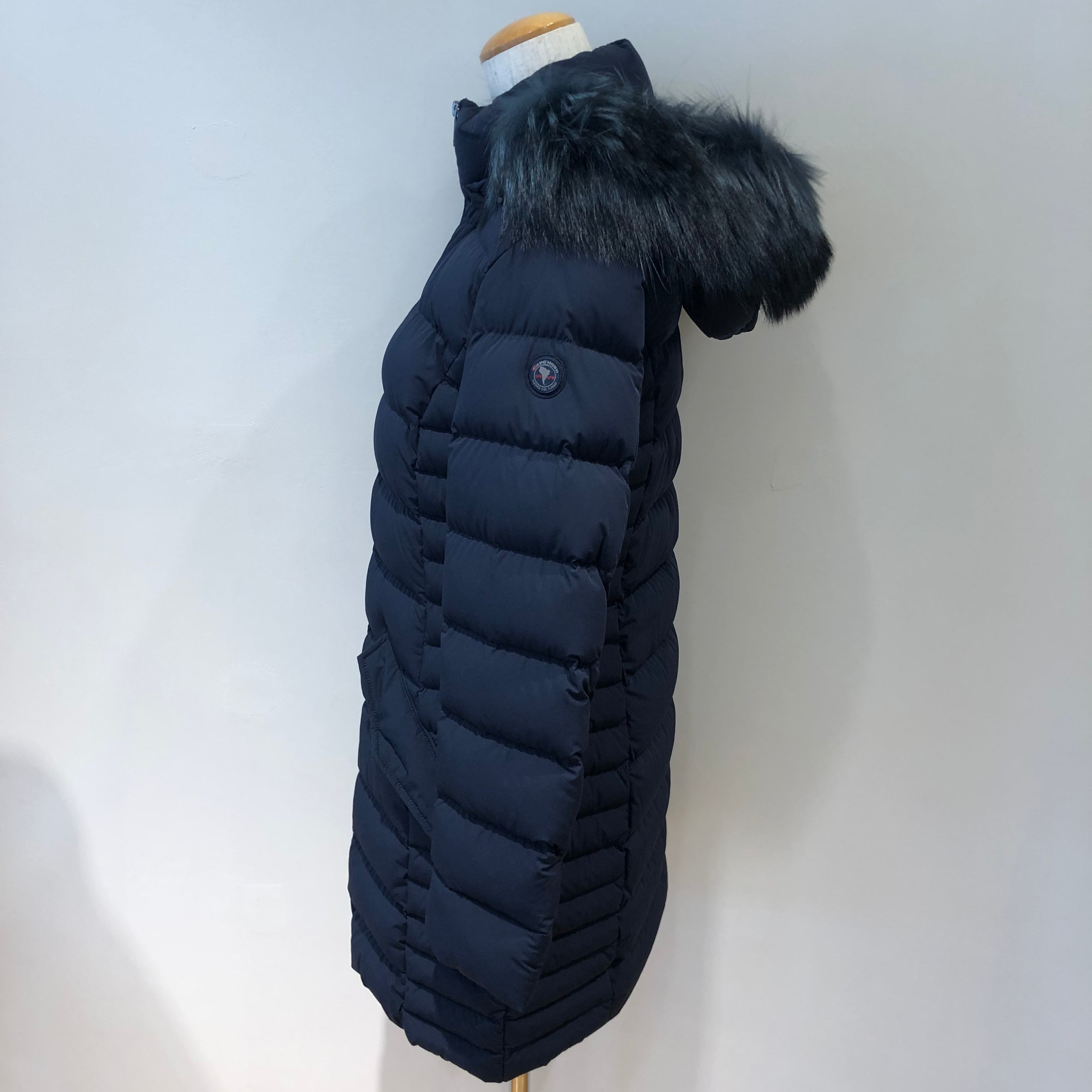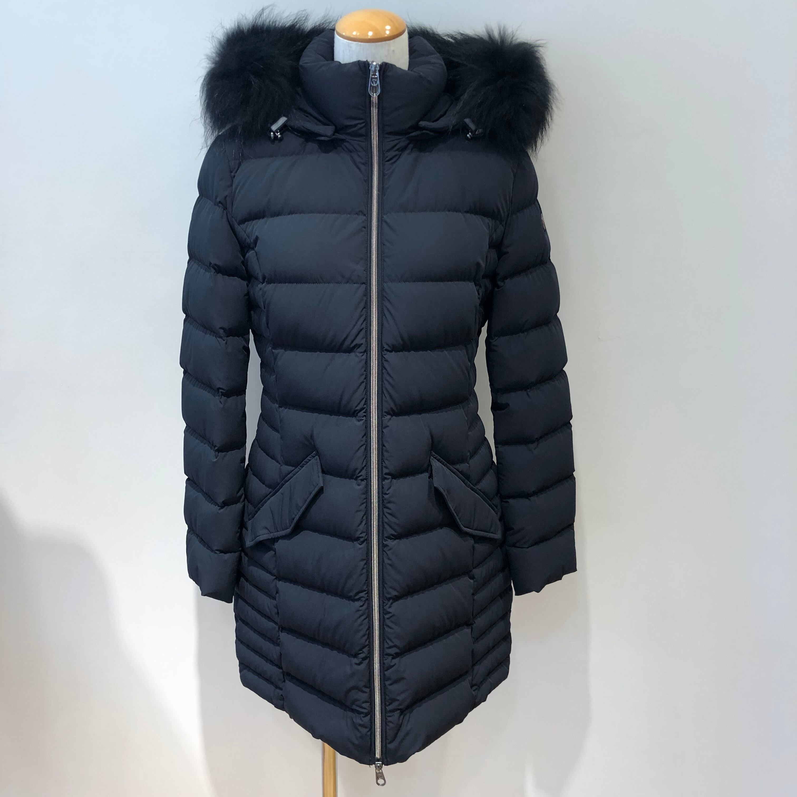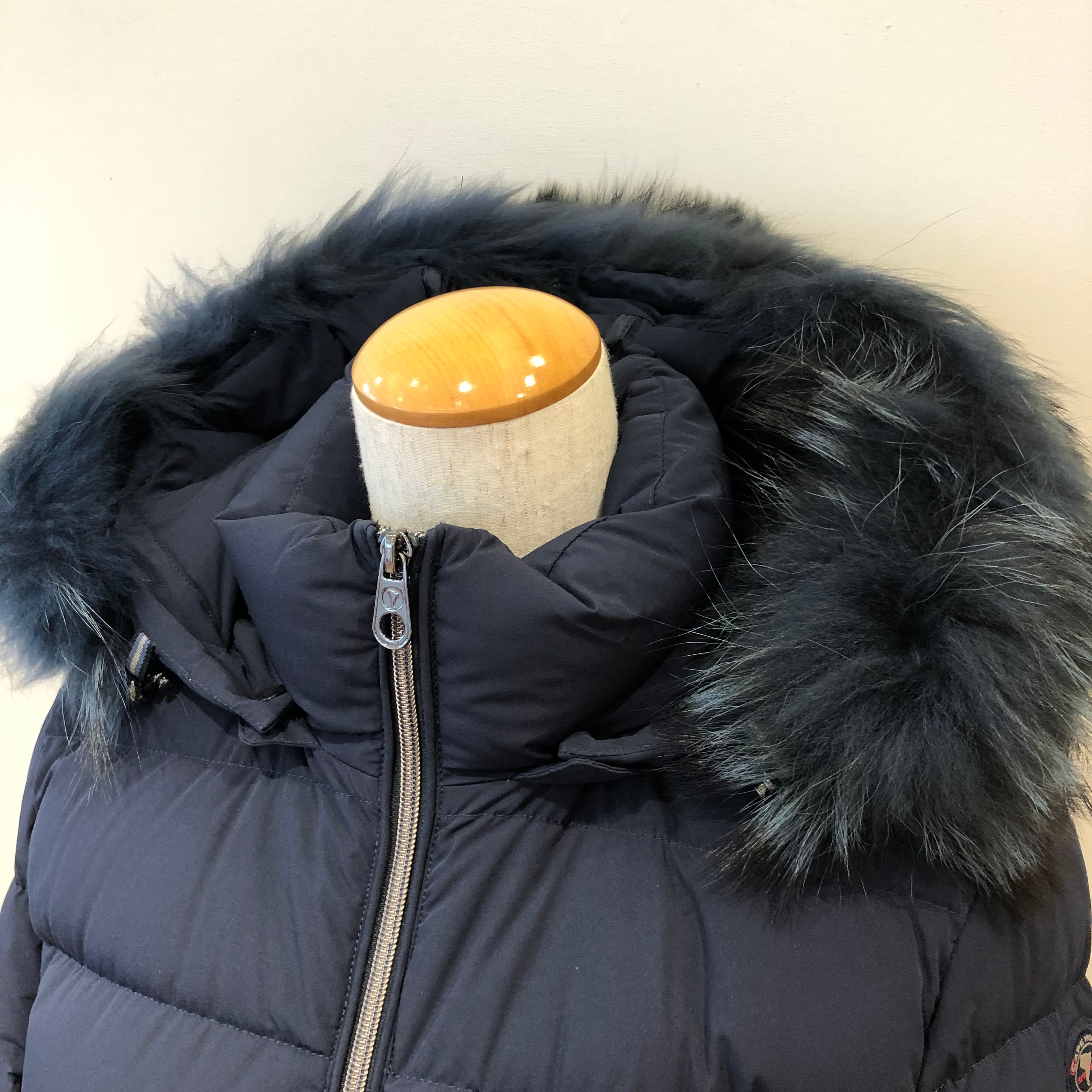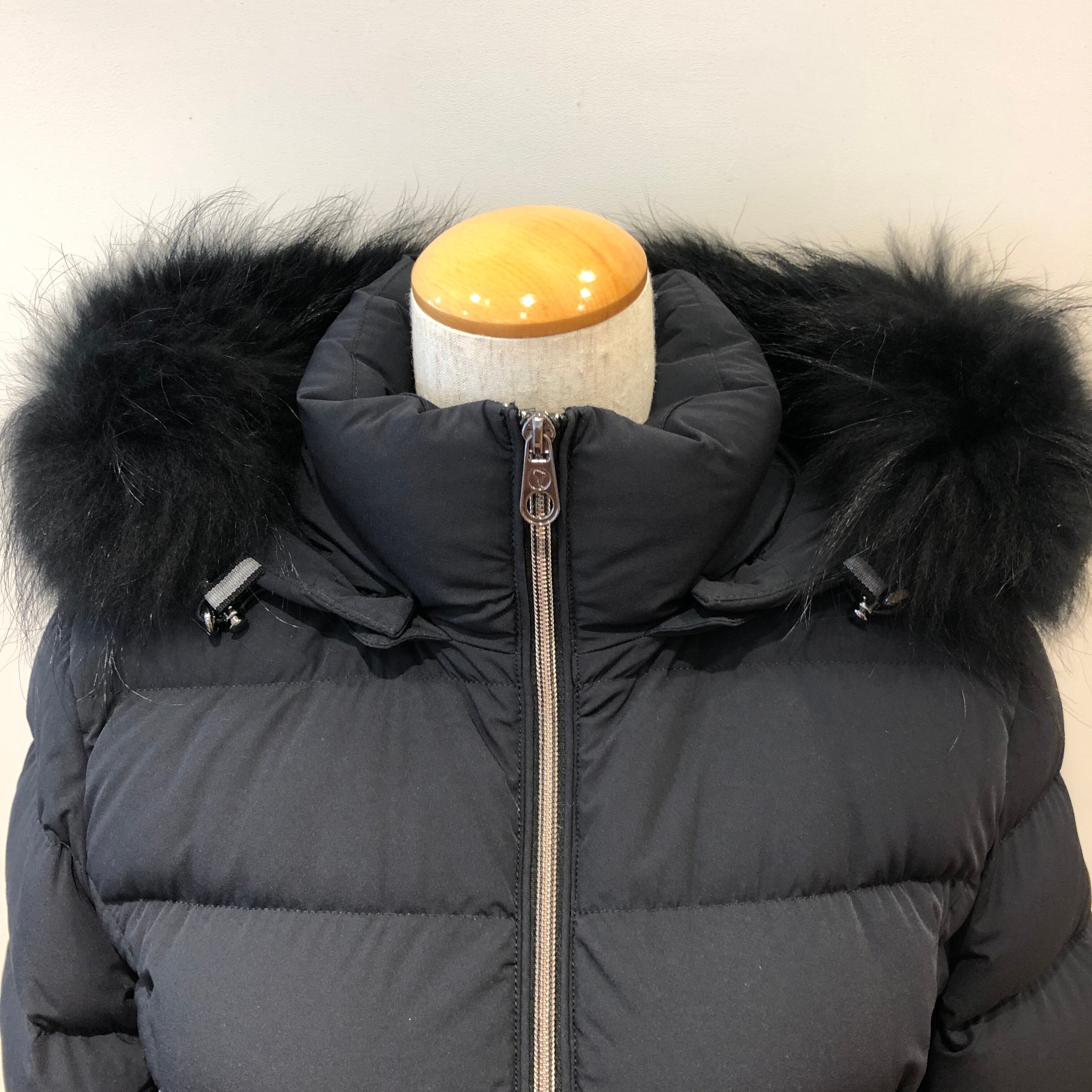 フードについた大ぶりなファーとマットな素材感がエレガントな雰囲気に、左裾にブランドロゴがあしらわれ、ウエストを程よくシェイプさせすっきりとした美しいシルエットのダウンコート。