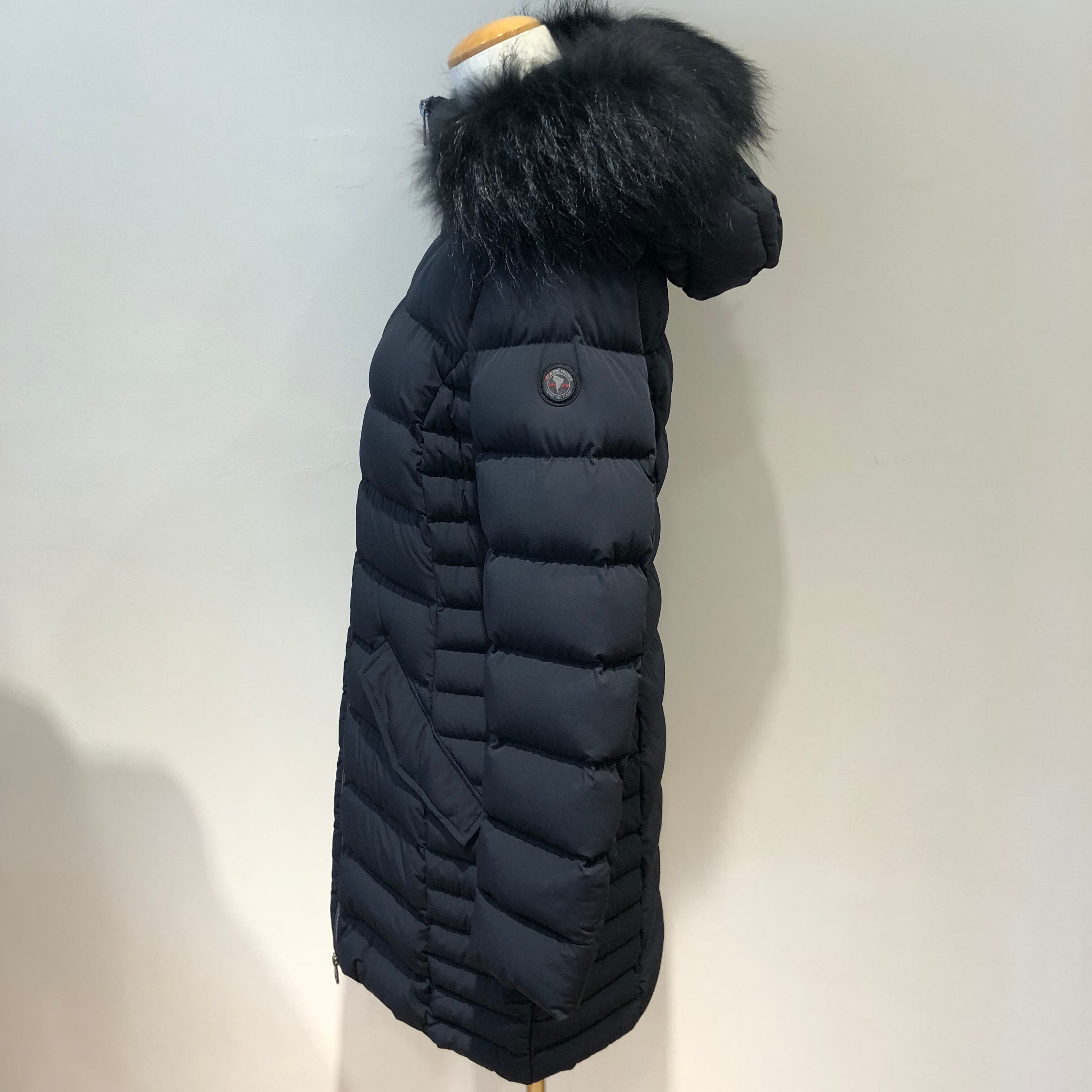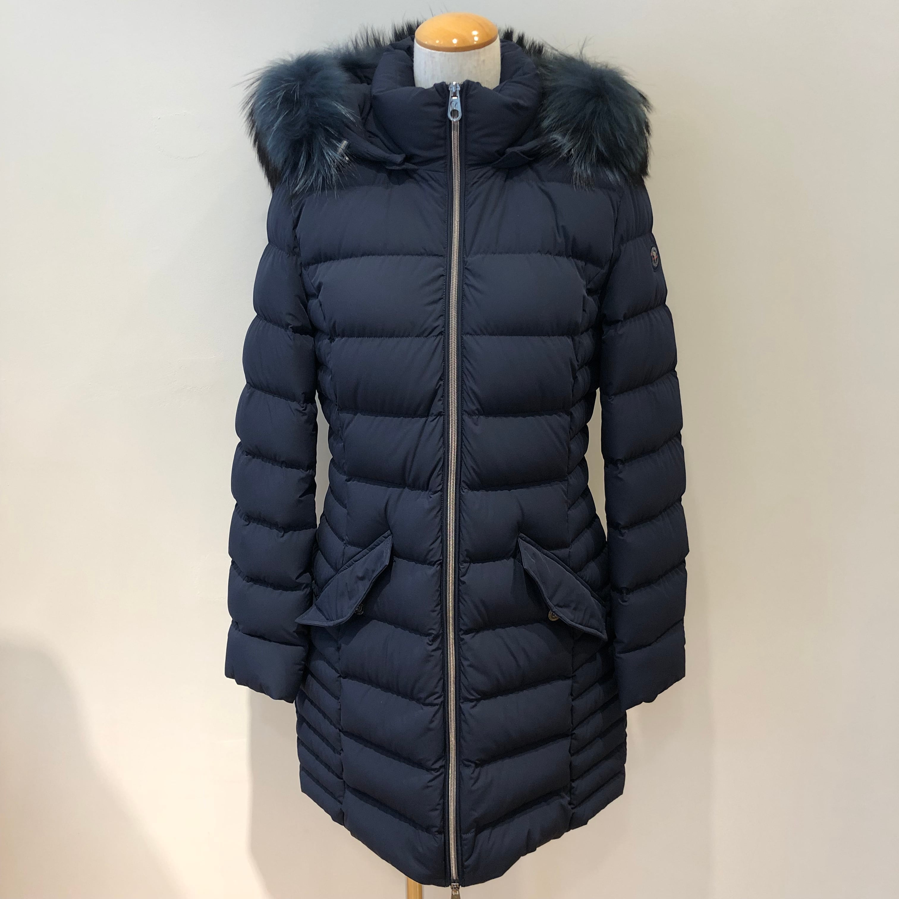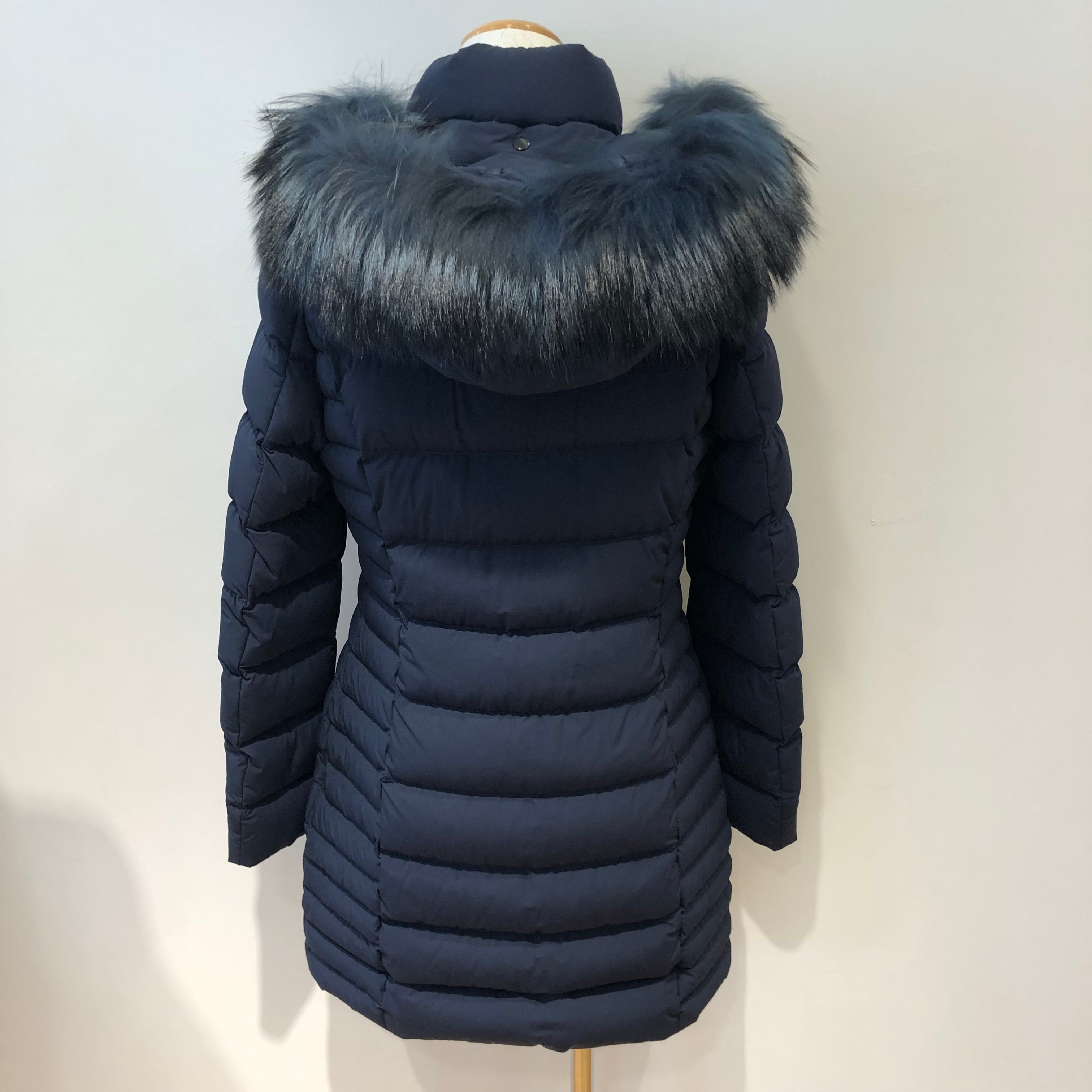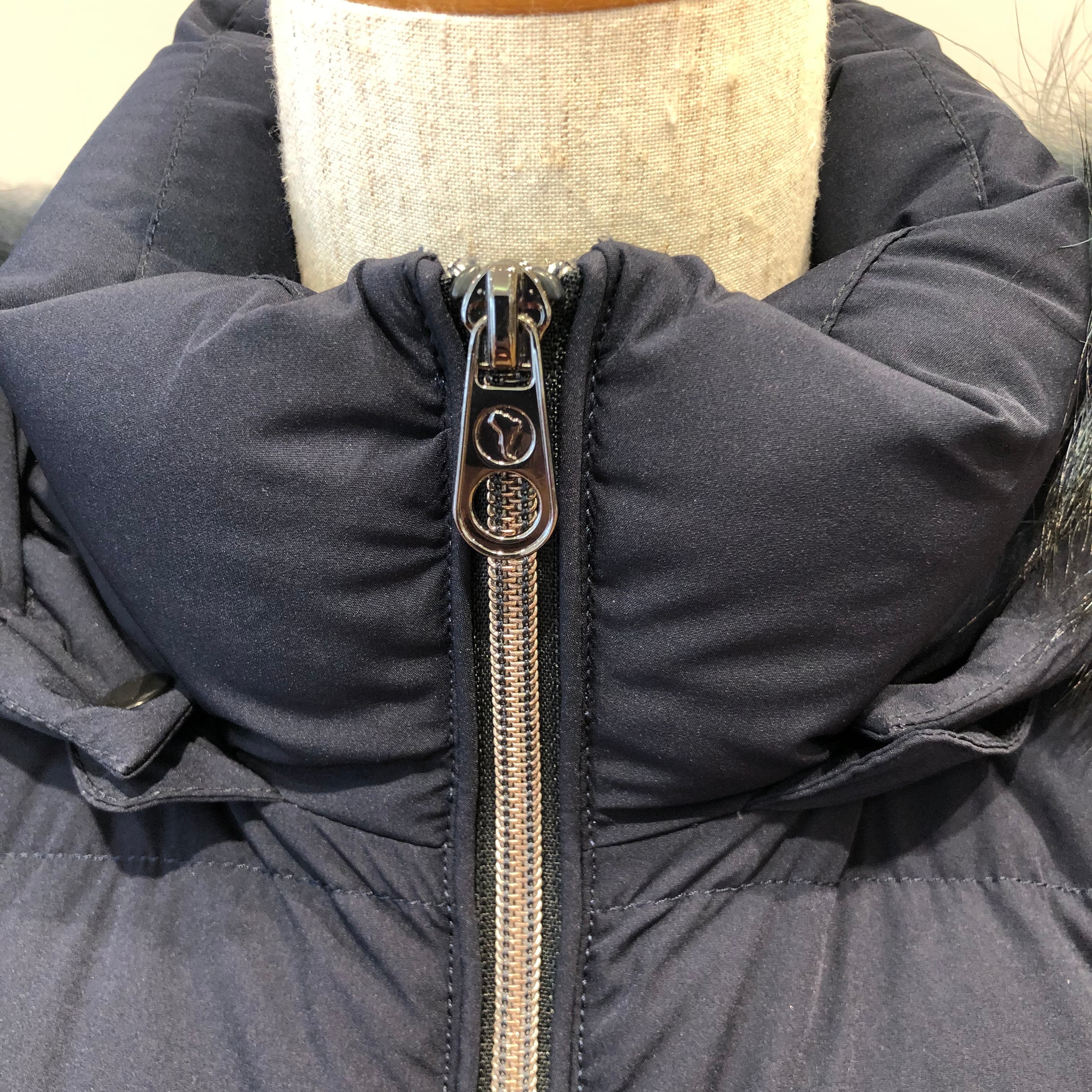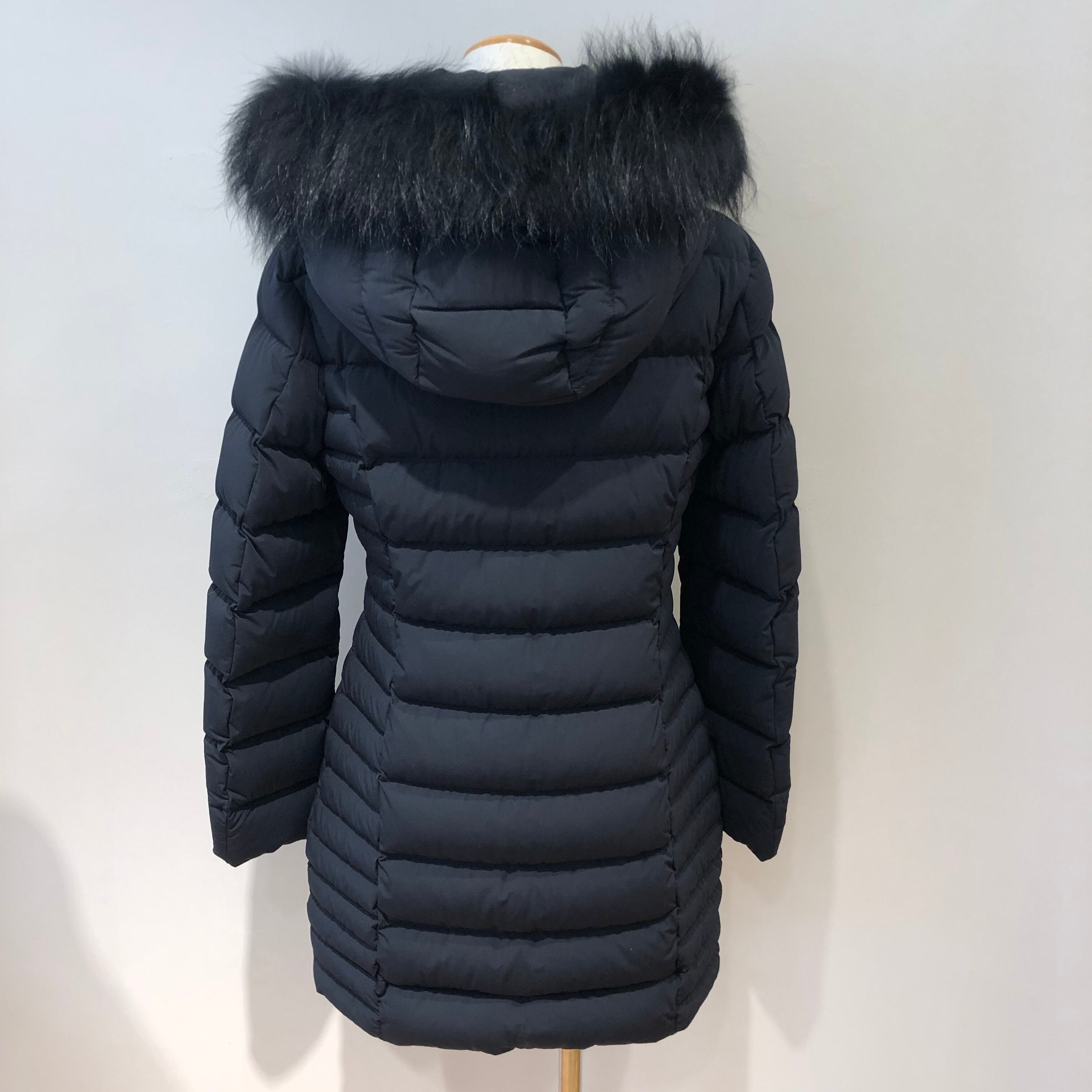 フードについた大ぶりなファーとマットな素材感がエレガントな雰囲気に、左裾にブランドロゴがあしらわれ、ウエストを程よくシェイプさせすっきりとした美しいシルエットのダウンコート。