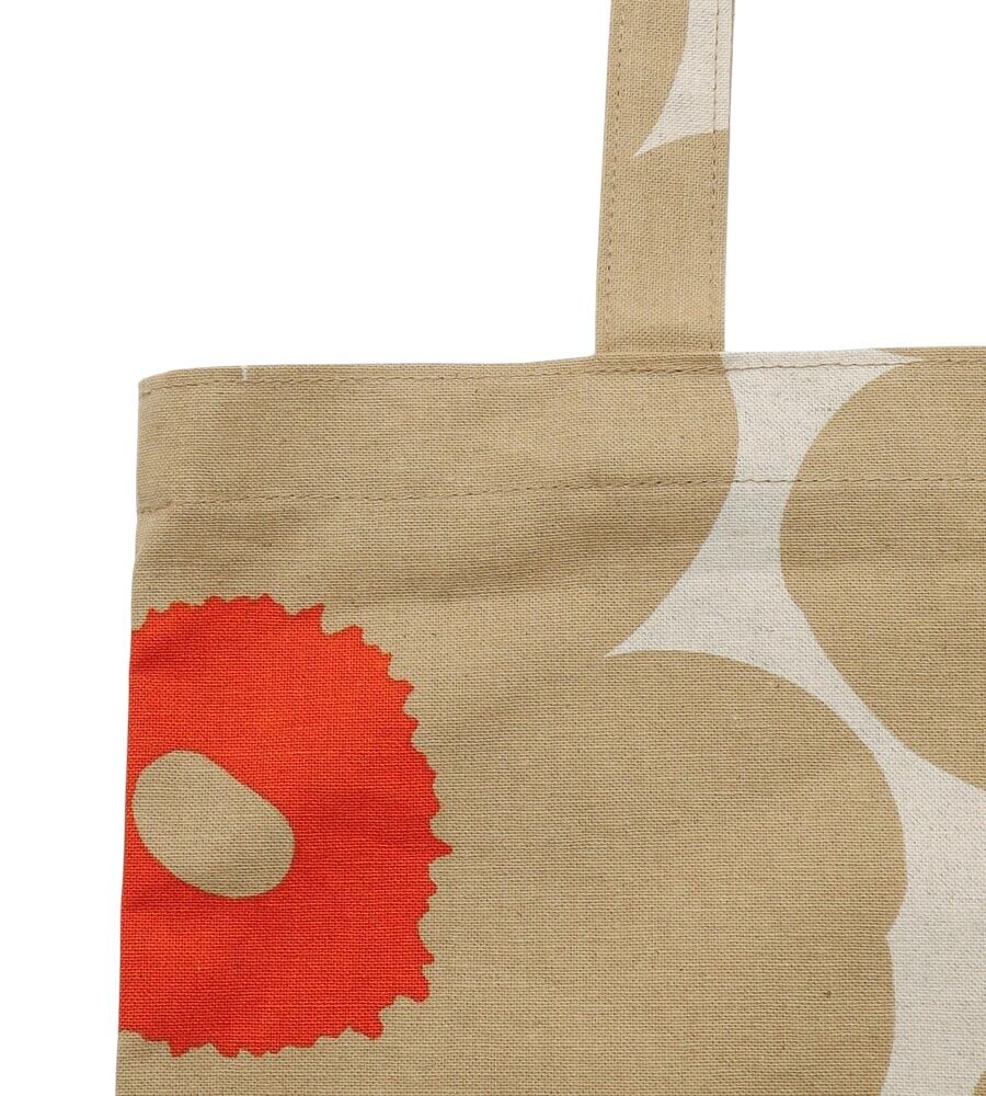 Marimekkoを代表するUnikko柄のファブリックトートバッグ。大きなフラワーモチーフの中心の差し色がデザインアクセント。下部のブランドロゴもスタイリッシュなデザインポイント。シンプルで使いやすいスクエア型。メインバッグ・サイドバックとして、毎日のコーディネートで活躍するアイテムです。