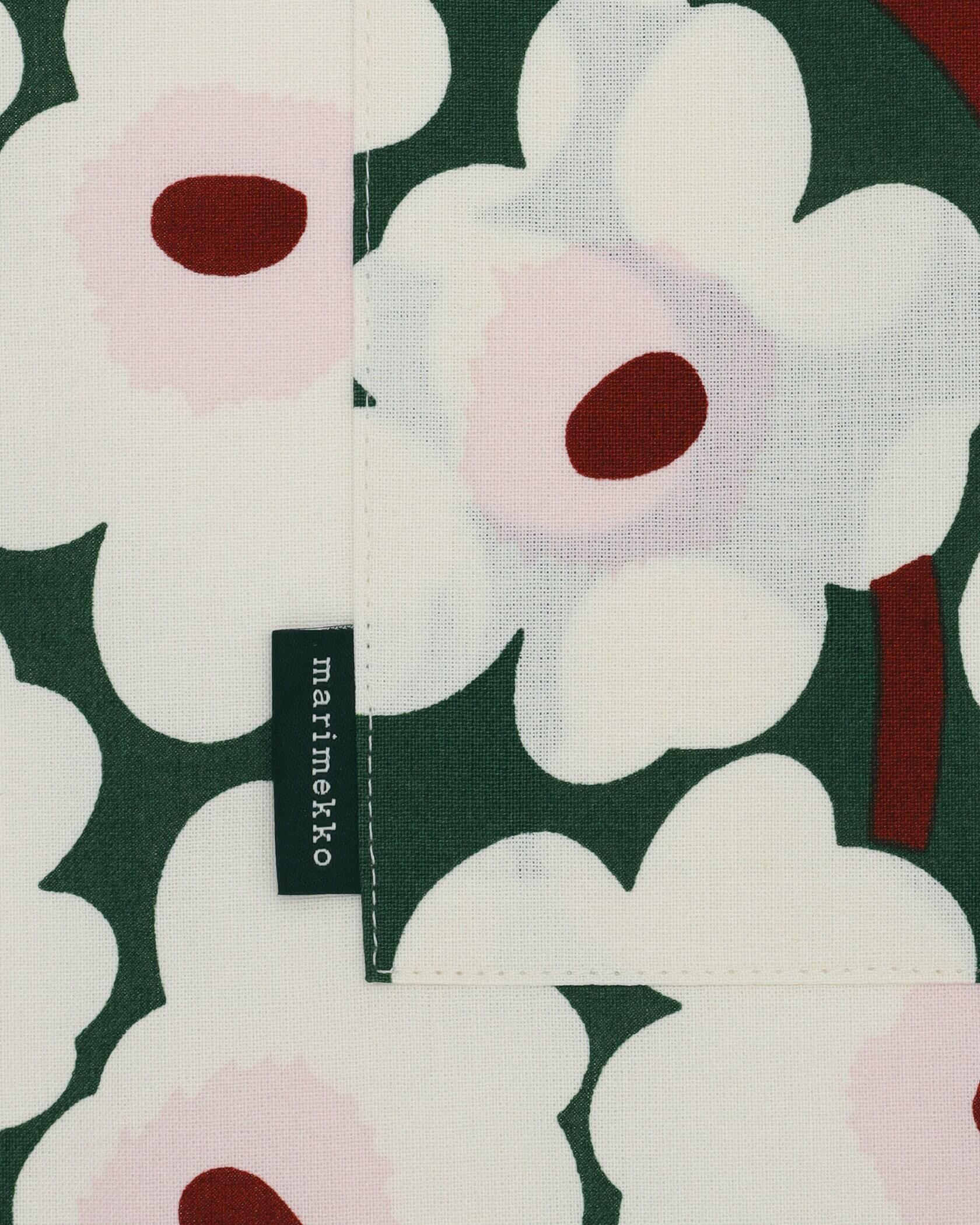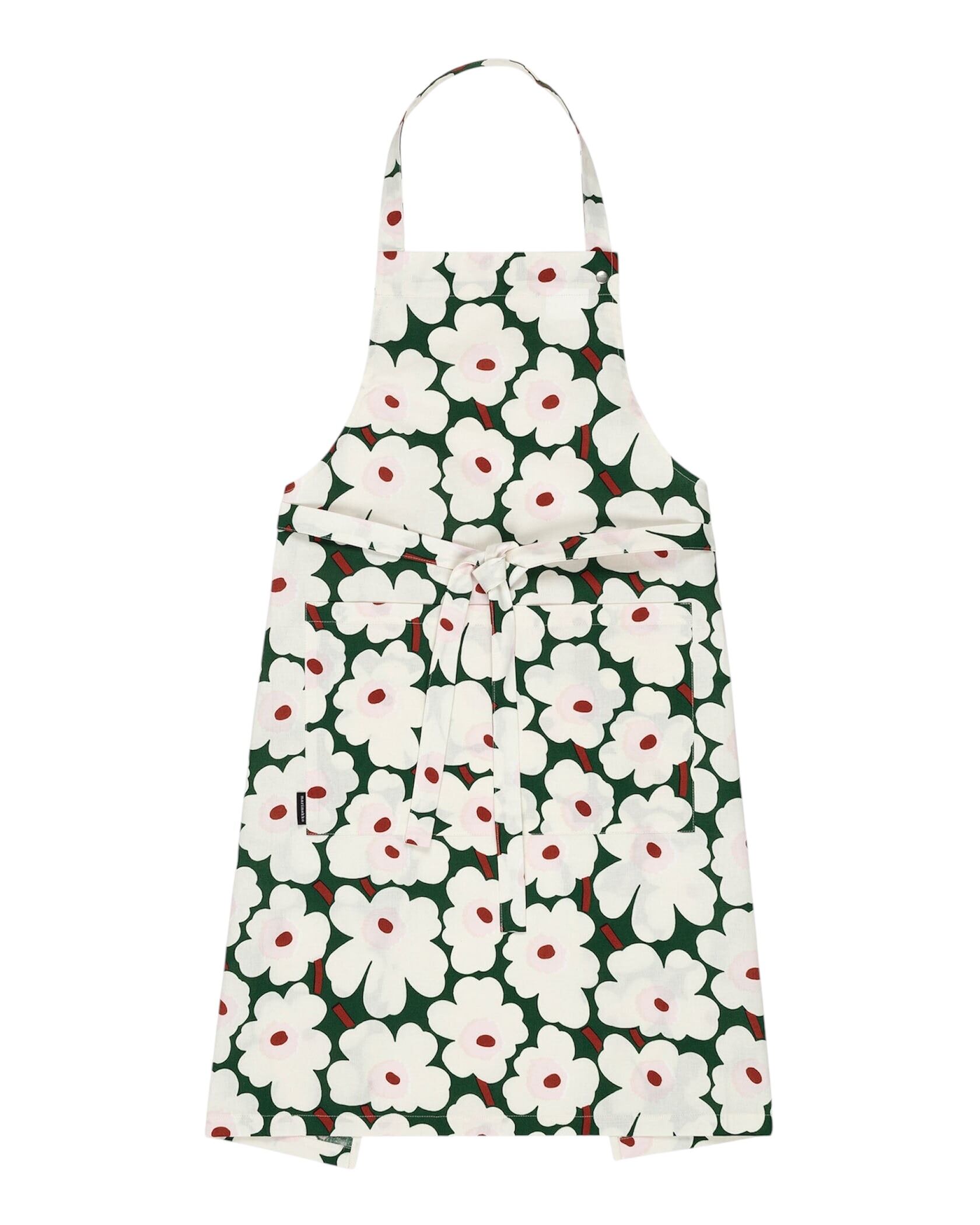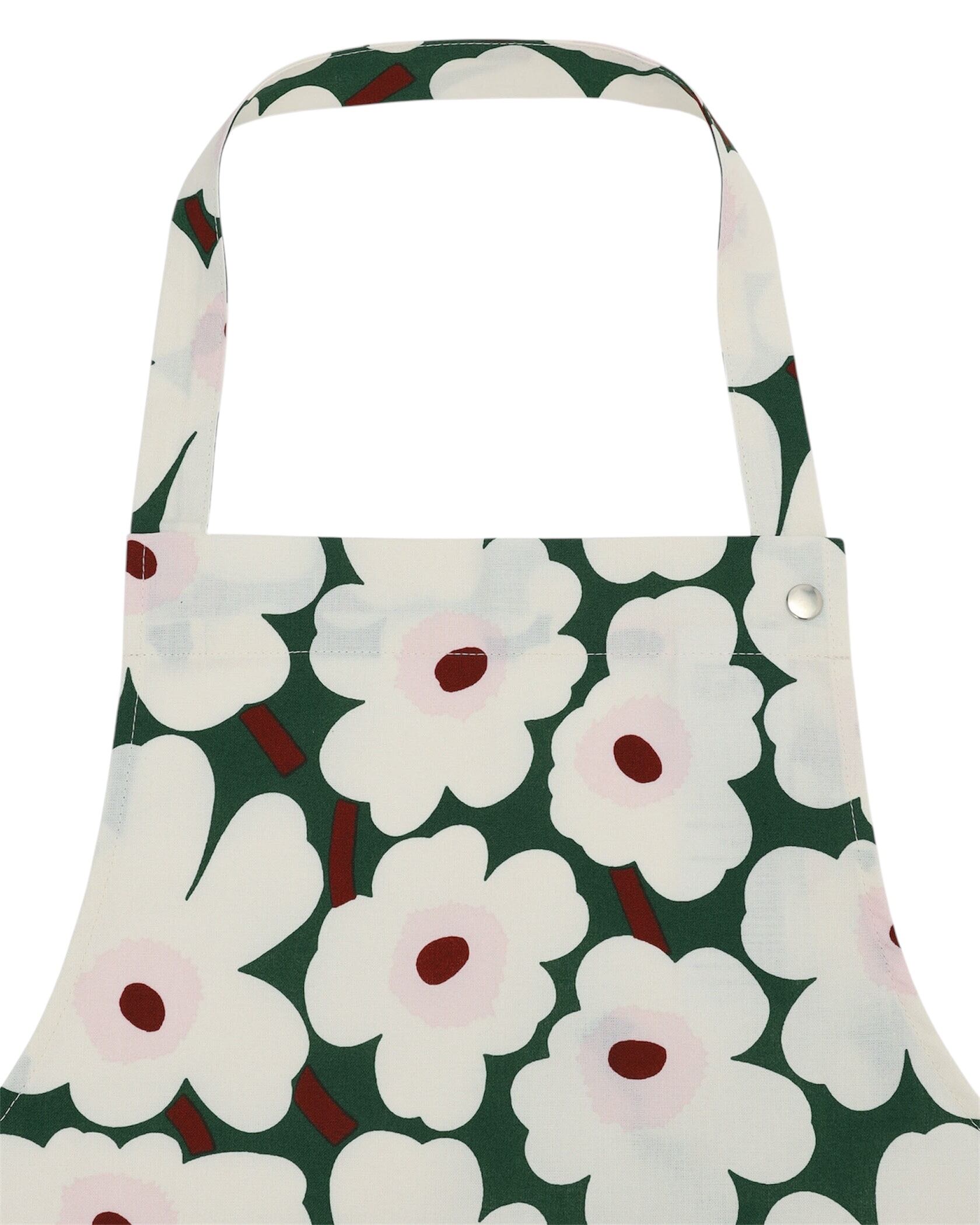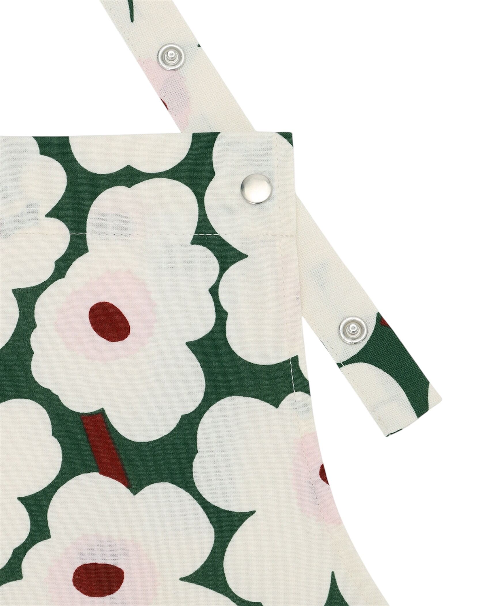 ホワイトとダークグリーンのコントラストが映えるMiniUnikko柄のエプロン。3段階に長さ調節が可能なホルターネック、フロントに大きなポケットを配置した実用的なデザイン。お気に入りのエプロンなら、クッキングタイムがより楽しく充実した時間に。